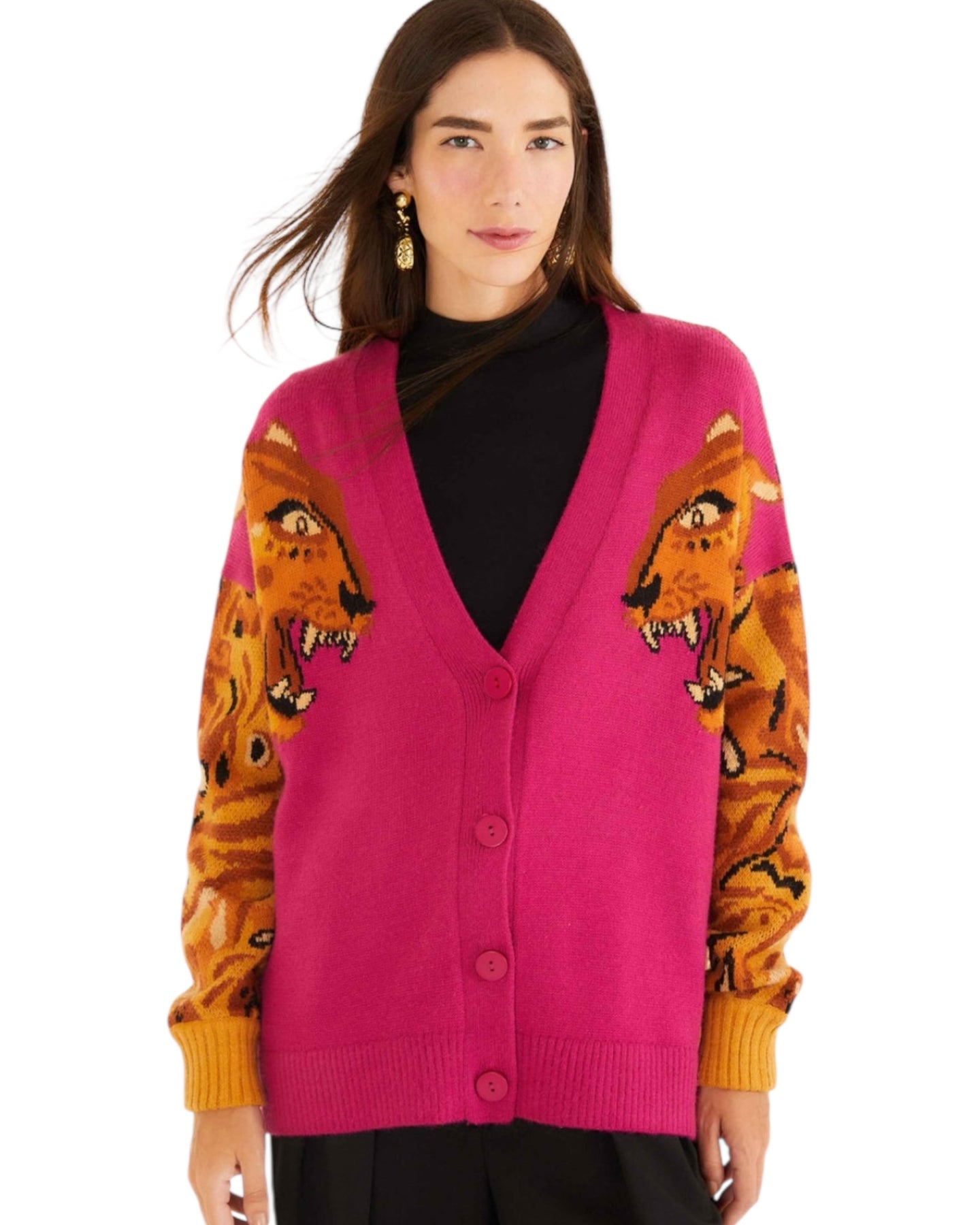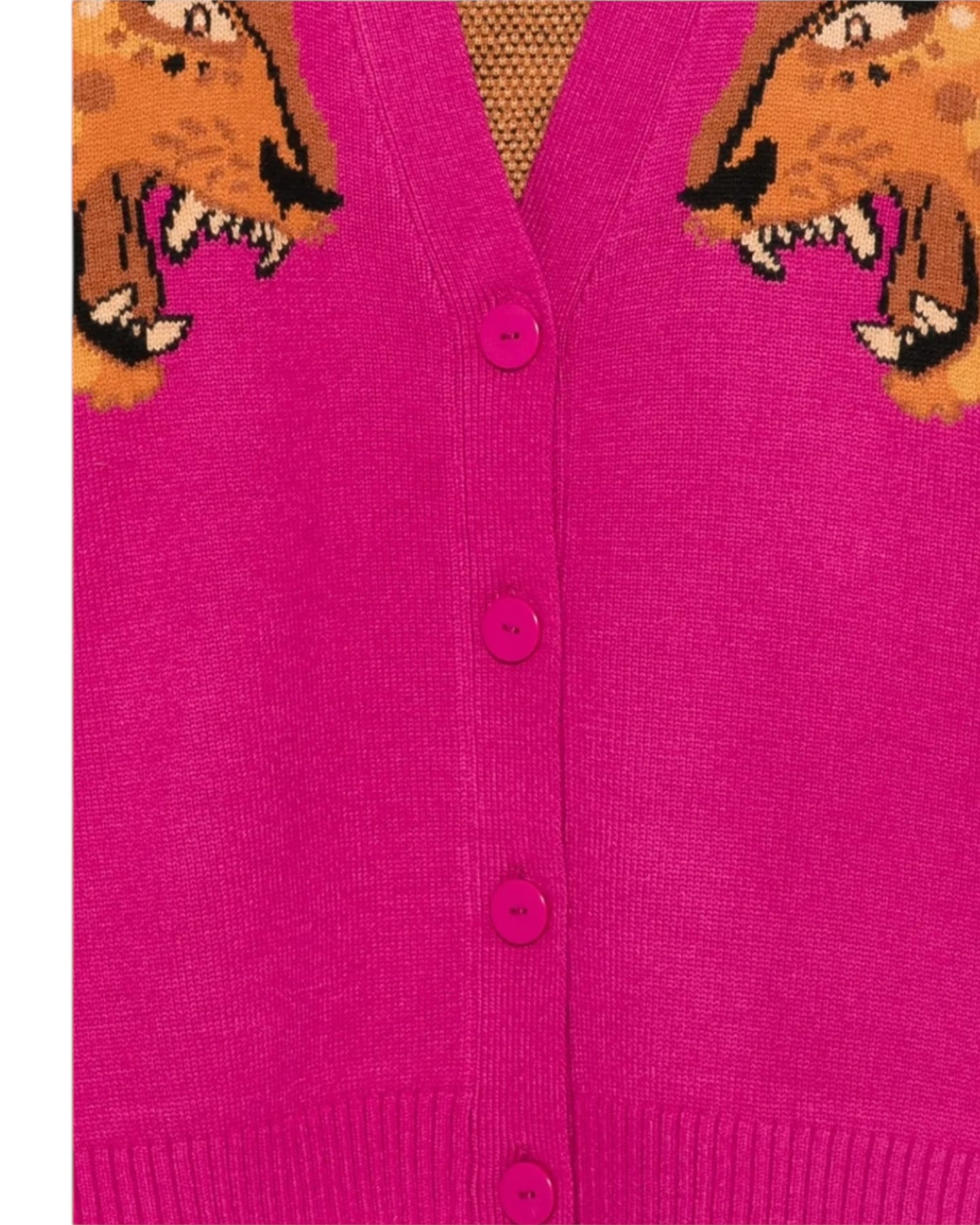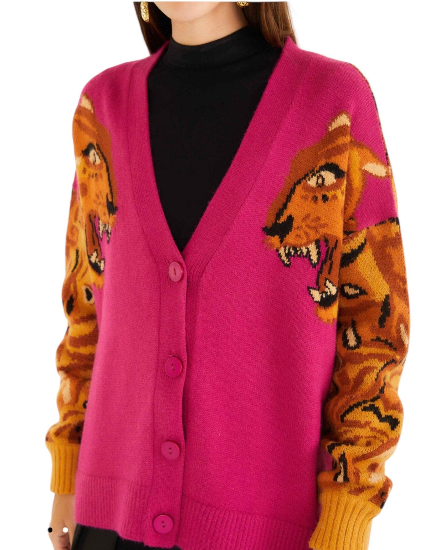 Bold and playful, this vibrant fuchsia knit cardigan features striking tiger motifs on the sleeves and shoulders in rich orange and black tones. Designed with a deep V-neckline, front button closure, and ribbed hem and cuffs in contrasting mustard for a pop of colour. The relaxed fit and soft knit make it both comfortable and eye-catching — perfect for layering over a turtleneck or T-shirt for an effortlessly statement-making look.