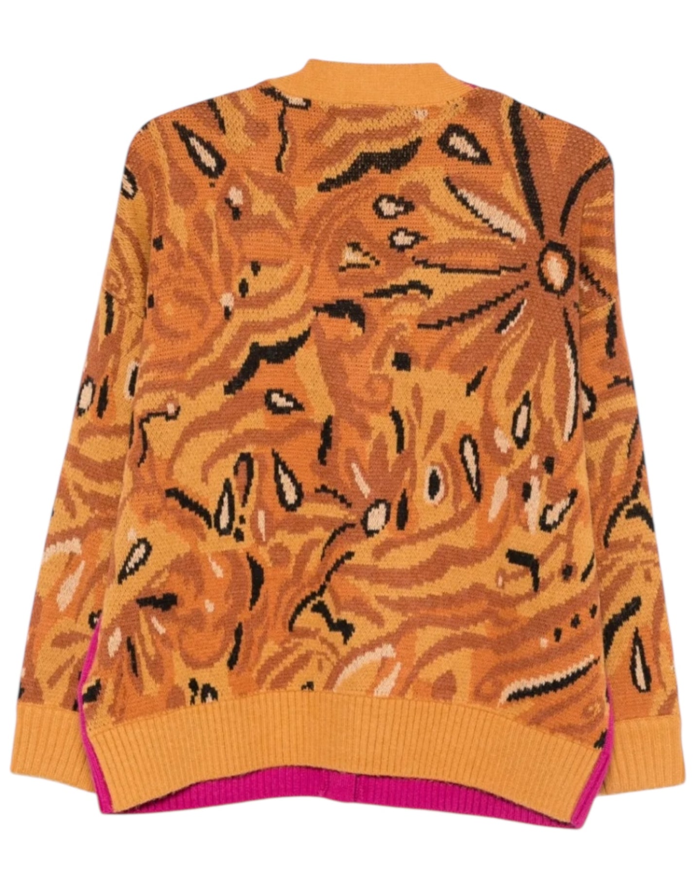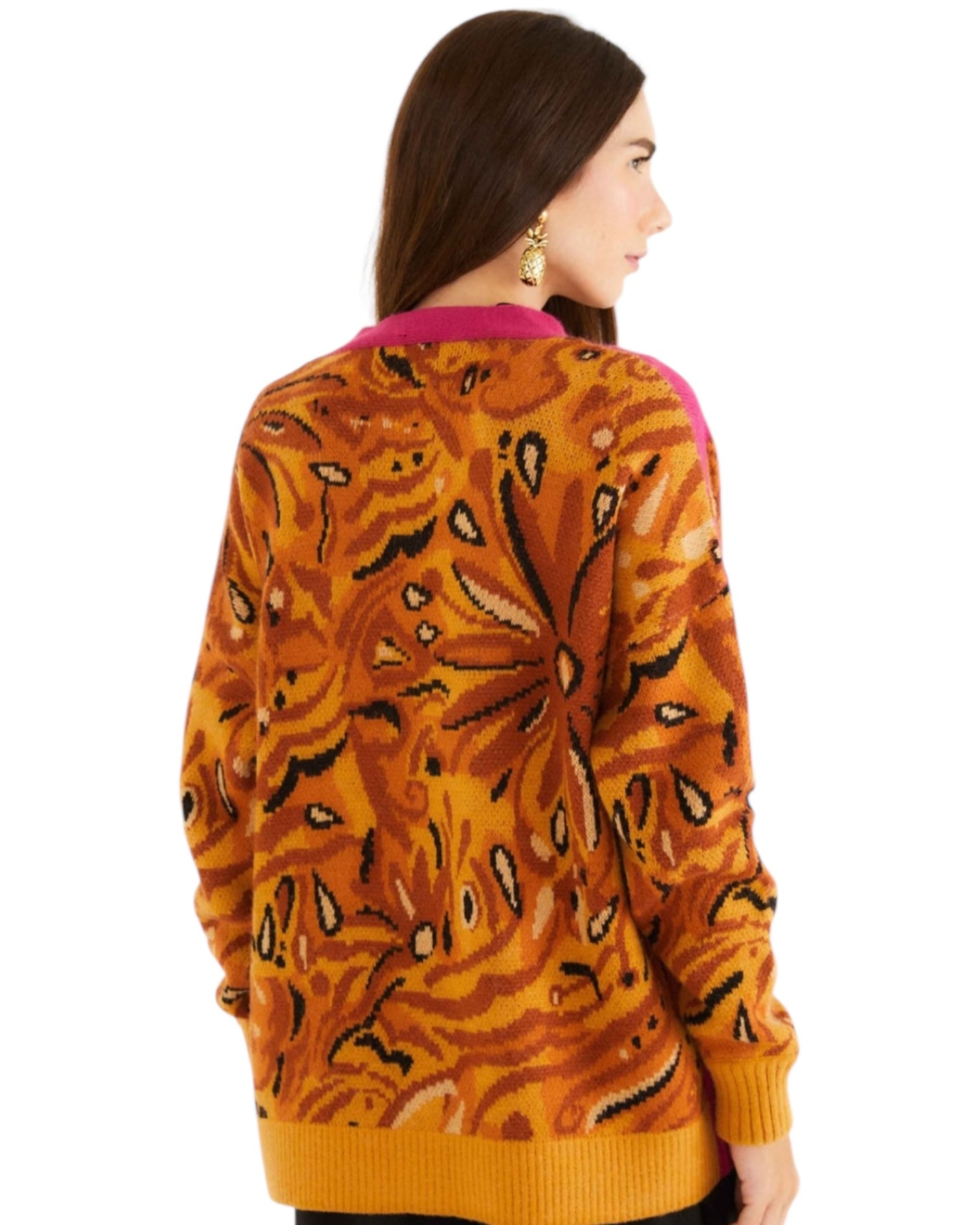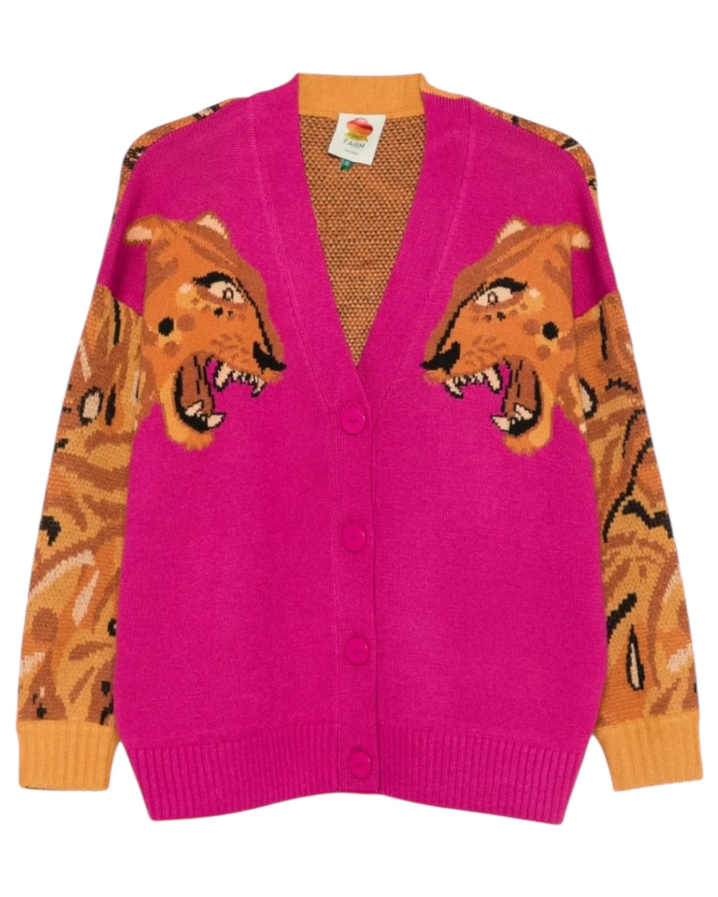 Bold and playful, this vibrant fuchsia knit cardigan features striking tiger motifs on the sleeves and shoulders in rich orange and black tones. Designed with a deep V-neckline, front button closure, and ribbed hem and cuffs in contrasting mustard for a pop of colour. The relaxed fit and soft knit make it both comfortable and eye-catching — perfect for layering over a turtleneck or T-shirt for an effortlessly statement-making look.