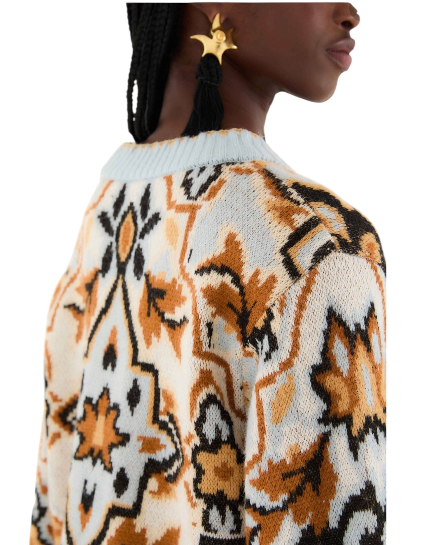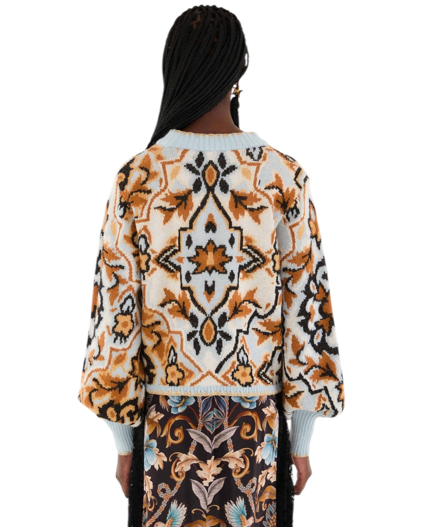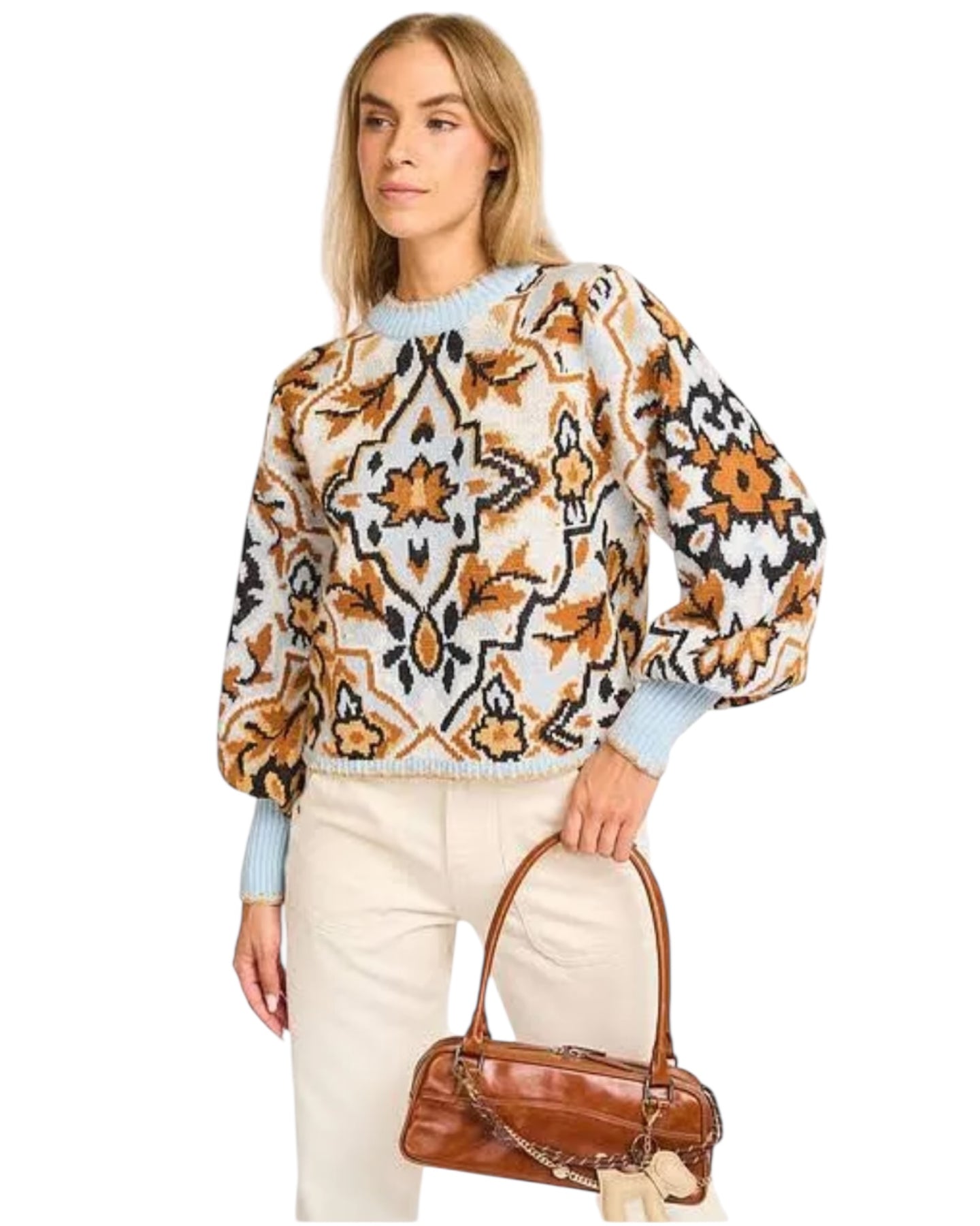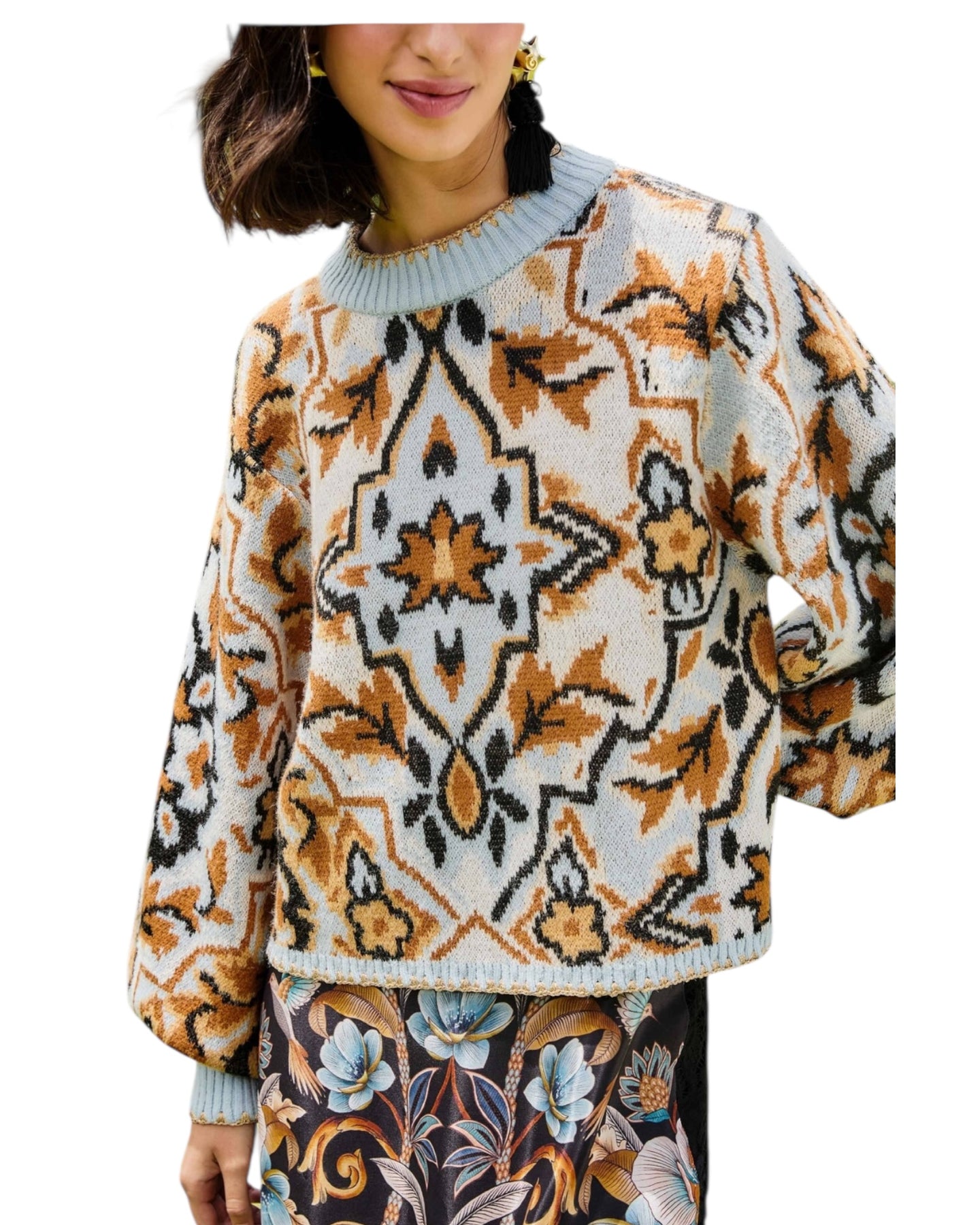 Wrap yourself in the Blue Winter Tapestry Sweater, where cozy meets artful charm. This knitwear piece features a warm palette of soft blues, golden ochres, and bold blacks woven into an intricate tapestry-inspired pattern. Its relaxed silhouette with voluminous balloon sleeves and a classic round neckline creates playful movement and comfort. Finished with delicate ribbed cuffs, this sweater is a loving embrace of texture and story, perfect for spirited winter days.