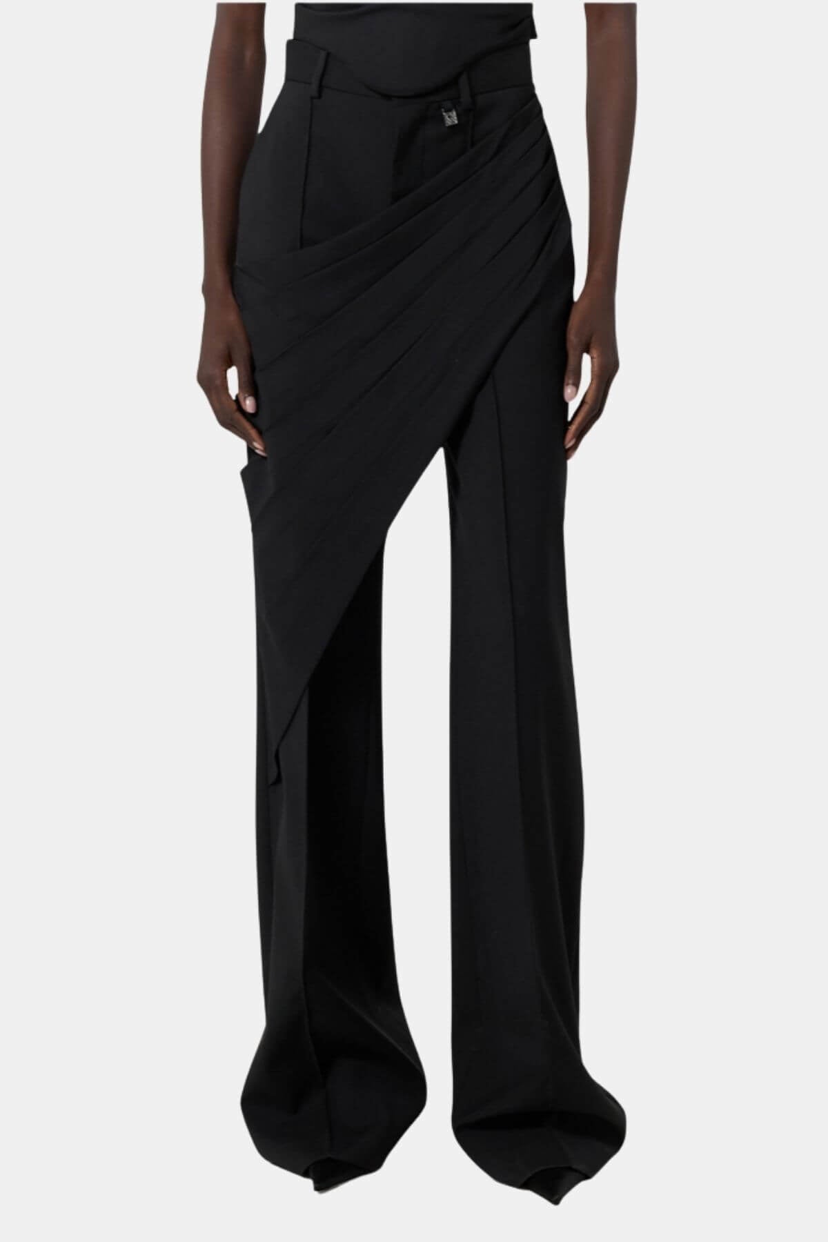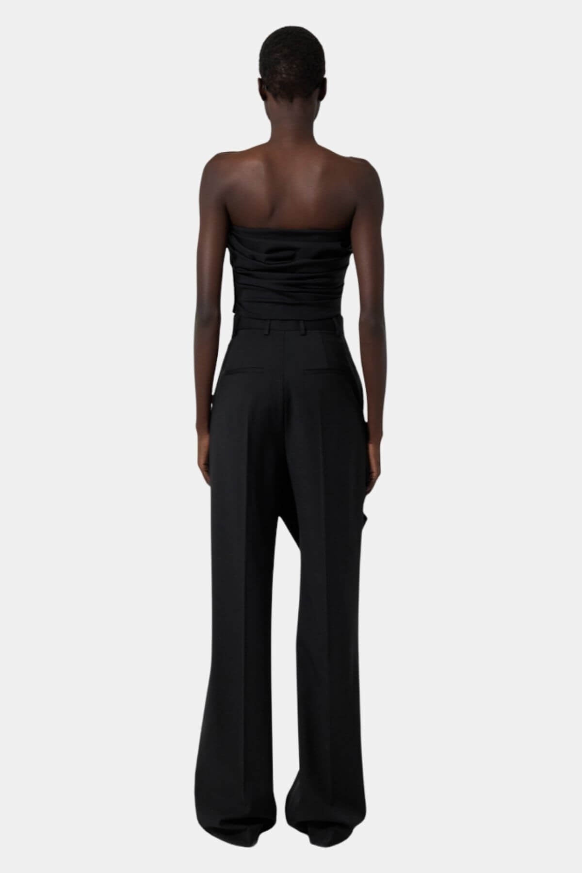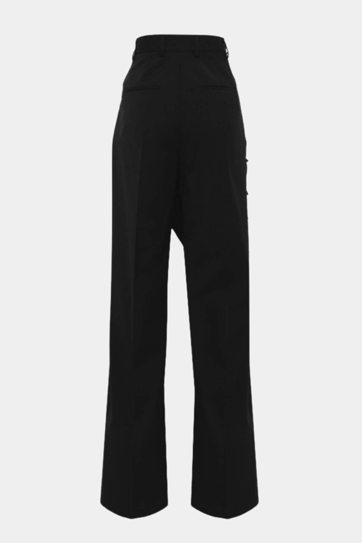 Tailored virgin wool flared fit pants in black. These pants has a medium waistband with belt loops, zip closure and concealed hook. The pants have a slightly draped asymmetric detailing on the front and welt pockets at back.