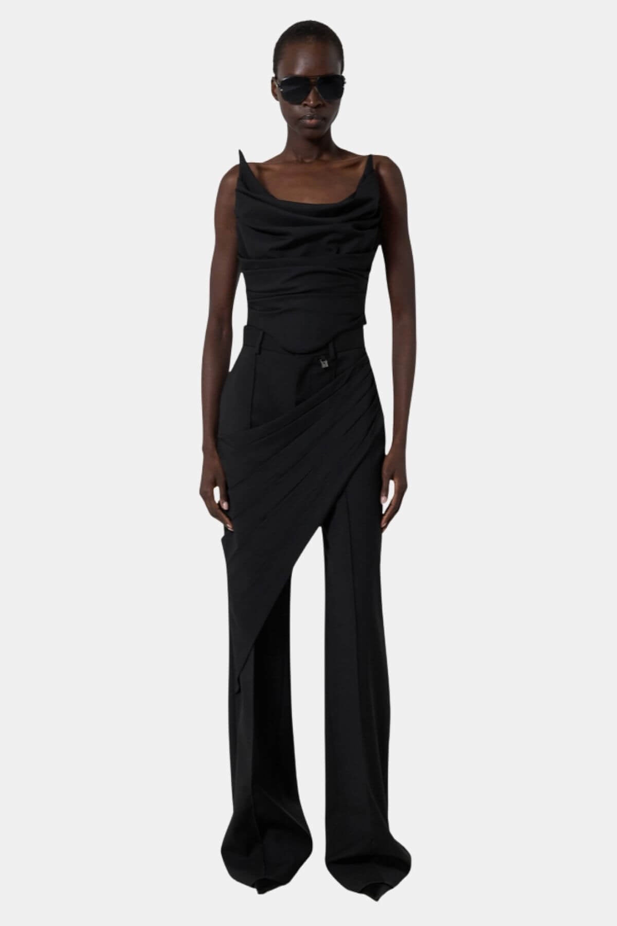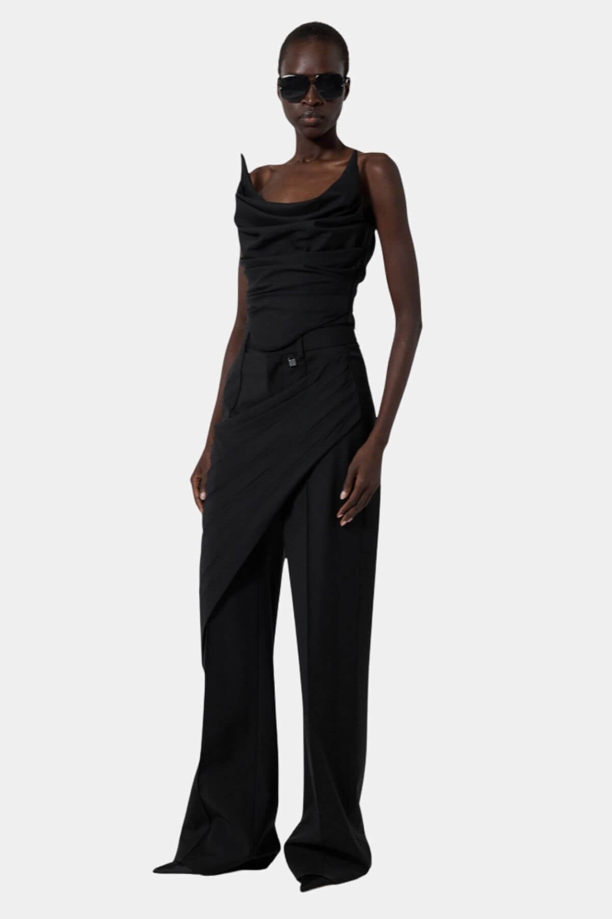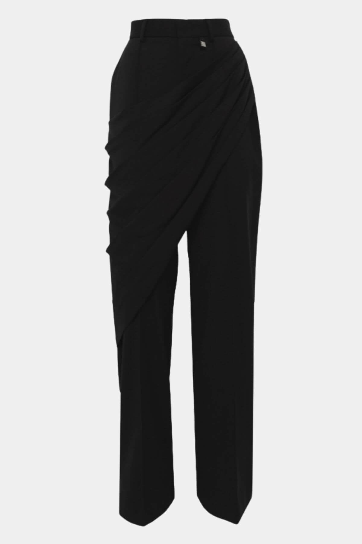 Tailored virgin wool flared fit pants in black. These pants has a medium waistband with belt loops, zip closure and concealed hook. The pants have a slightly draped asymmetric detailing on the front and welt pockets at back.
