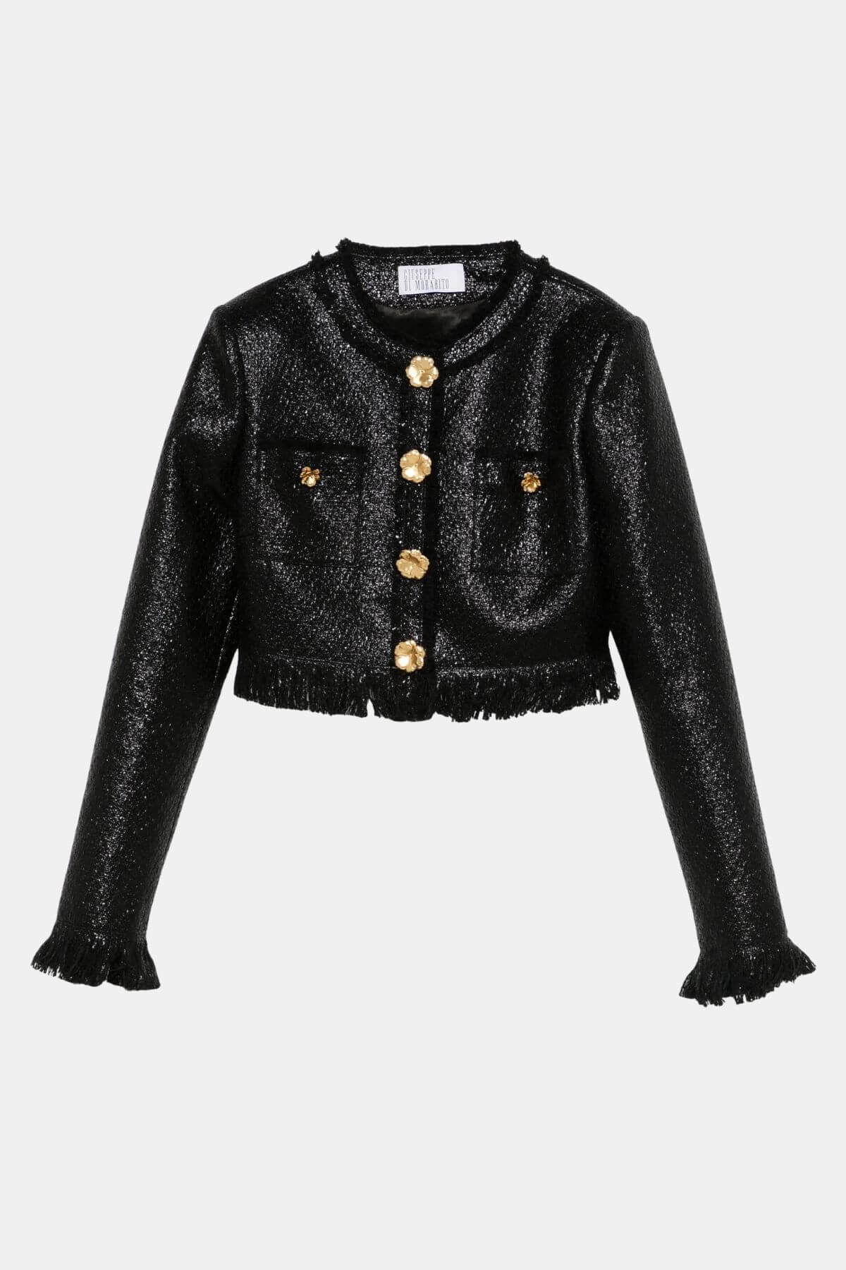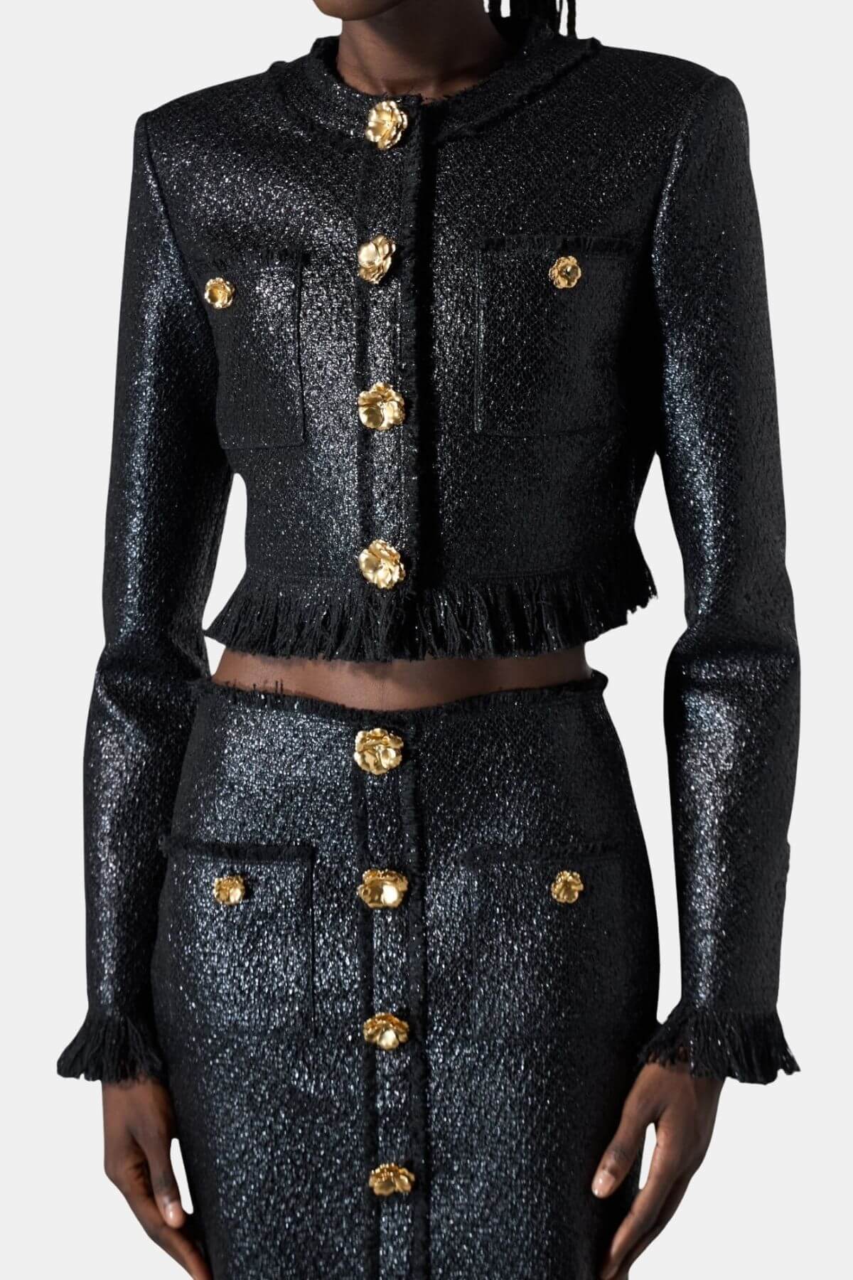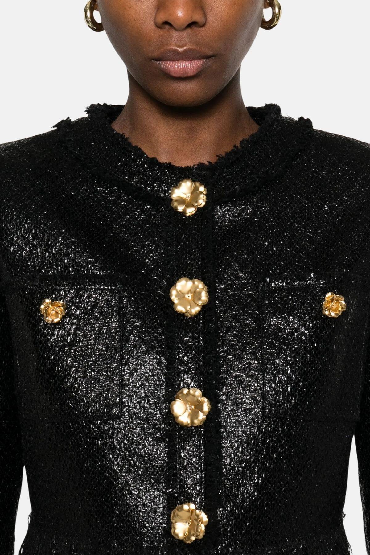 Look beautiful in this Giuseppe de Morabito Black jacket with gold flower button detail and front button closure. Pair with matching Morabito skirt.