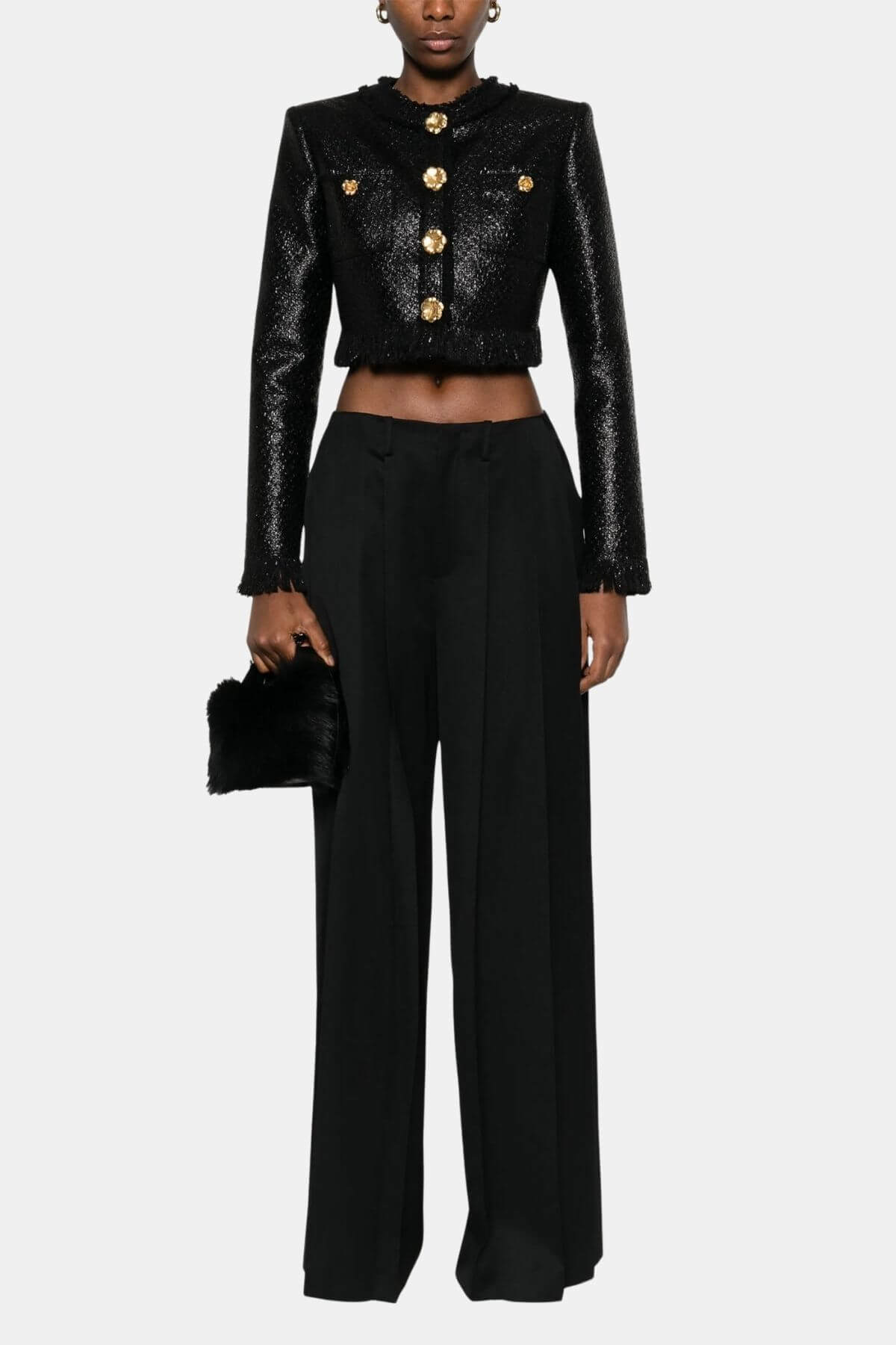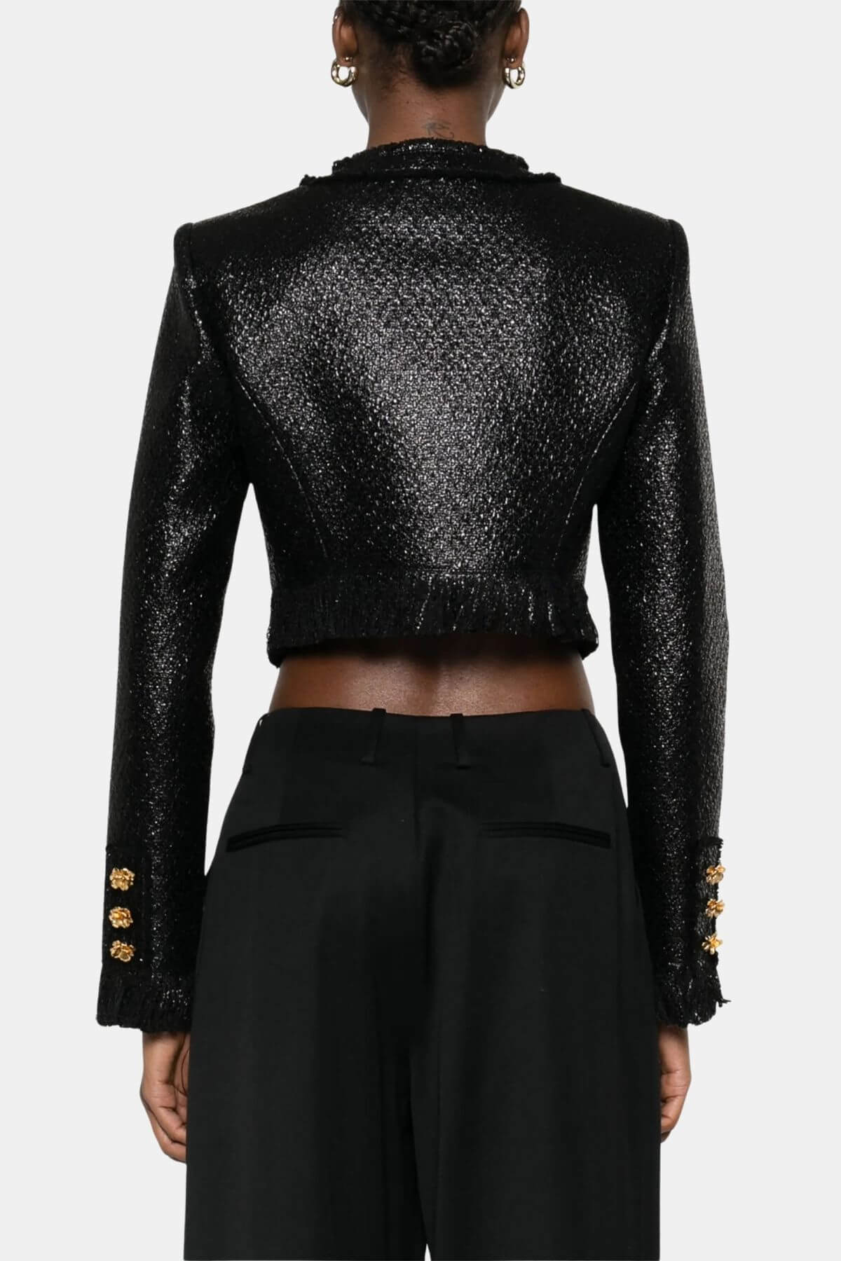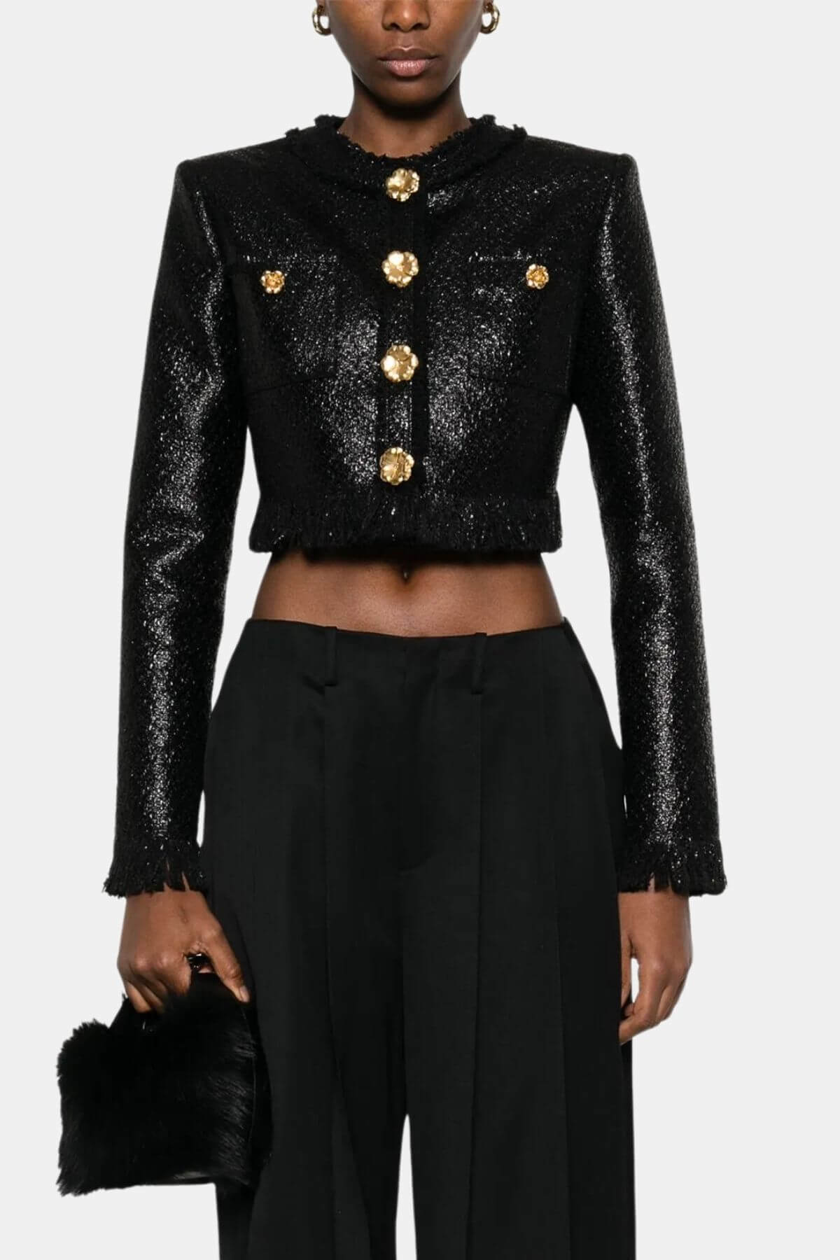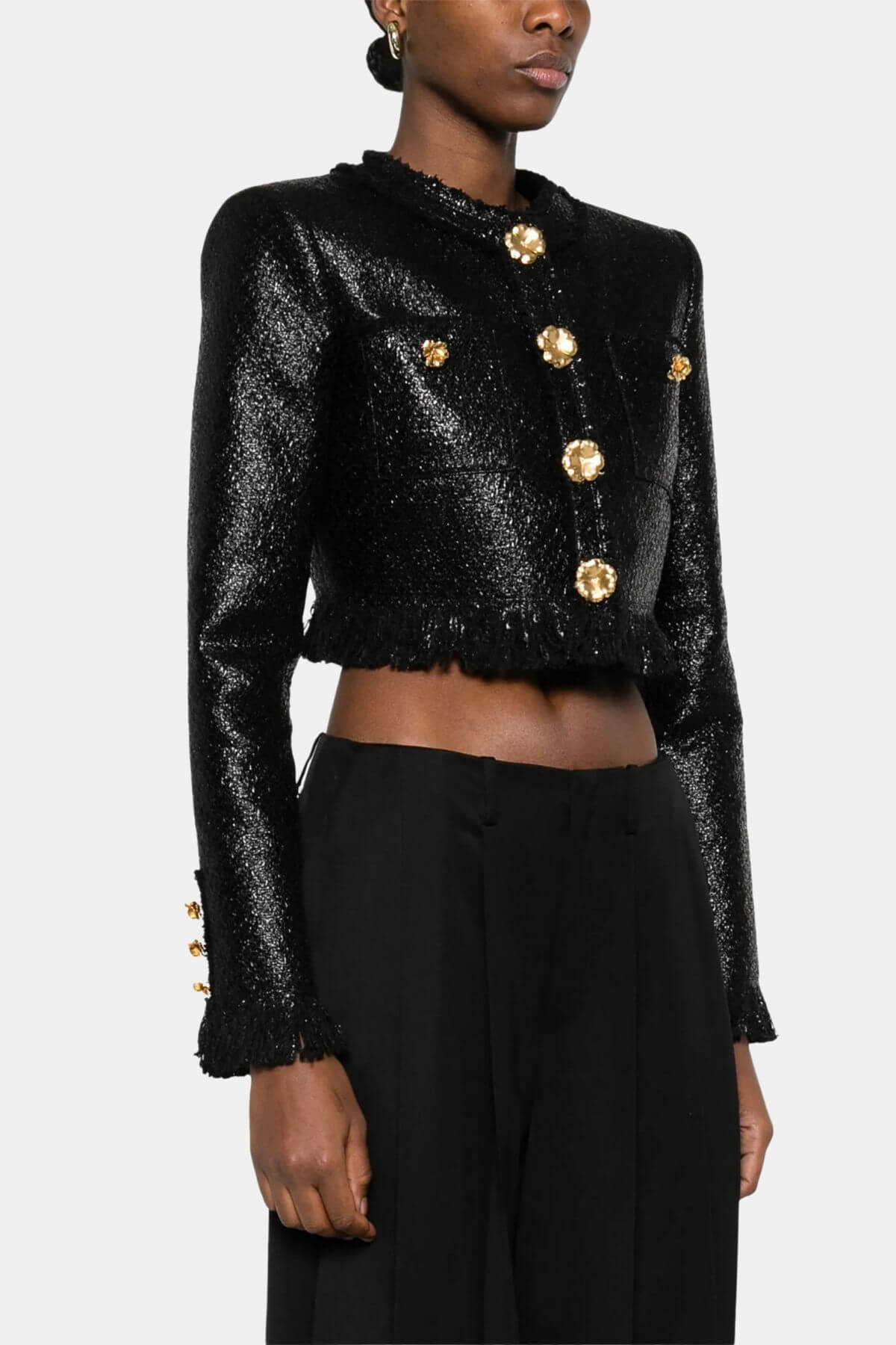 Look beautiful in this Giuseppe de Morabito Black jacket with gold flower button detail and front button closure. Pair with matching Morabito skirt.