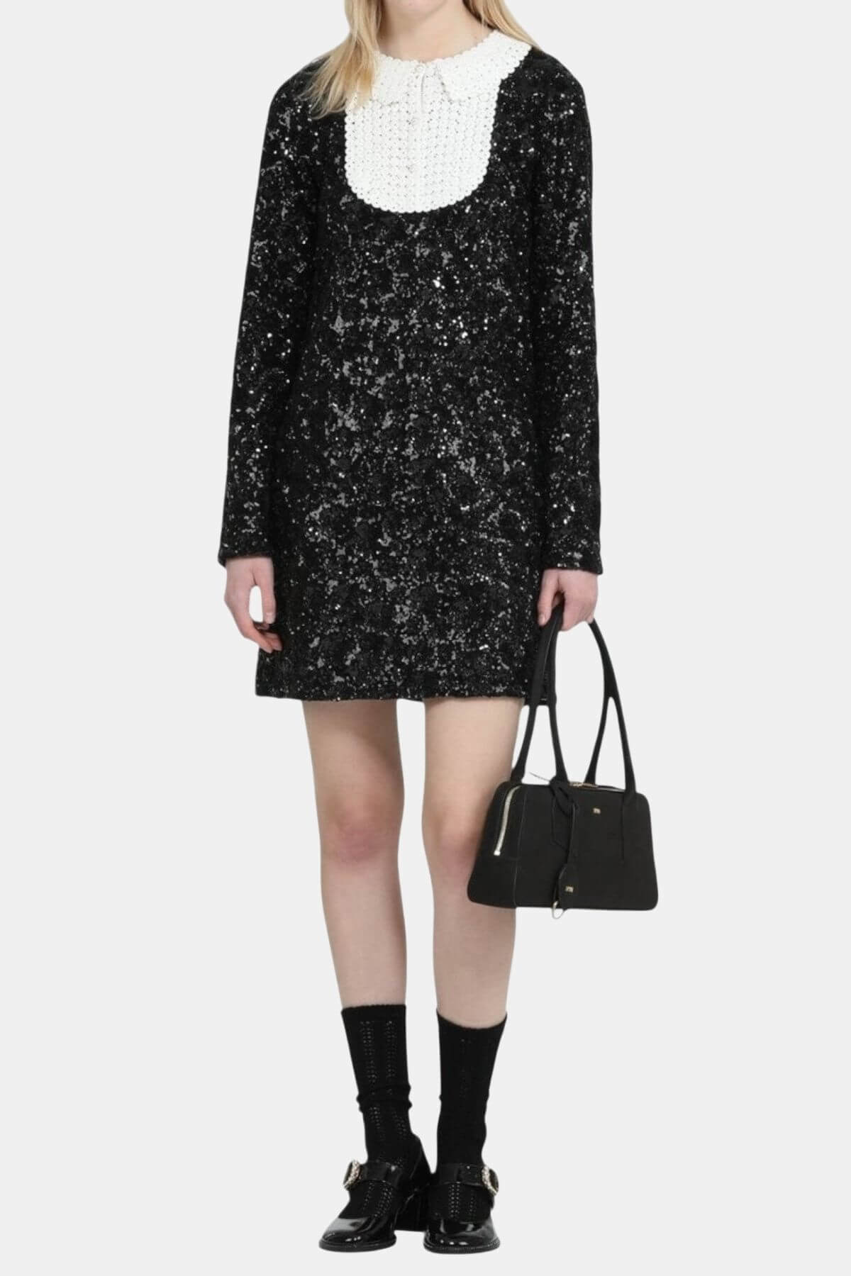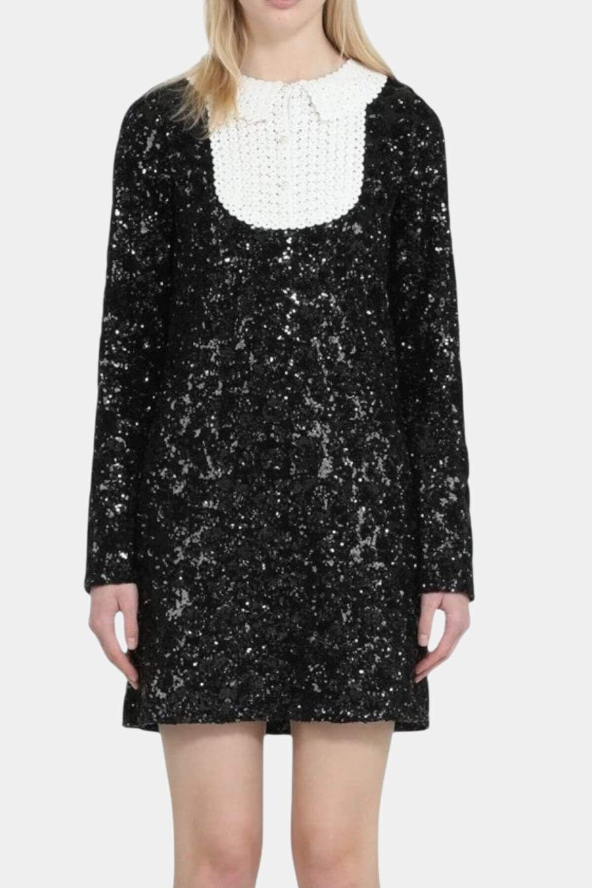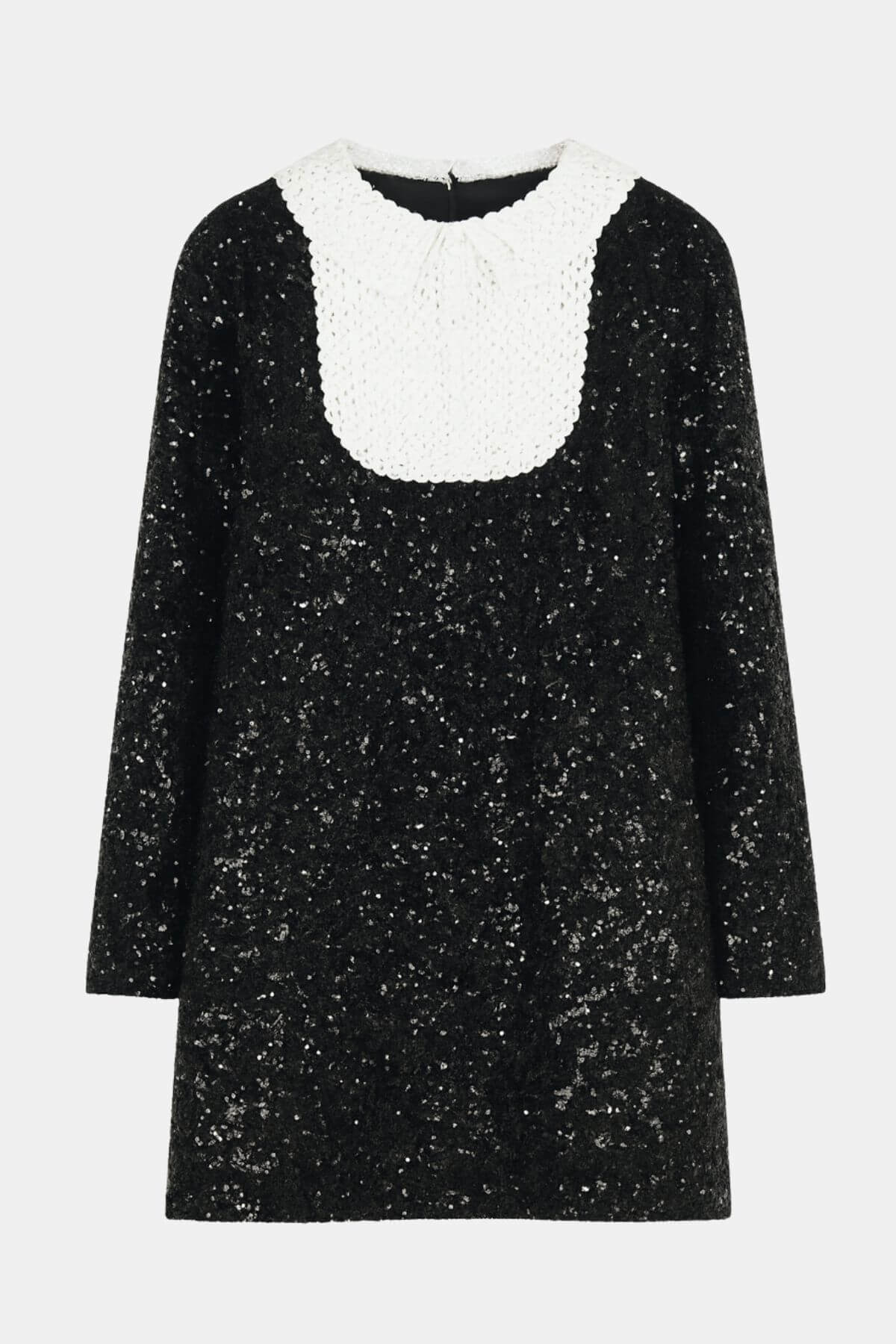 Short two-tone dress made of beaded fabric, featuring a black base and a decorated white collar. The straight fit features long sleeves and a back zip closure. The design combines refined details with a simple, linear construction.