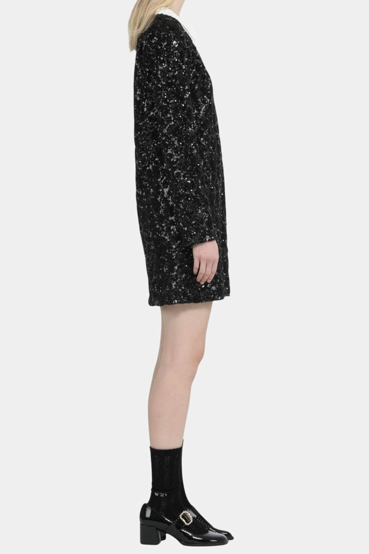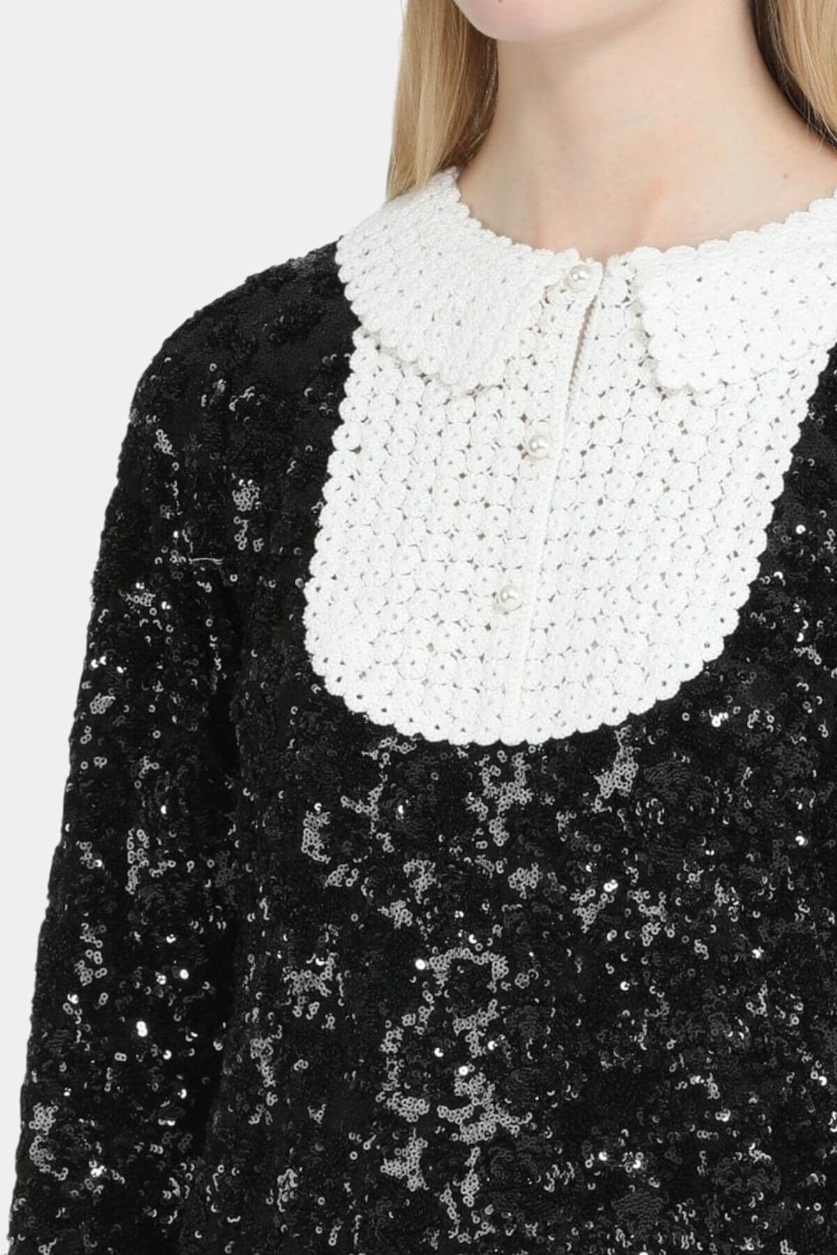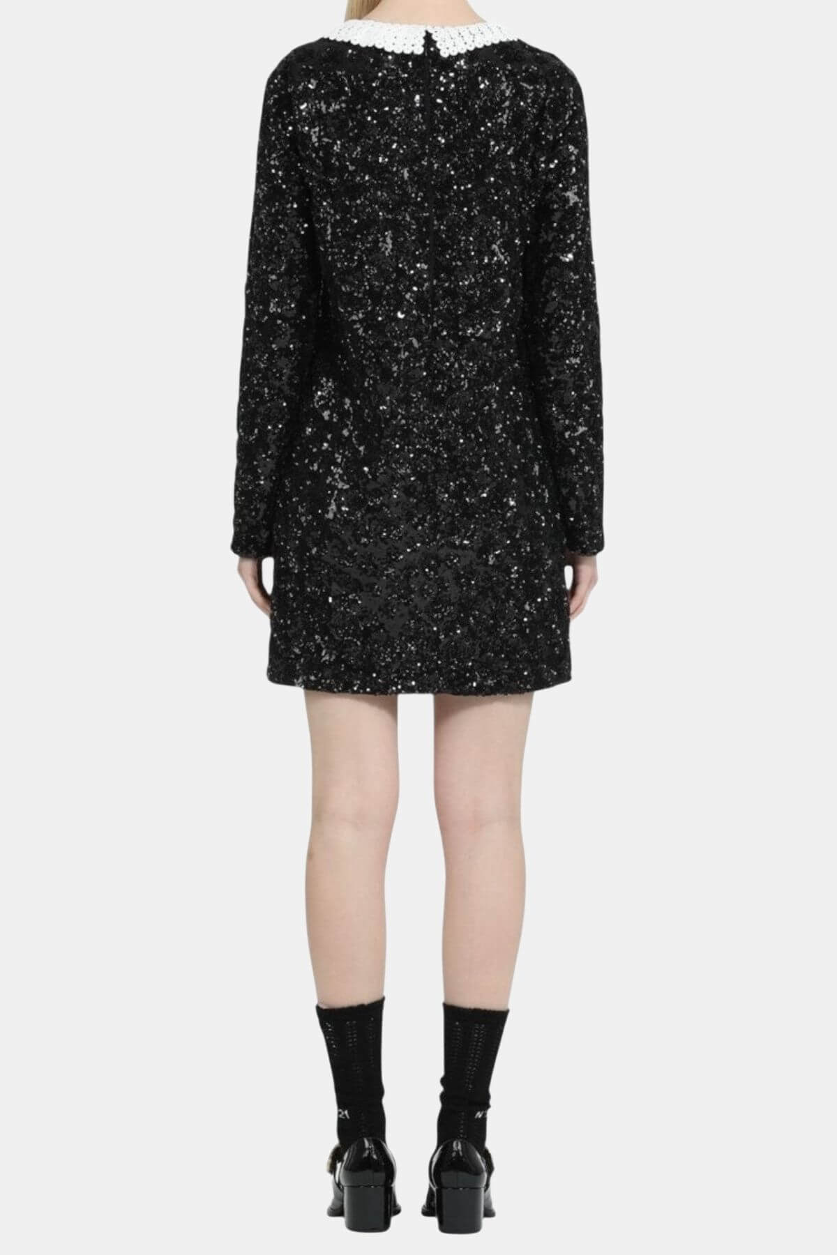 Short two-tone dress made of beaded fabric, featuring a black base and a decorated white collar. The straight fit features long sleeves and a back zip closure. The design combines refined details with a simple, linear construction.