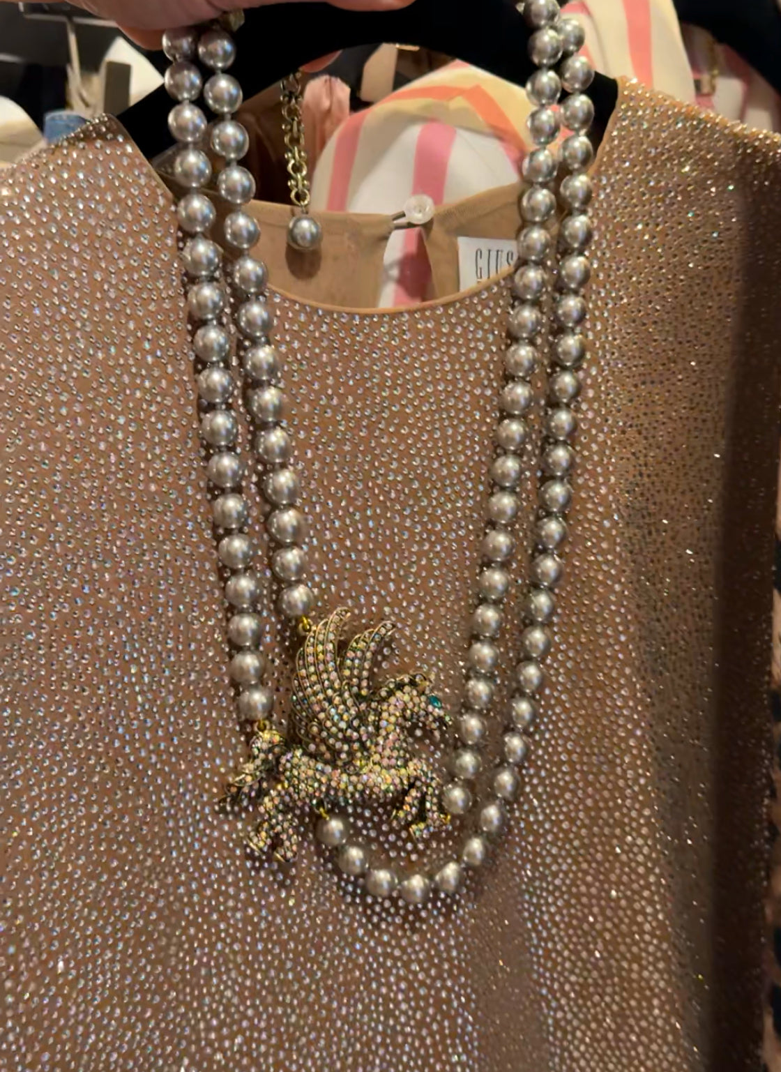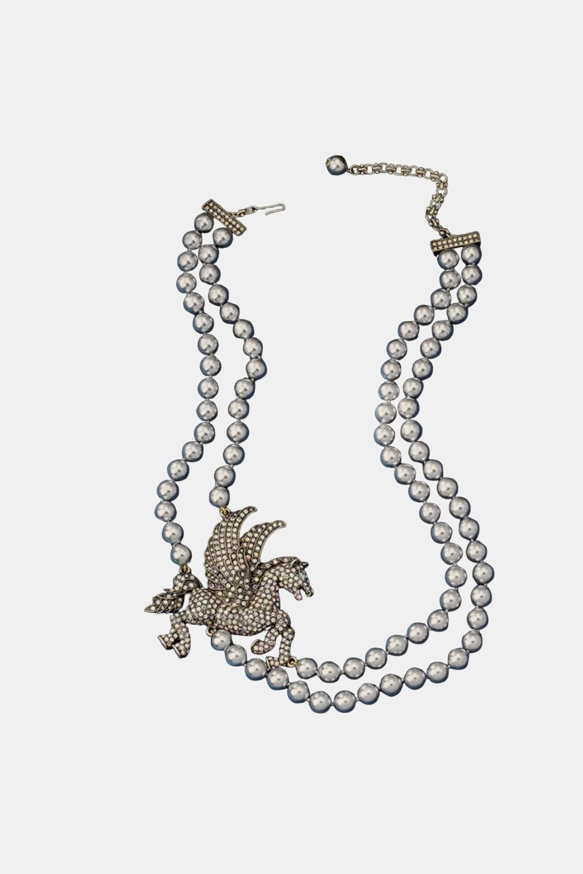 Add a touch of magic with this delicate pearl necklace, featuring a Pegasus pendant adorned with sparkling stones. Perfect for a dreamy, elegant look that shines in any occasion.