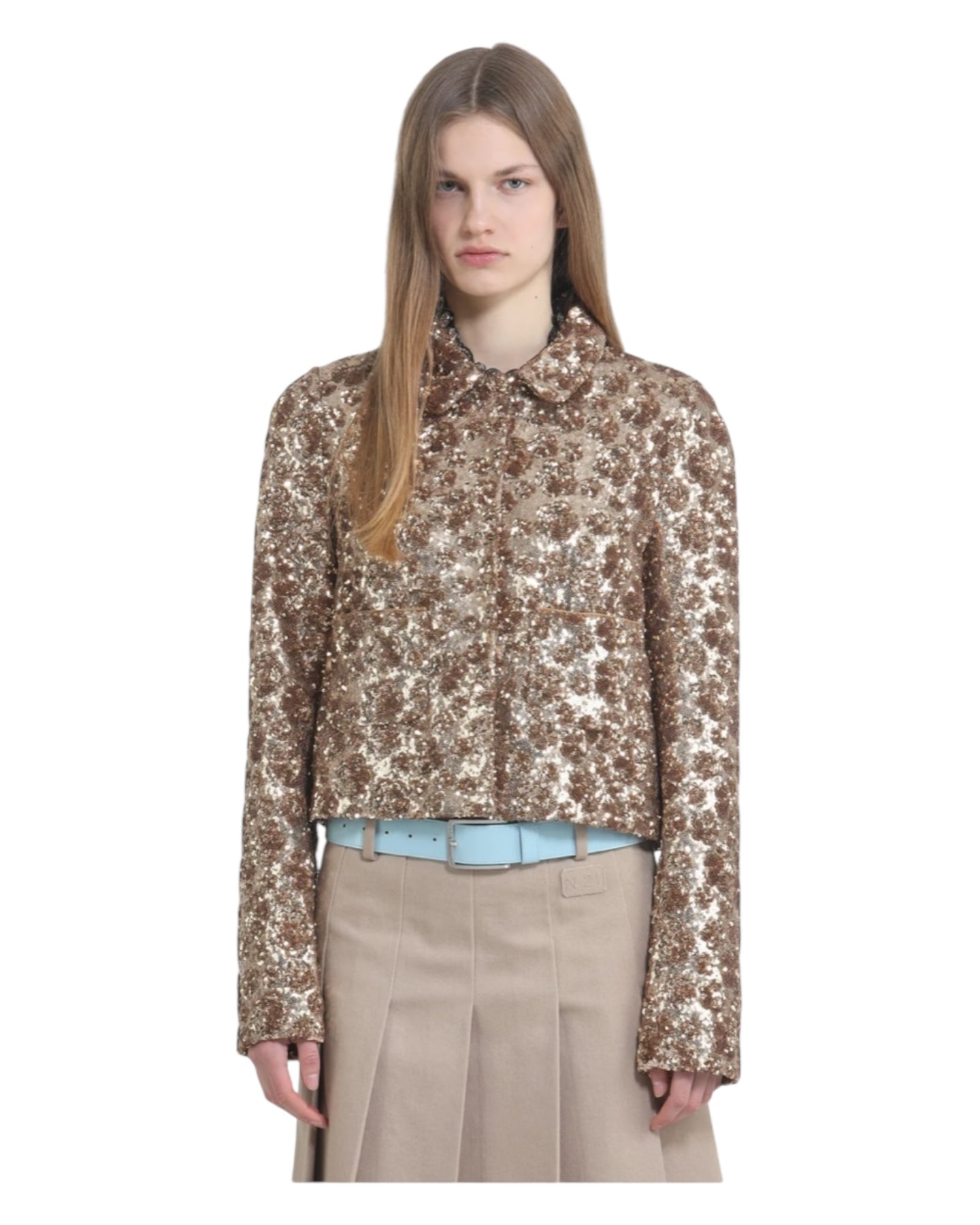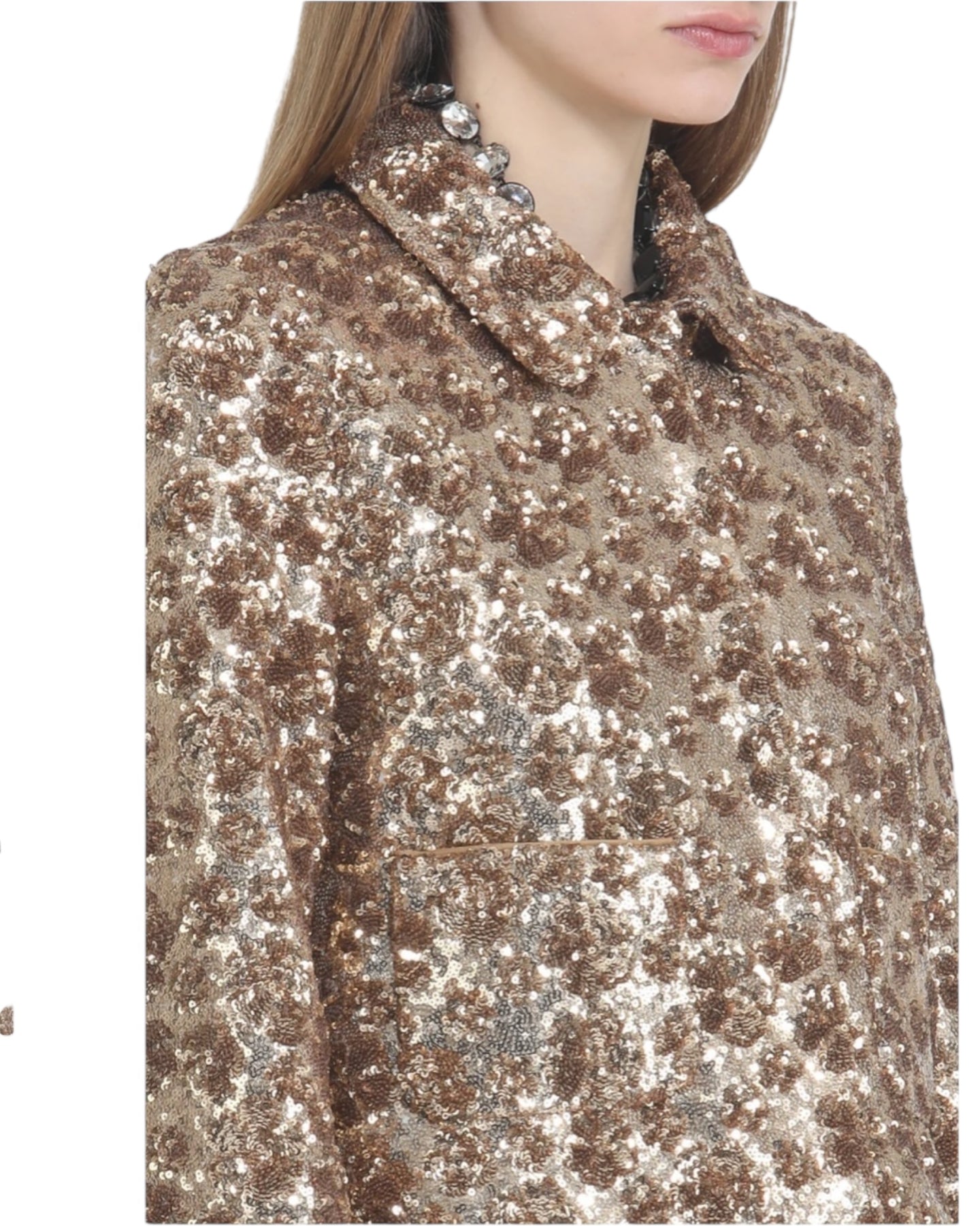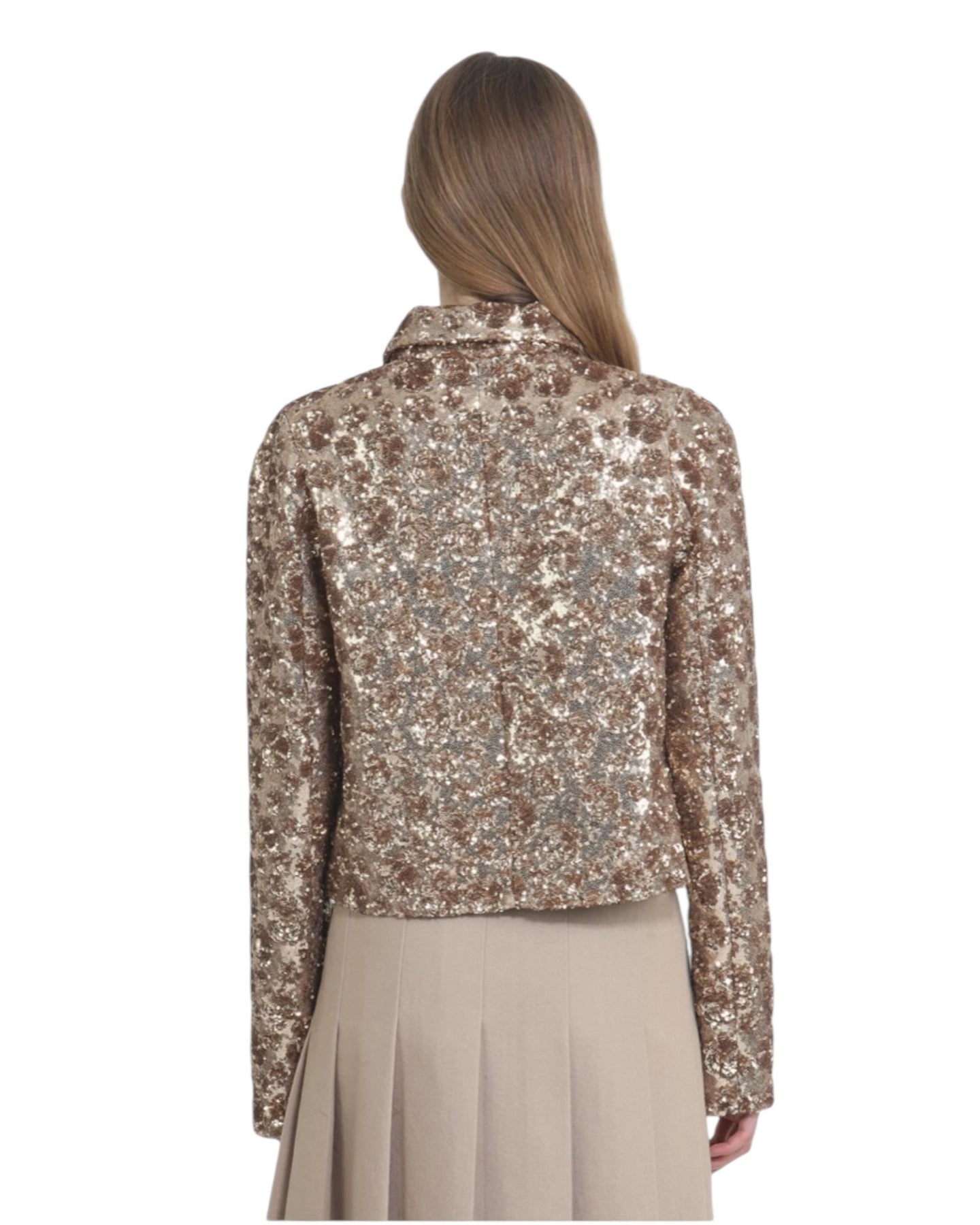 Short jacket made of fabric with full-length sequin appliqués. The garment features a regular fit with a classic collar and integrated front pockets. The design features a straight silhouette and a waist-length cut, ideal for a defined and modern look.
