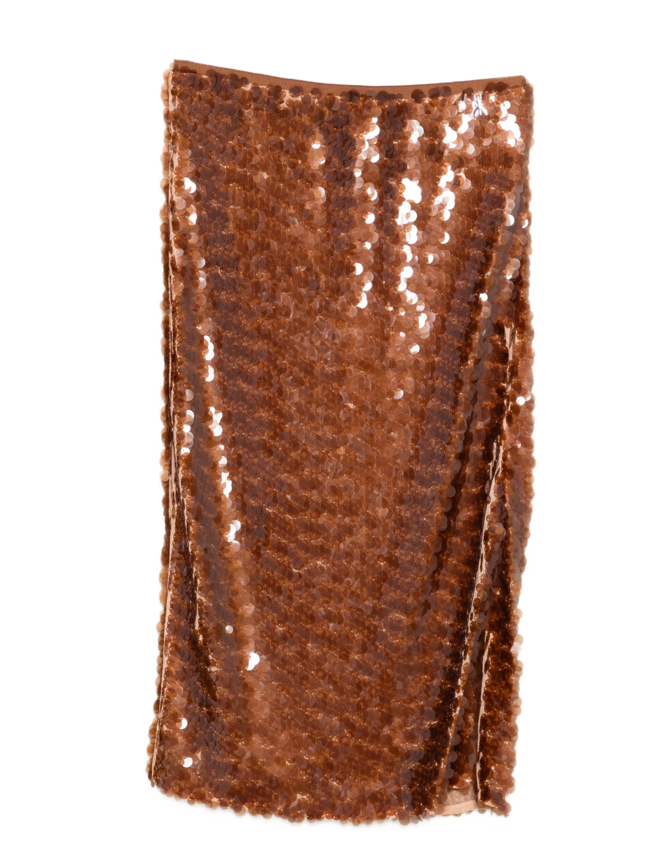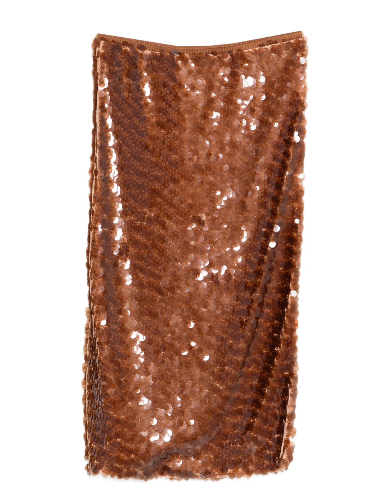 • Make a dazzling statement with this copper-toned sequin midi skirt from Patrizia Pepe.