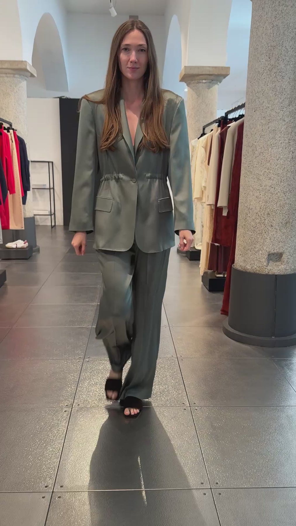 Satin Trousers. Wide Leg. French Pocket Detail. Front closure with men's hook and zip. Regular fit.