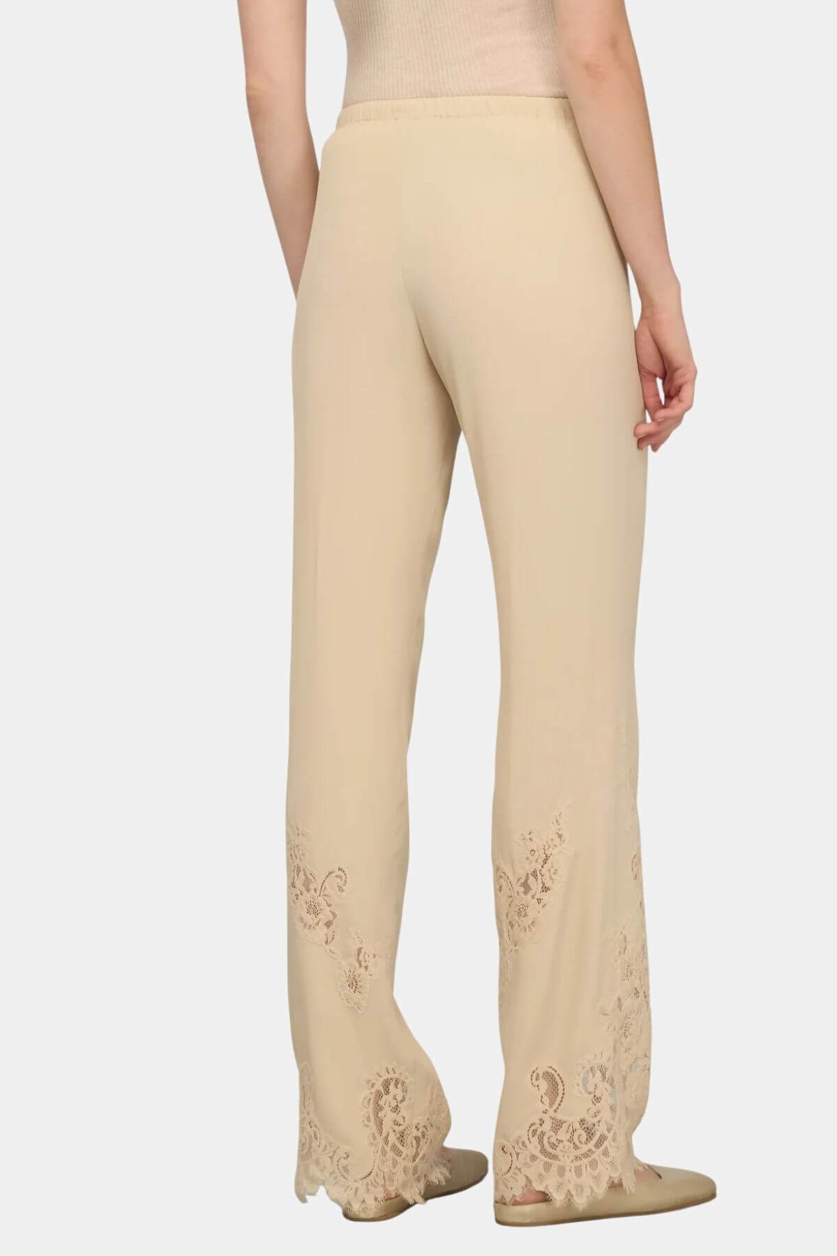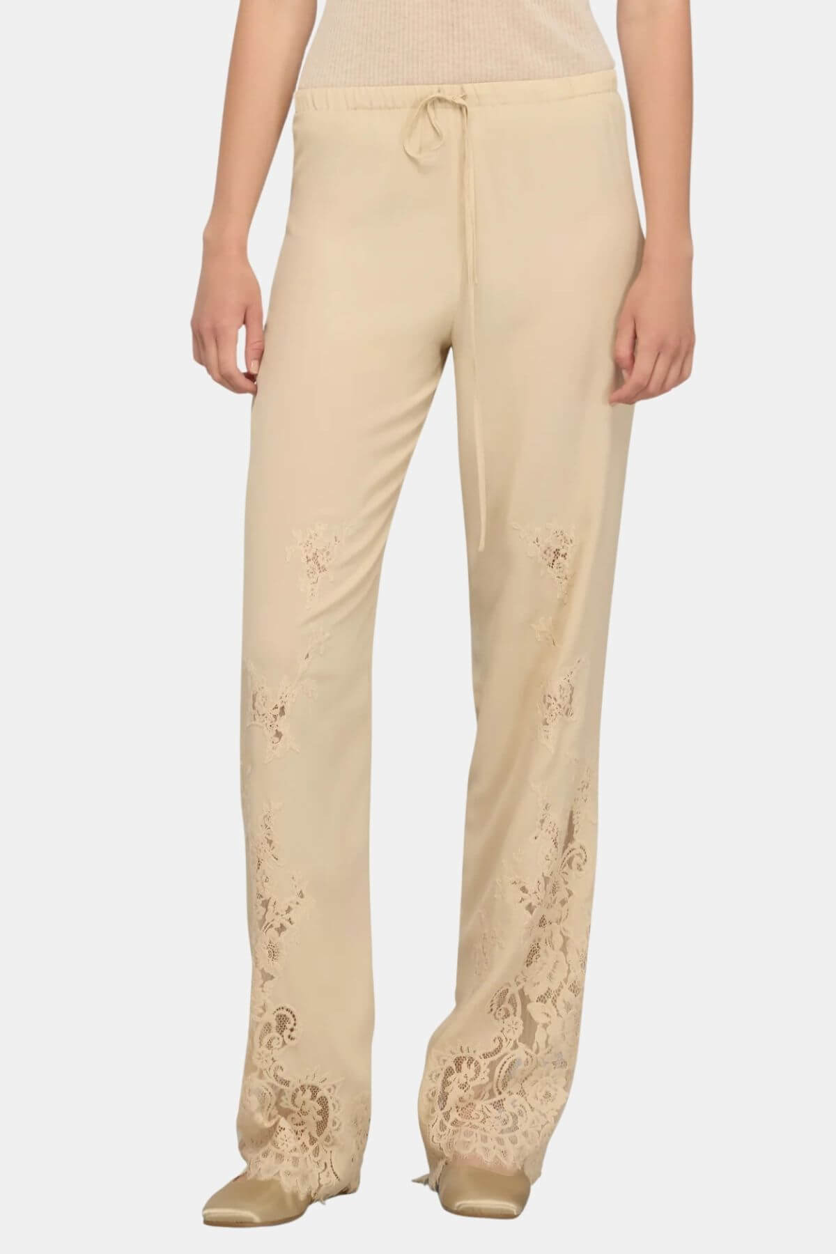 Crepe de chine trousers with lace at the bottom. Elastic waist and drawstring. Straight leg. Regular fit.