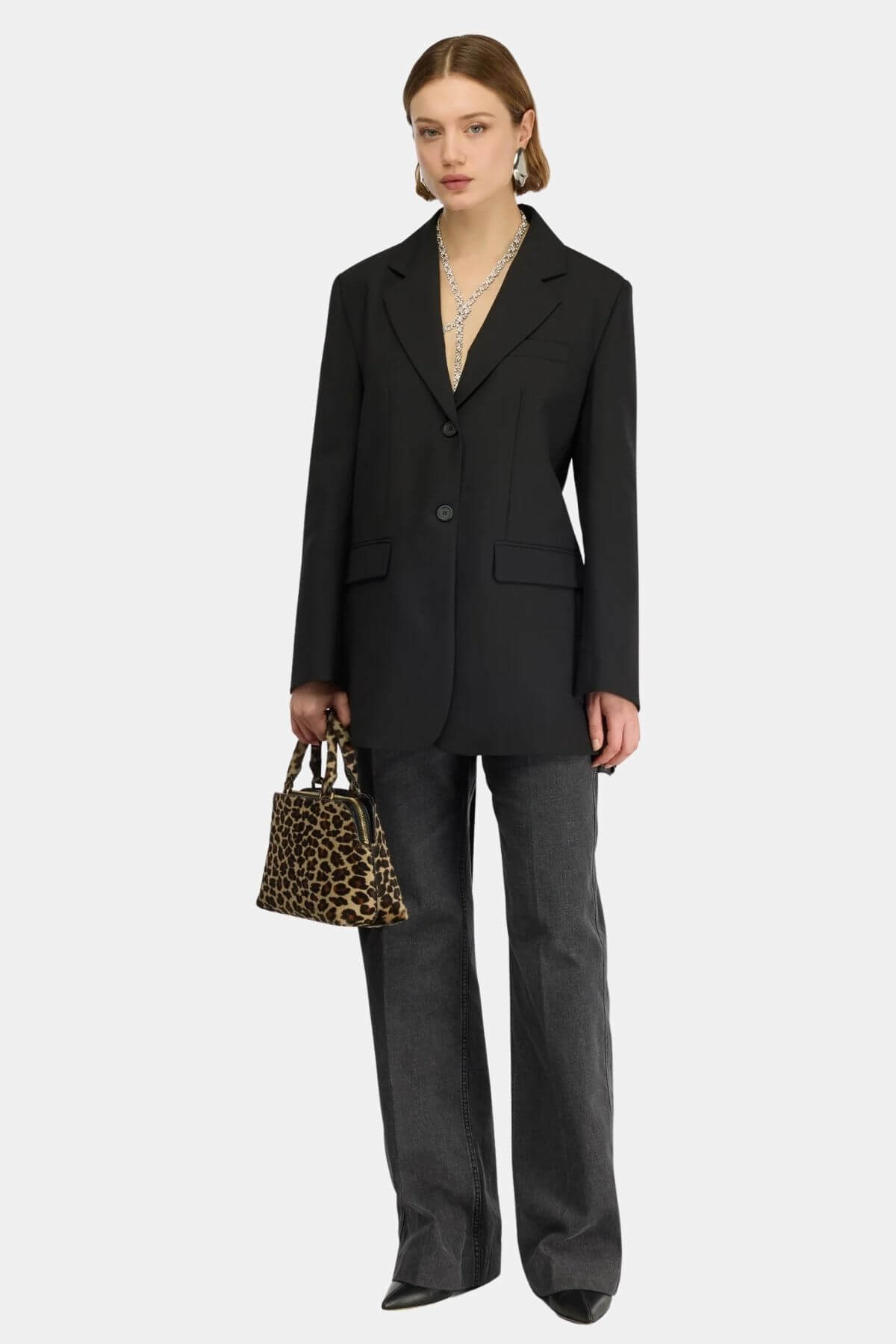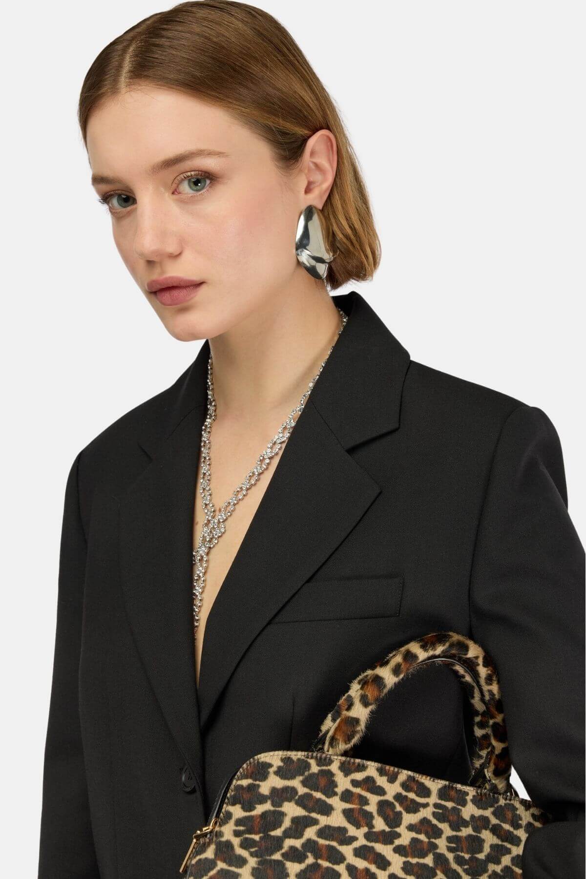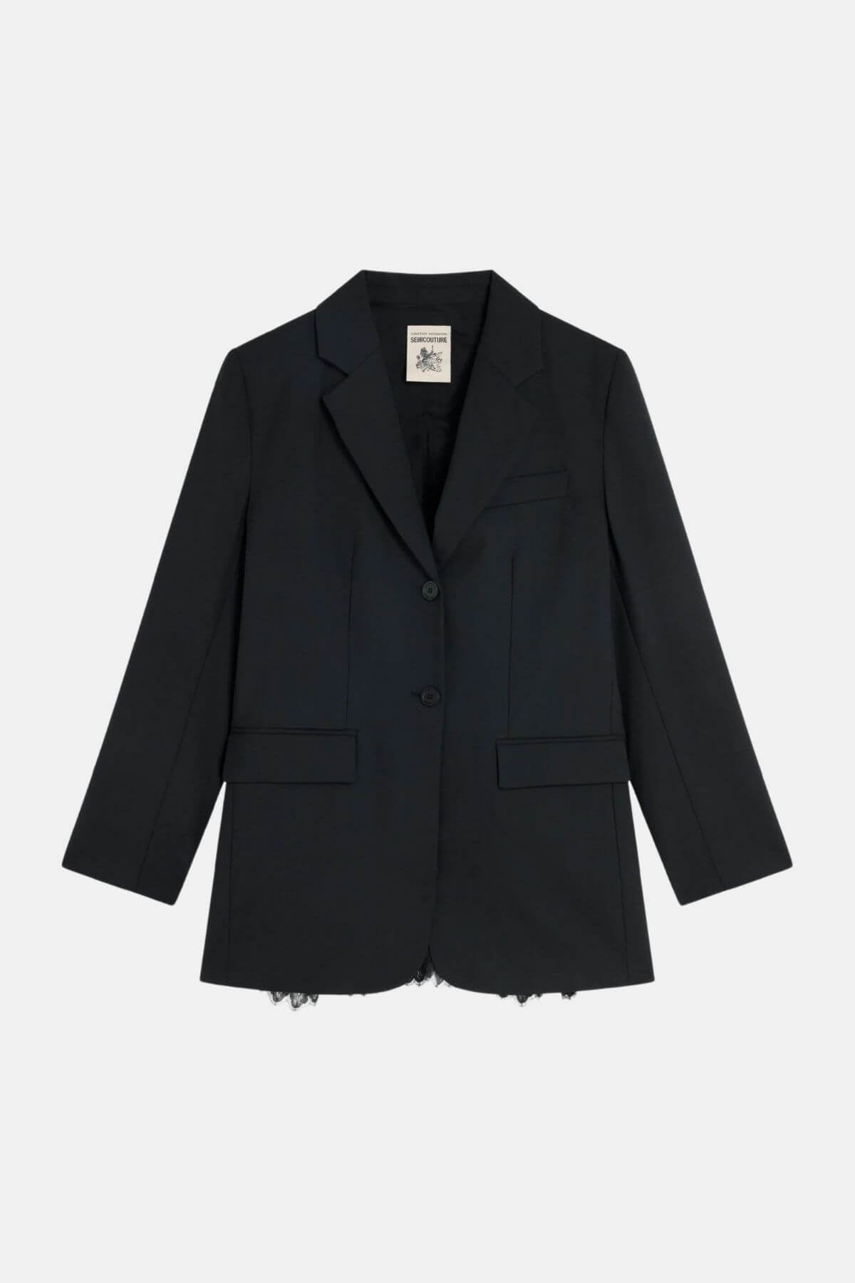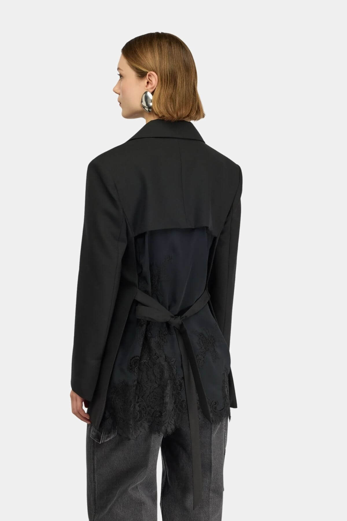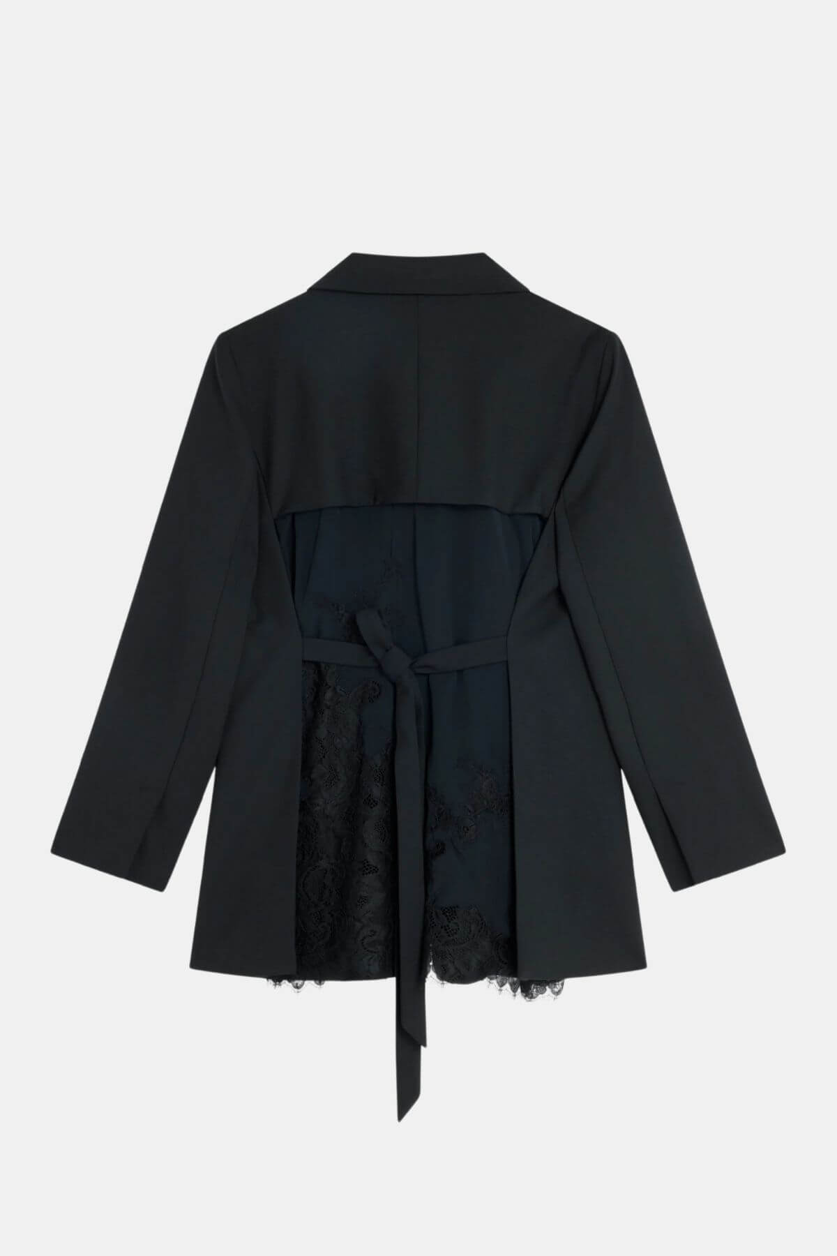 Cool wool and crepe de chine jacket, with lapel collar, belt included in the garment and two flap pockets. Back insert with crepe de chine embroidered detail. Regular fit.