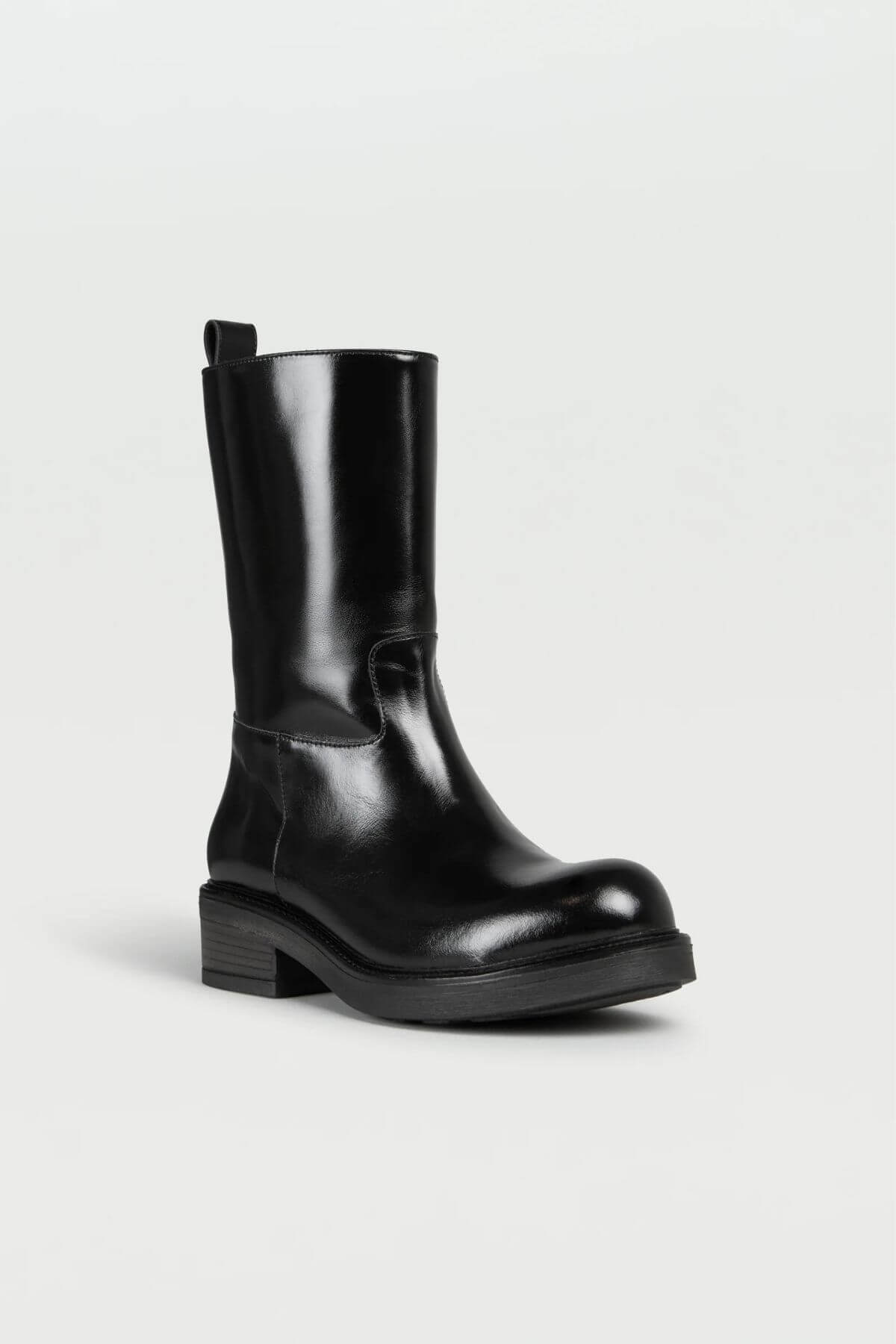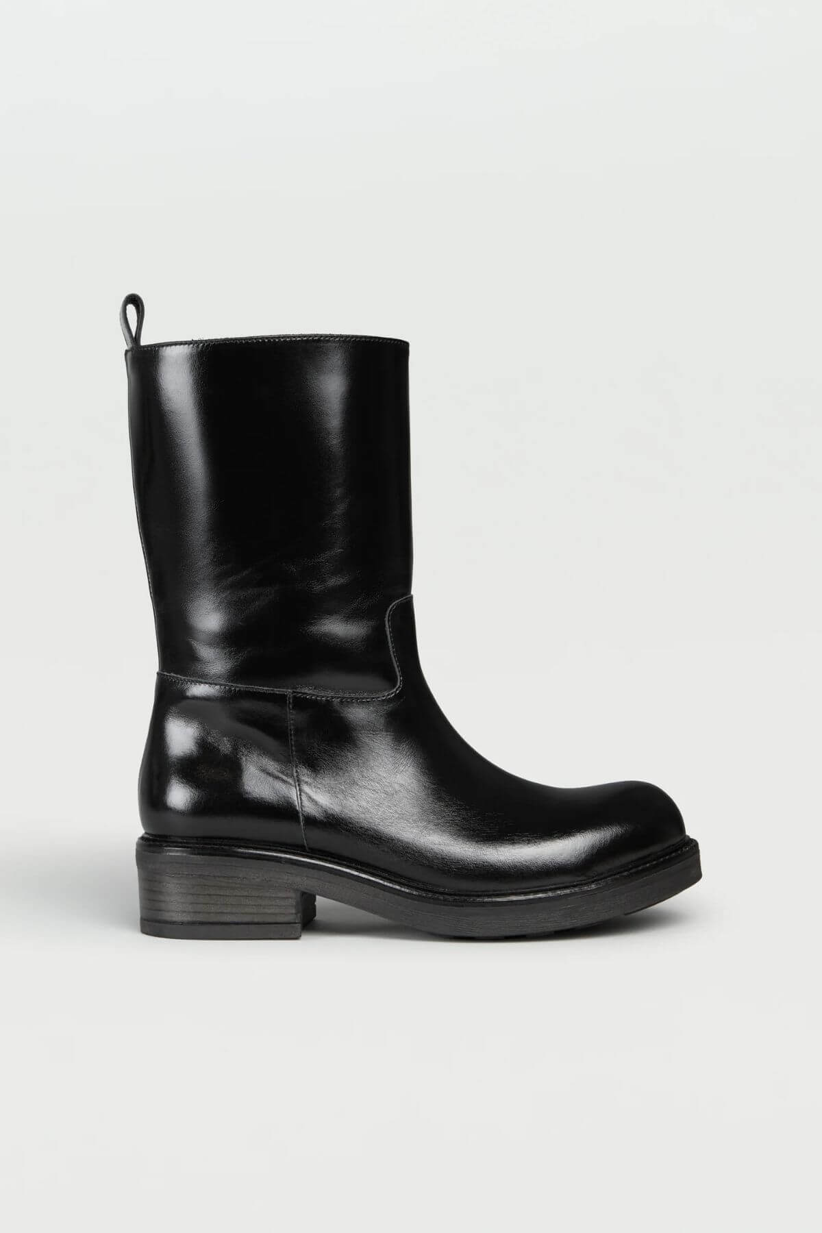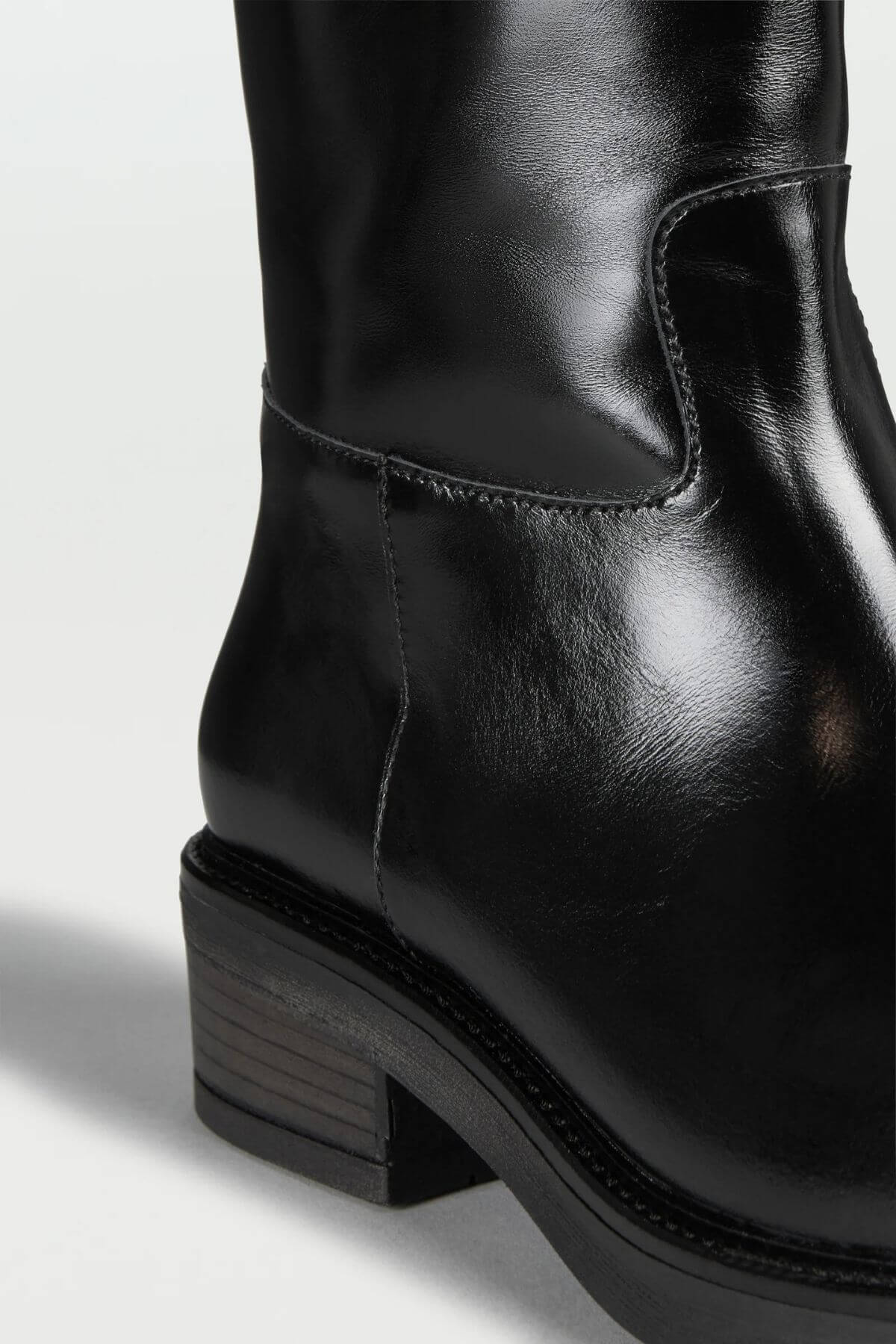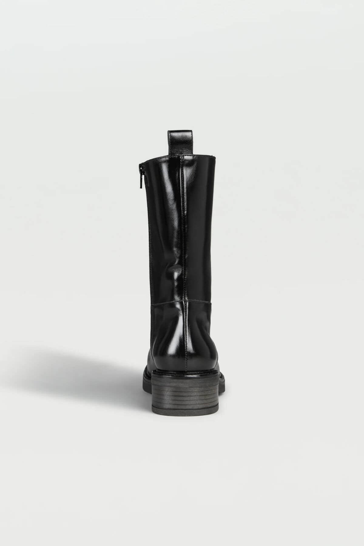 High leather commando boots. Rubber bottom, tongue detail at the back.