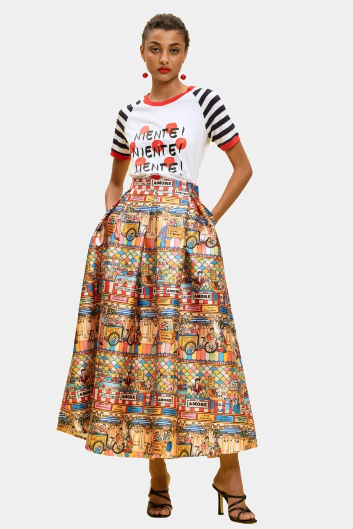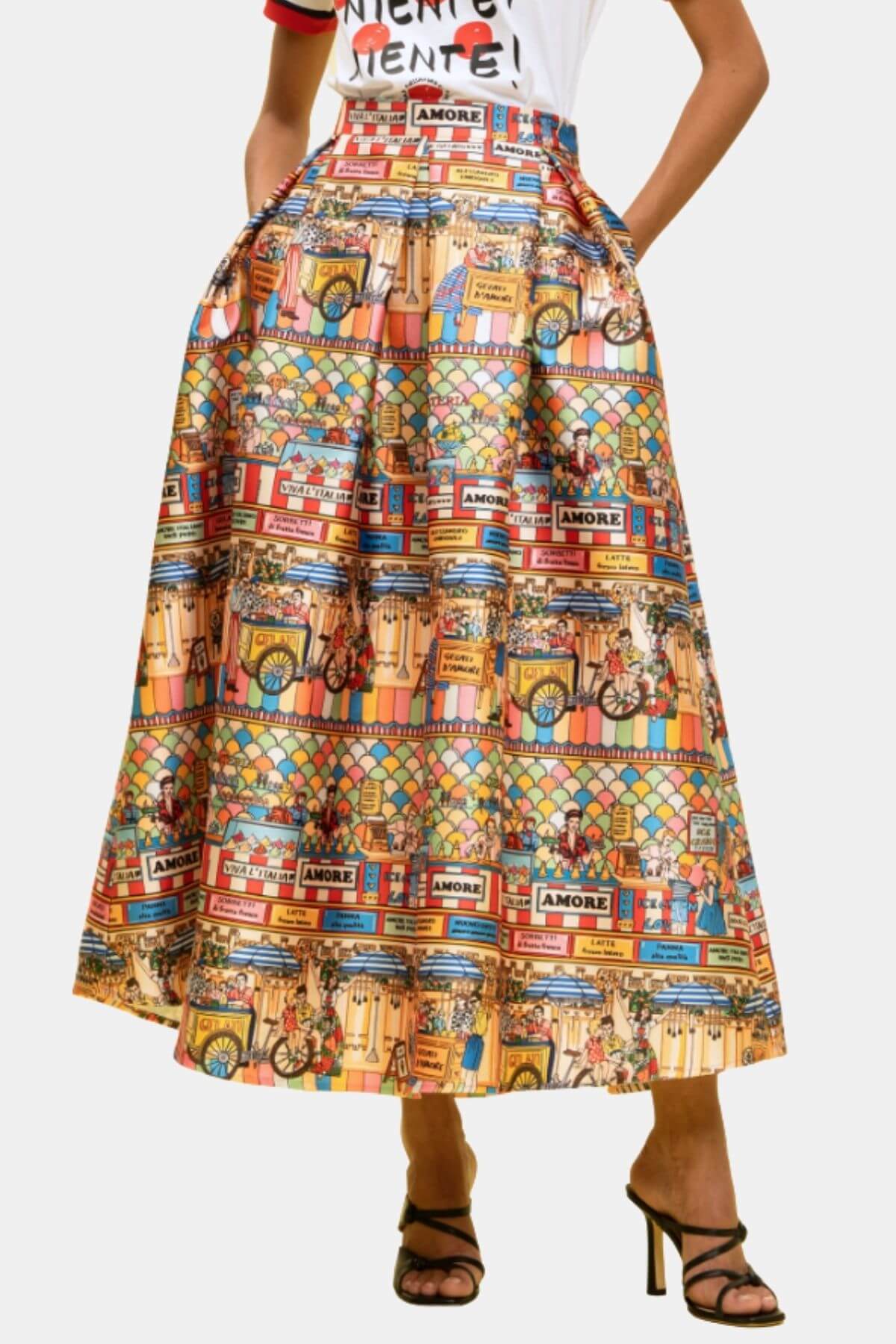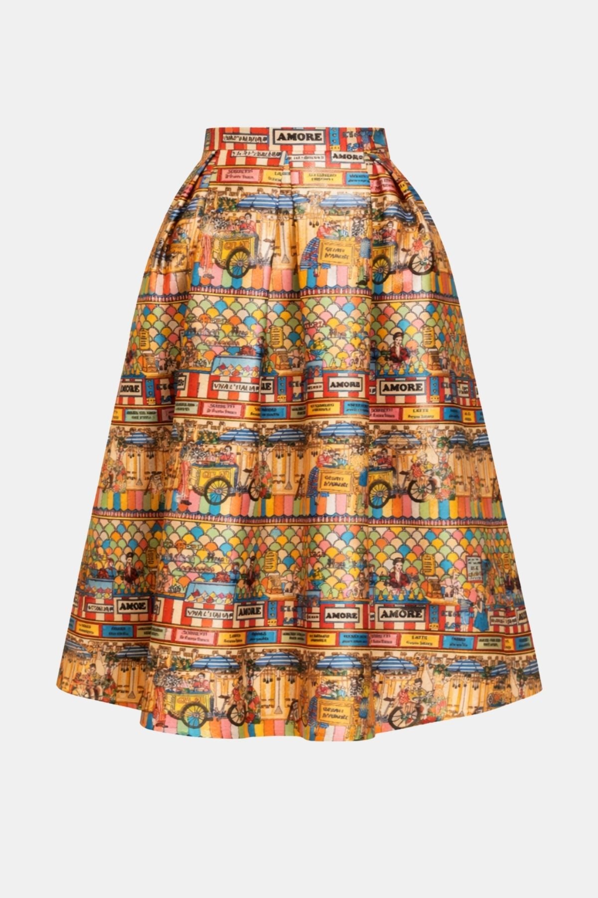 The Amore Market Midi Skirt features a vibrant, illustrated print inspired by lively Italian street scenes and colorful market stalls. Designed with a high waist and structured waistband, it flows into a voluminous A-line silhouette that enhances the waist and moves beautifully with every step. The midi length adds elegance, making it a true statement piece for standout styling.