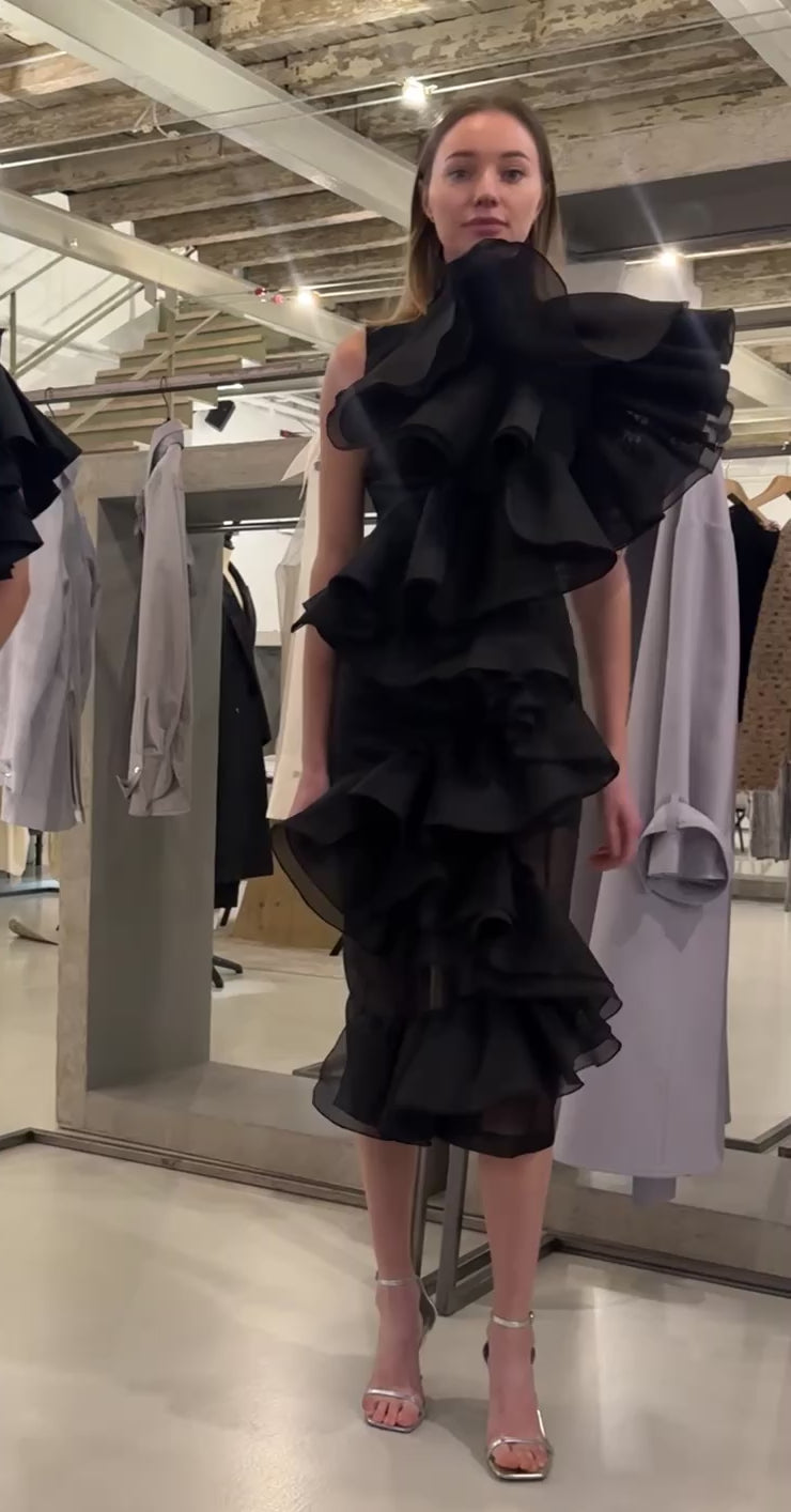 Make a bold entrance in this sculptural evening dress, defined by cascading ruffles that create movement and irresistible drama. Crafted in a lightweight sheer fabric, the dress offers a sensuous yet refined silhouette.