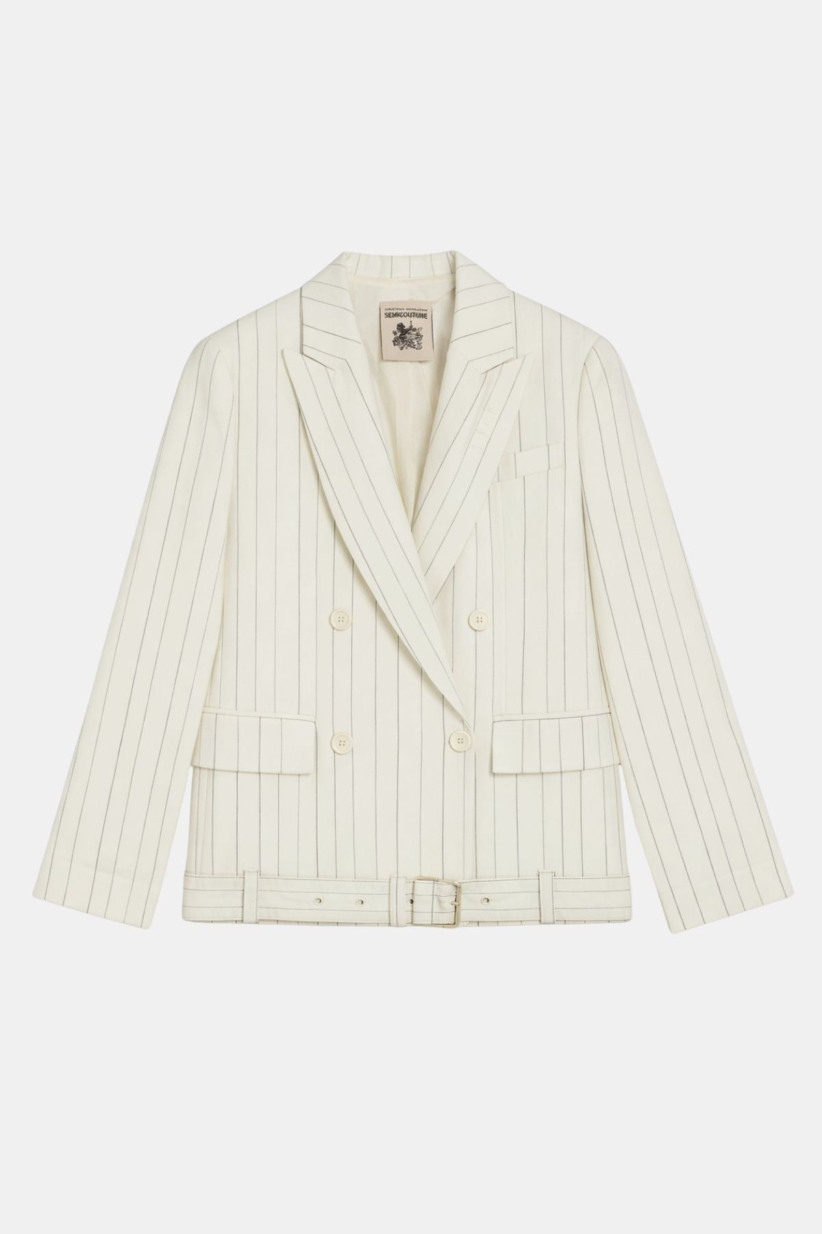 Designed viscose wool jacket with belt detailing at the hem, finished with two flap pockets and a double-breasted front closure. The silhouette has a regular fit, balancing structure and ease of wear. C