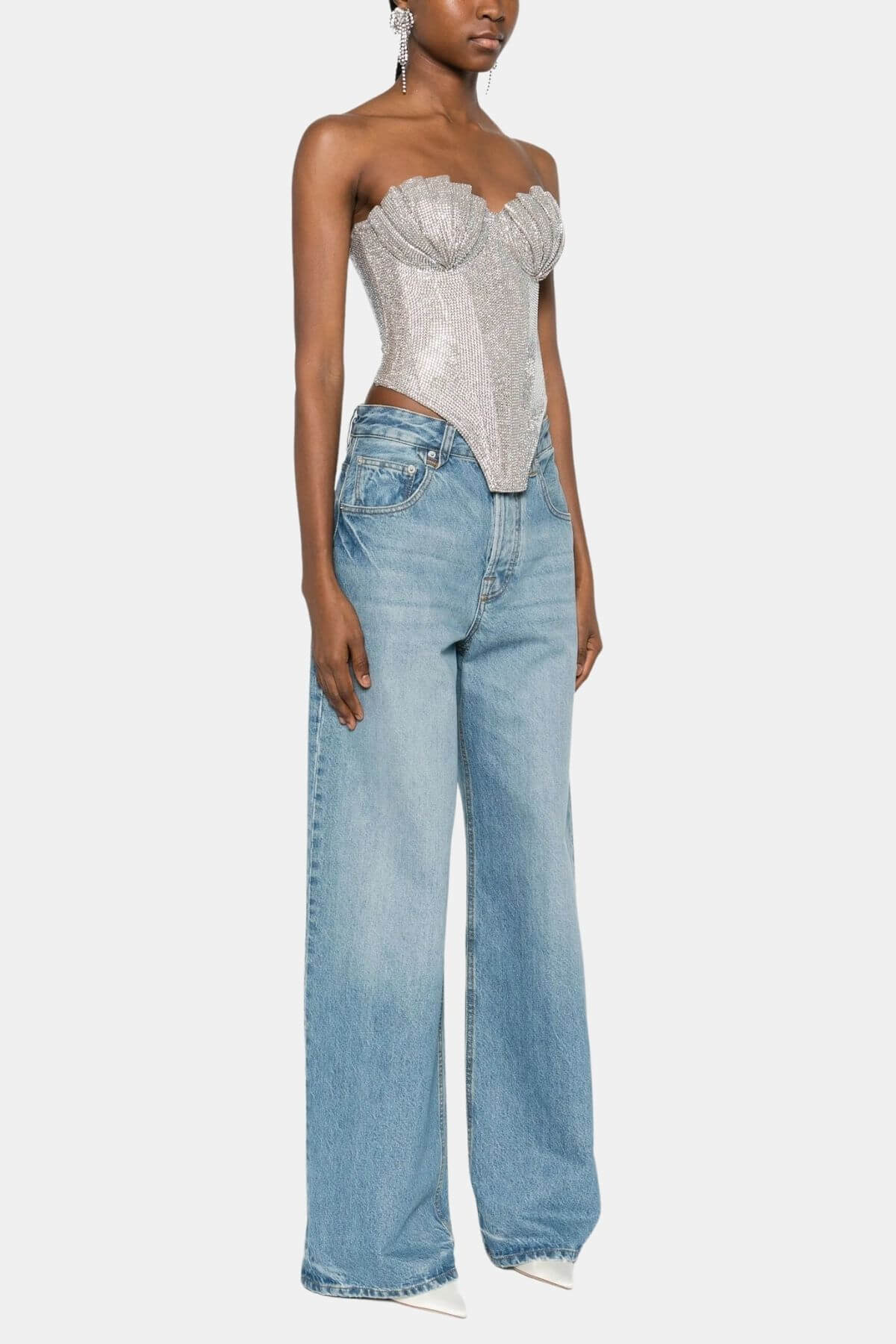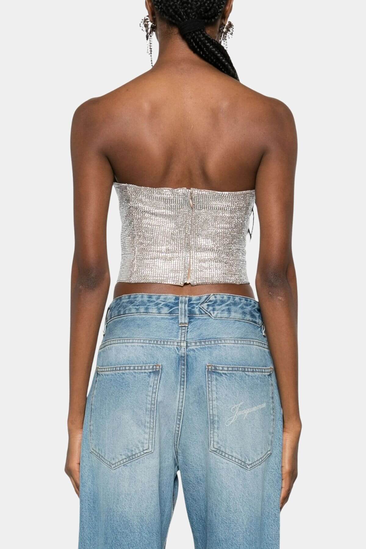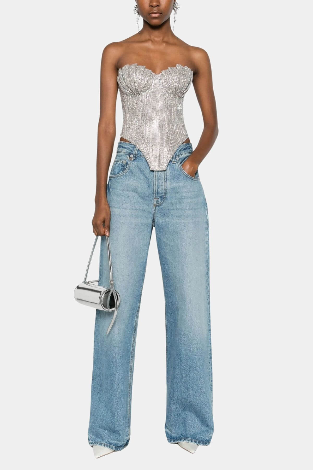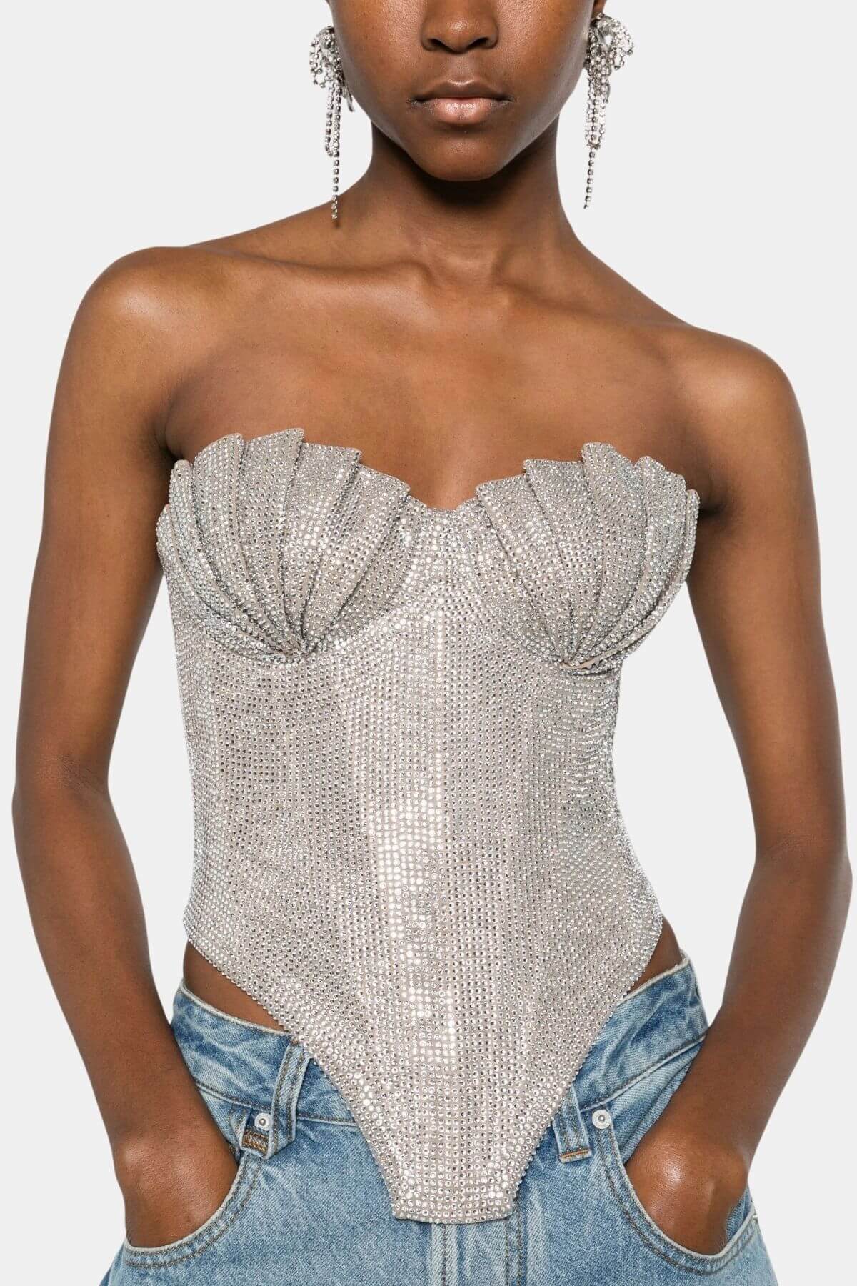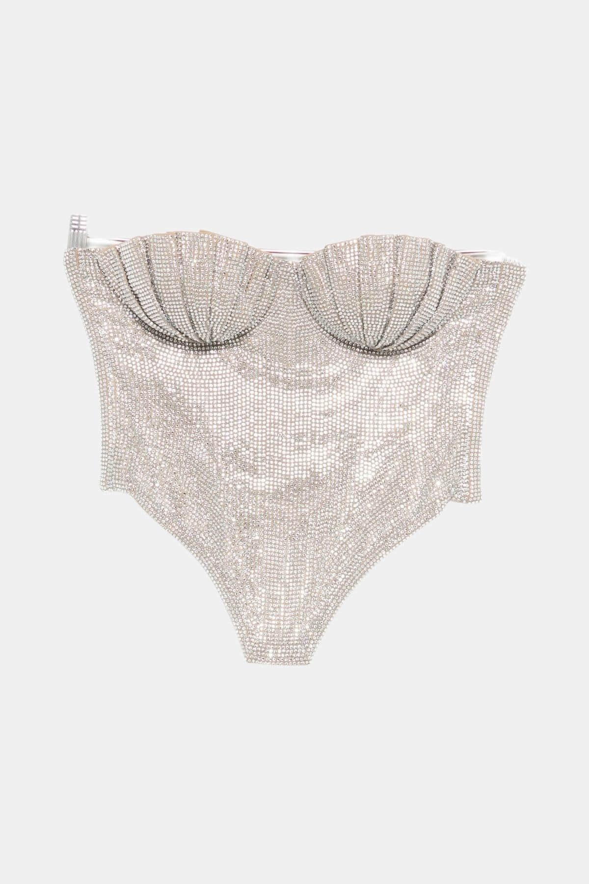 This dazzling corset, hand-embellished with hundreds of Swarovski crystals, captures the light — and every gaze in the room. The structured silhouette, inspired by vintage couture, creates a flawless hourglass shape with an ultra-modern edge.