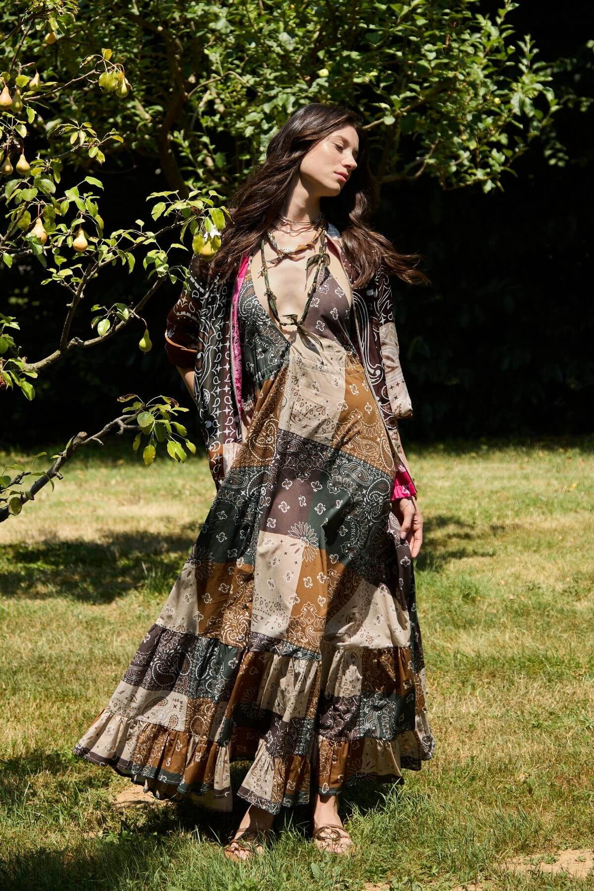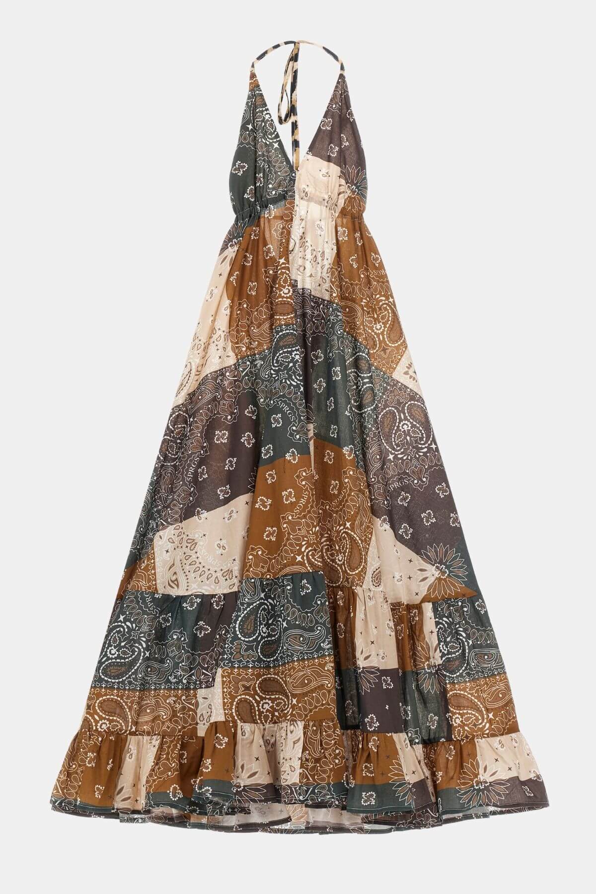 This dress is designed with a loose, flowing fit that moves beautifully with the body. The halterneck neckline creates an open, feminine silhouette, while the lightweight fabric adds soft volume. Finished with a patchwork-style print and subtle gathered details, the dress offers a relaxed yet eye-catching look.