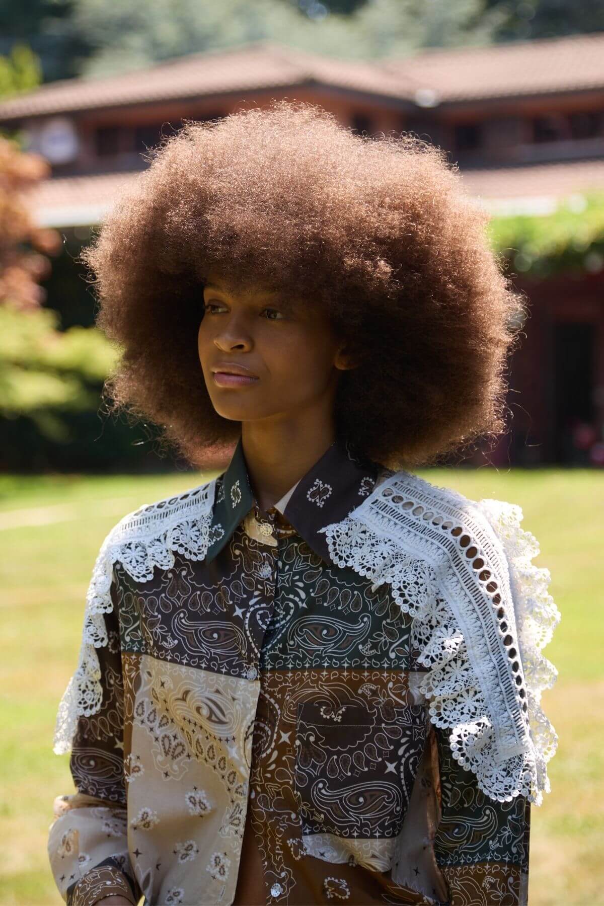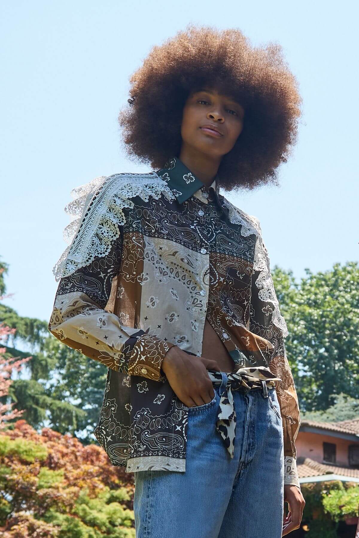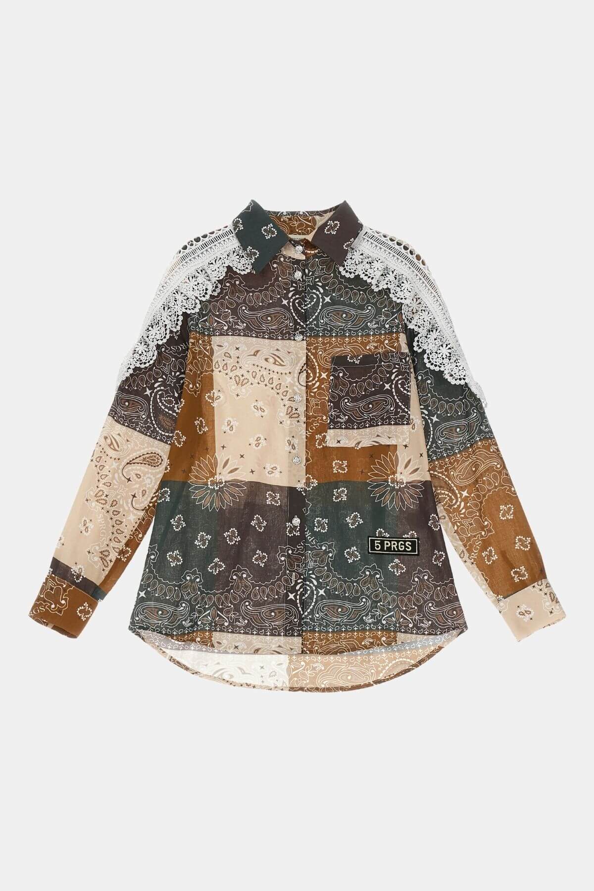 This shirt is designed with a relaxed fit for an easy, comfortable feel. The lightweight fabric drapes softly, while the classic collar and button-front closure add structure. Finished with a patchwork-inspired print and delicate lace details, it combines casual wearability with distinctive design.