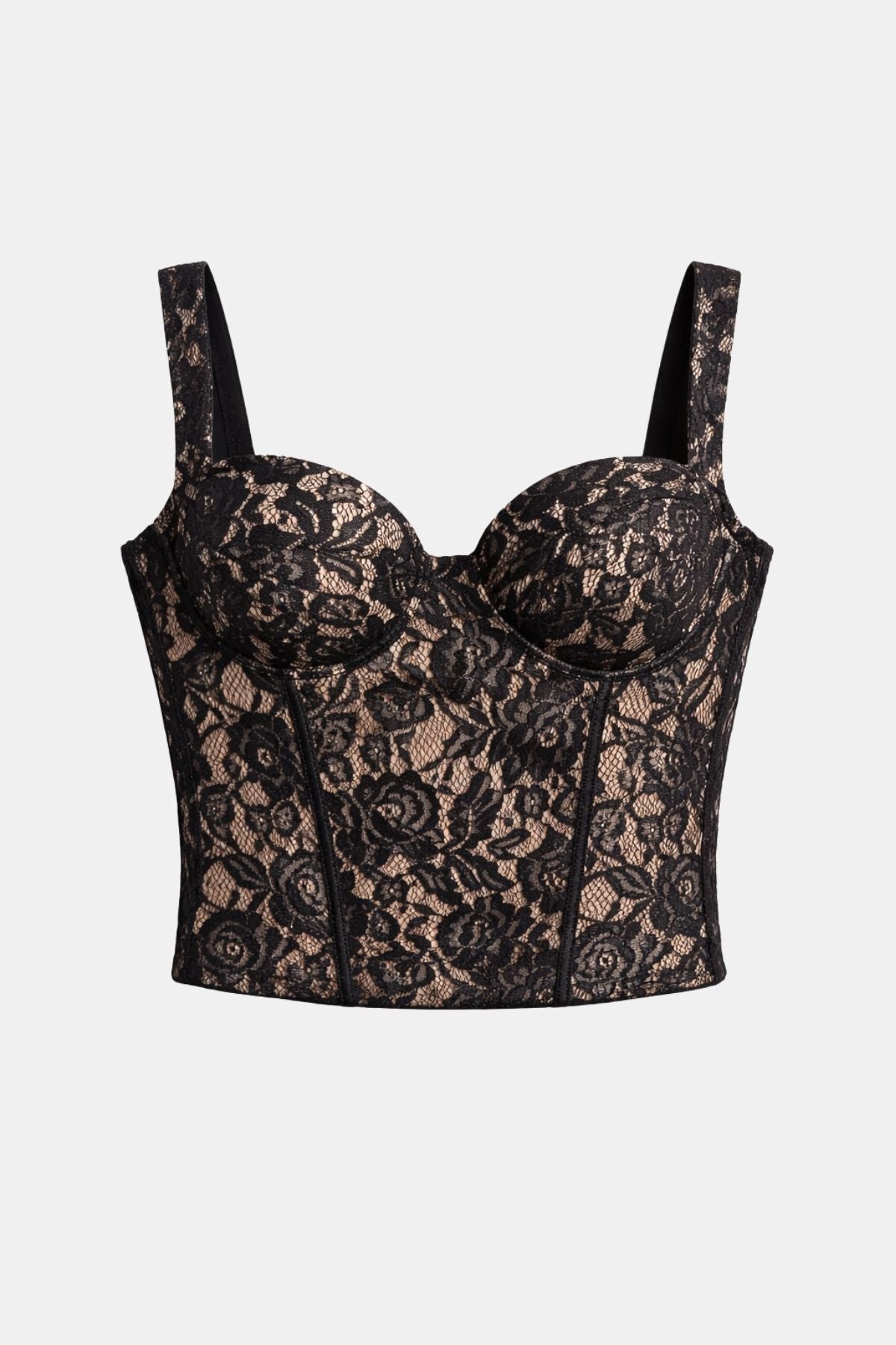 This black lace bustier top from Couture is Forever features a structured, form-fitting silhouette that accentuates the waist. Sleek and minimal, it channels modern femininity with a confident edge. Pair with matching Blazer Jacket  and pants for a top tier look.