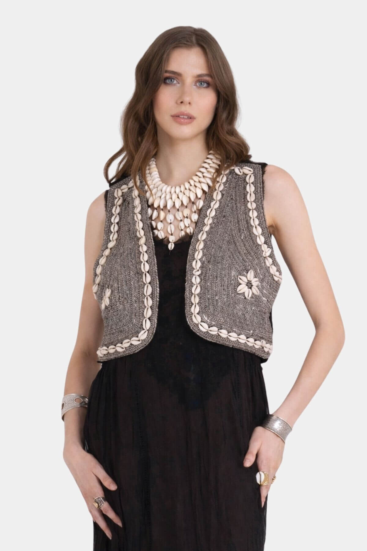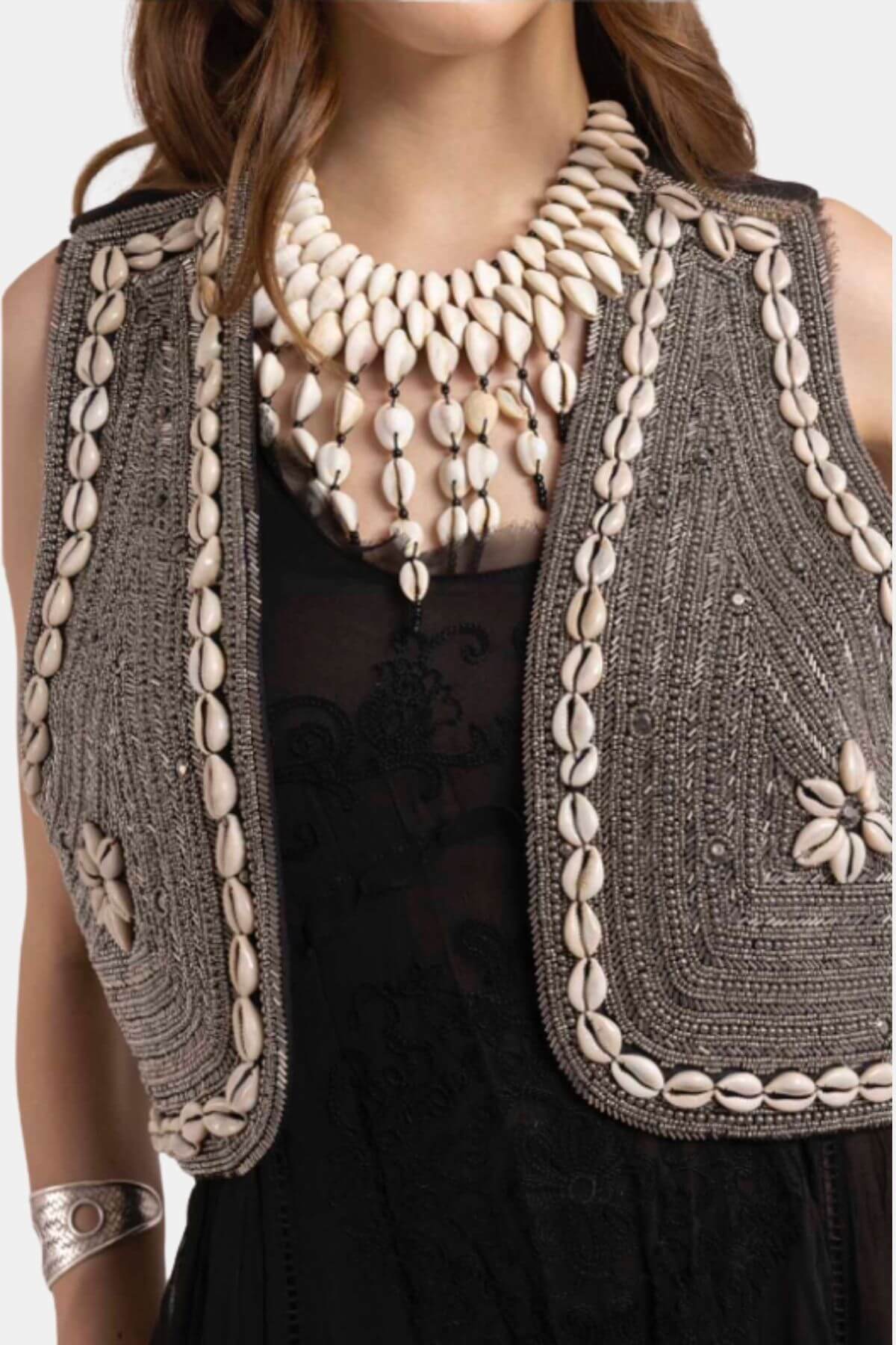 This handcrafted vest is rich in texture and detail, designed to elevate any outfit with a distinctive bohemian touch. Crafted in a structured woven fabric, it features intricate embroidery and is beautifully trimmed with delicate shell embellishments along the edges and front panels. A subtle floral motif adds an artisanal finish. Cut in a cropped silhouette with an open front, it offers a flattering, slightly fitted shape that enhances the waist while allowing effortless layering. Perfect over dresses or lightweight tops, it adds depth, character, and refined craftsmanship to any look.