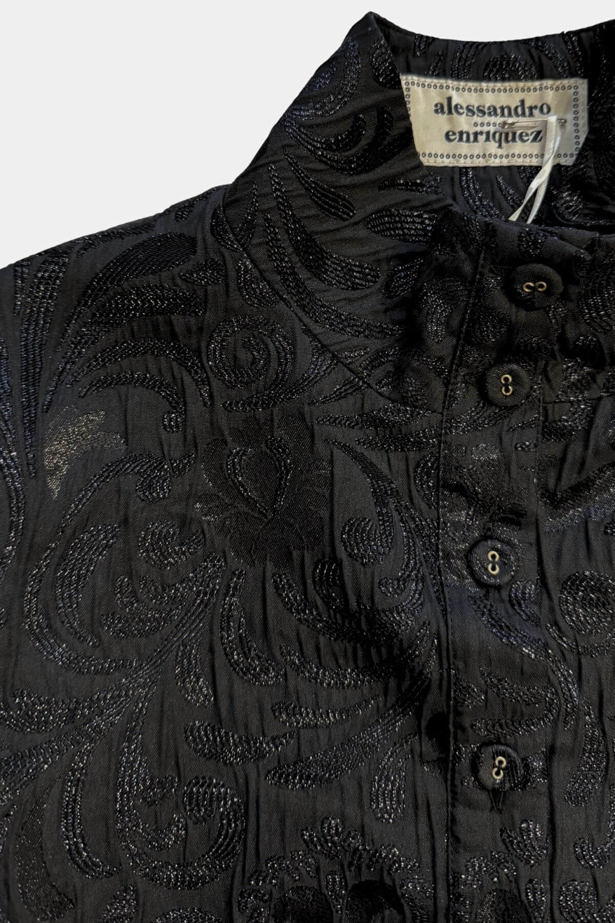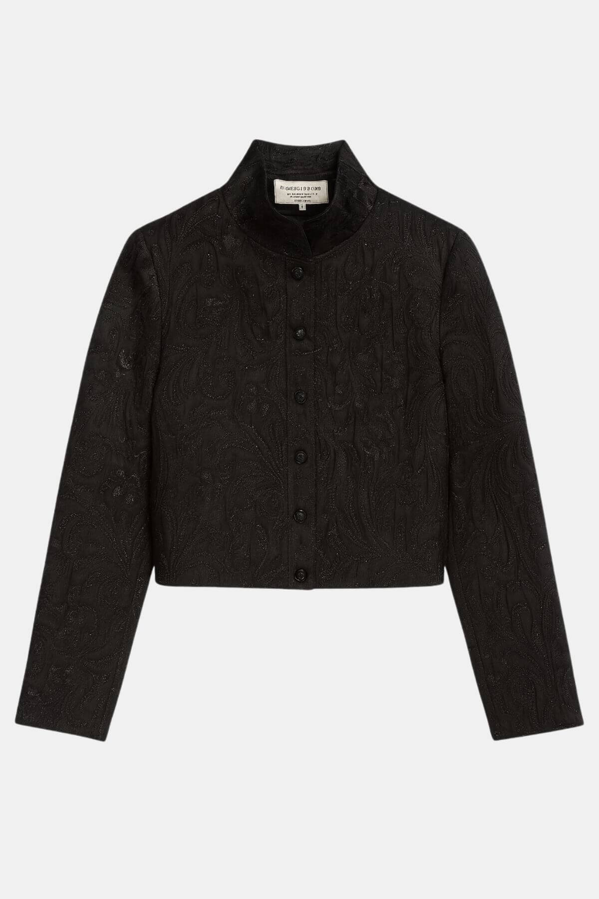 An exclusive cropped brocade blazer crafted with intricate textured detailing. Its structured silhouette and refined high collar exude timeless sophistication, making it a standout piece for those who appreciate understated luxury.