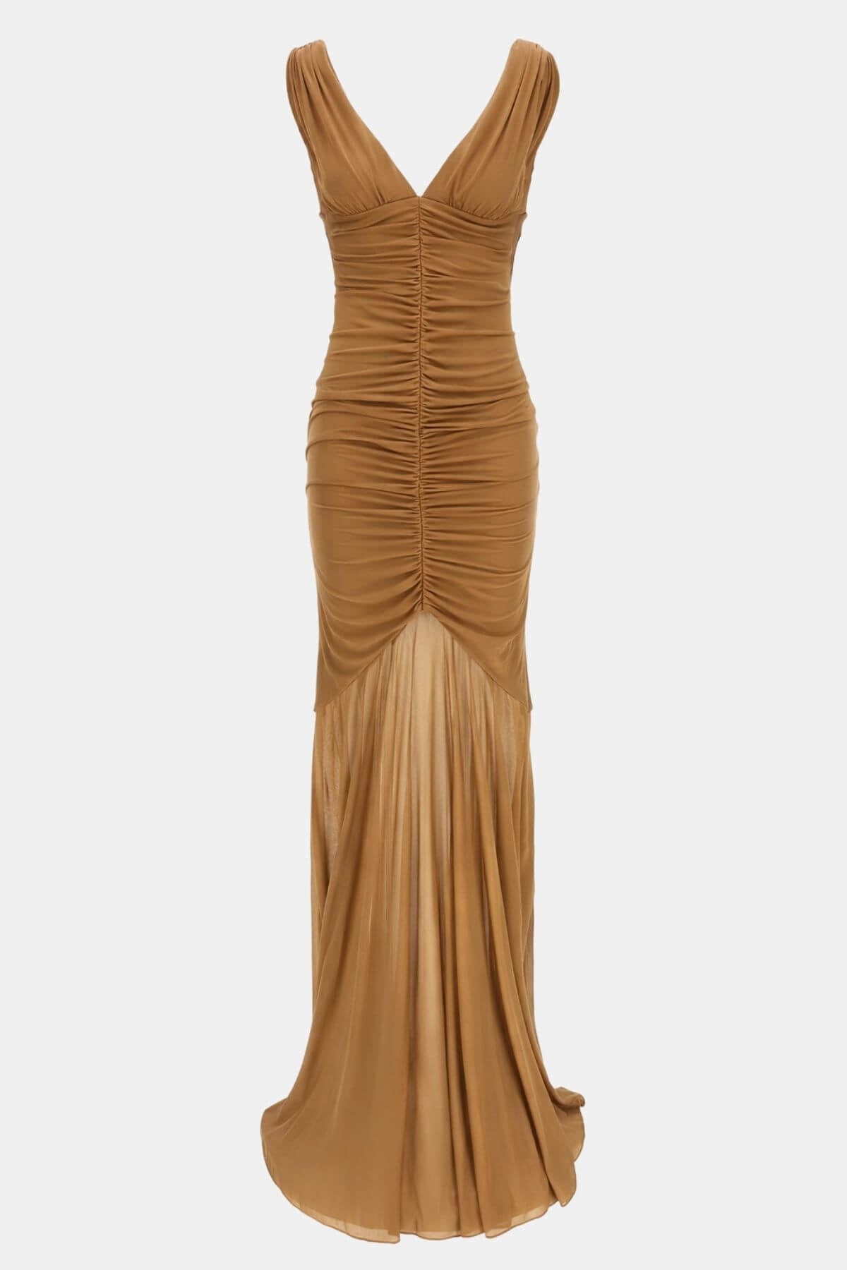Elegant long dress crafted from stretch viscose jersey with a flattering mermaid silhouette. Designed with a deep V-neckline, sleeveless cut, and soft ruching at both front and back for a sculpted fit. Finished with a discreet side zip closure for ease and comfort. A timeless piece ideal for evening events and special occasions.