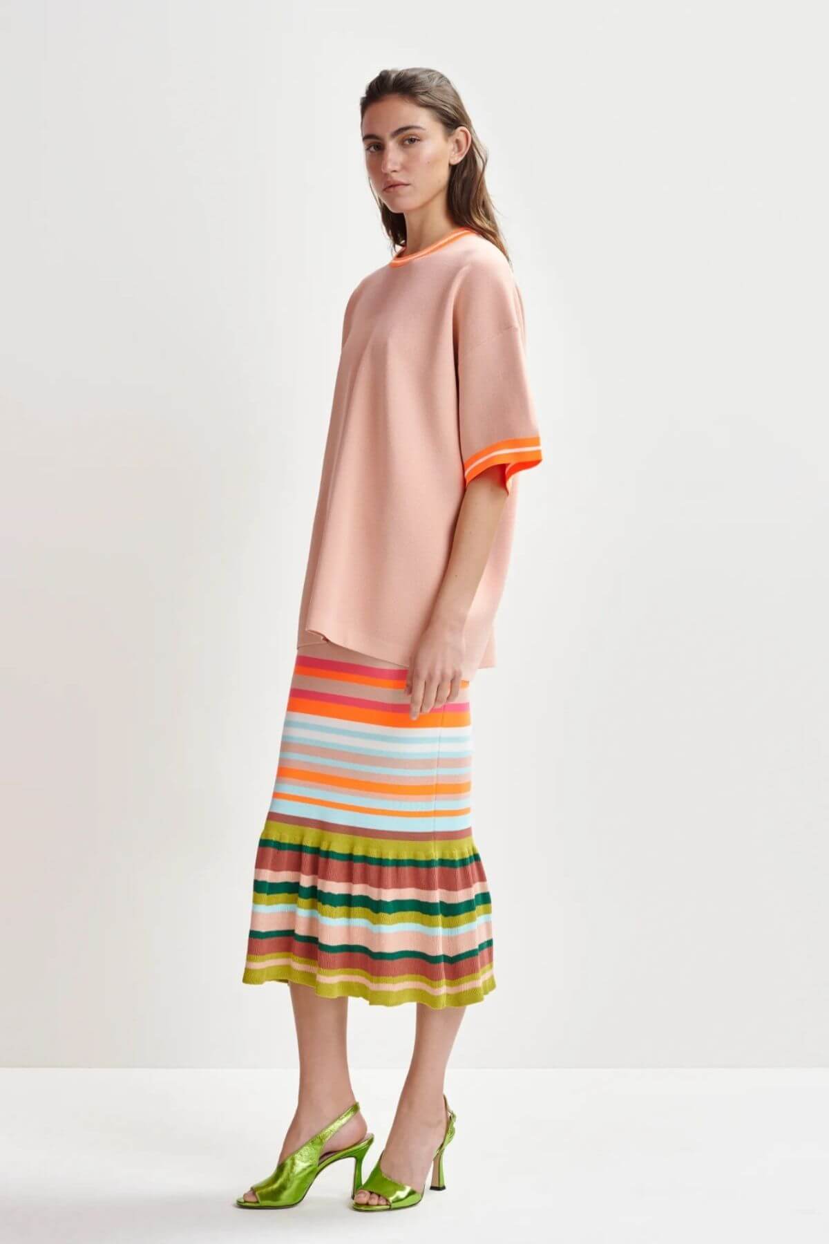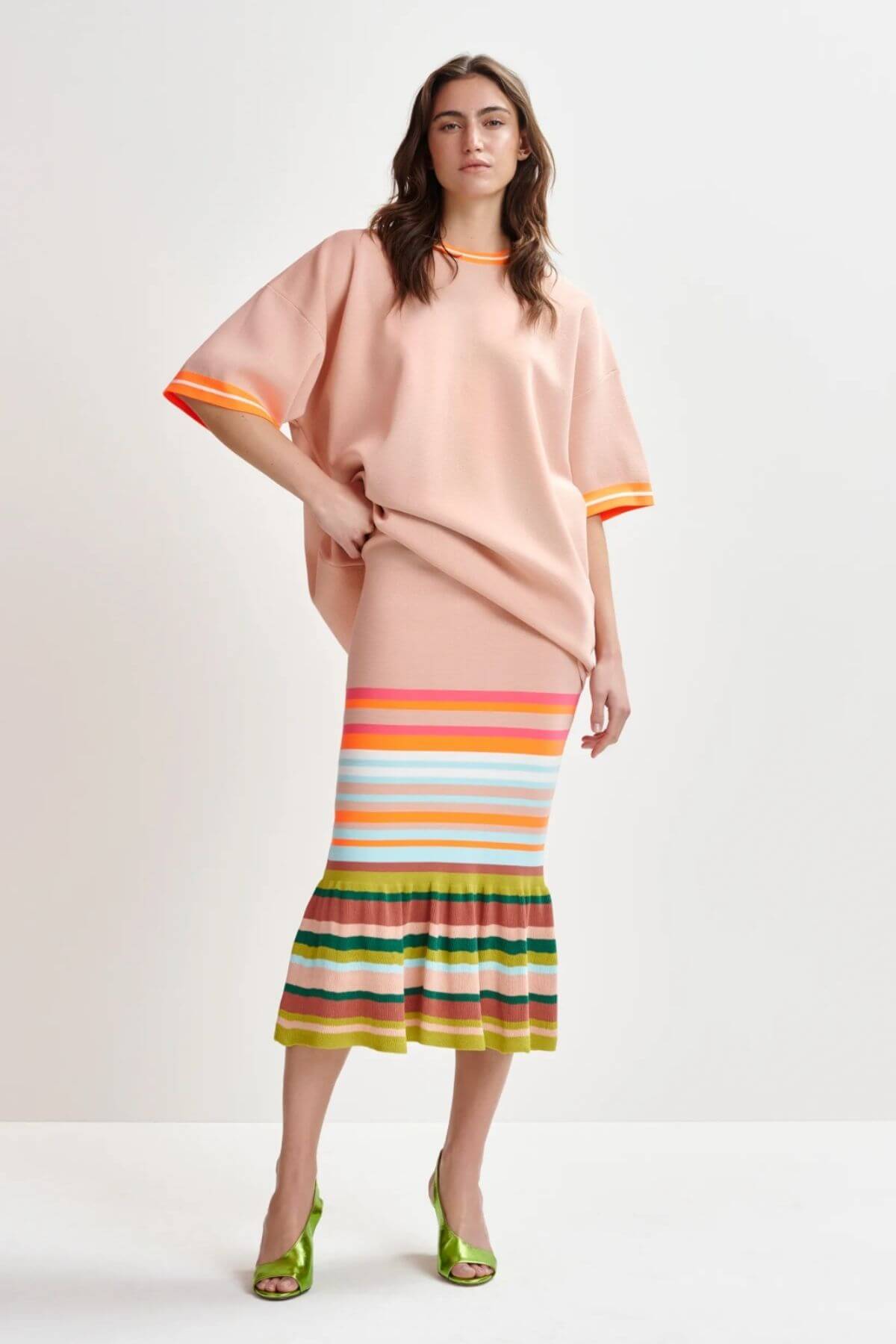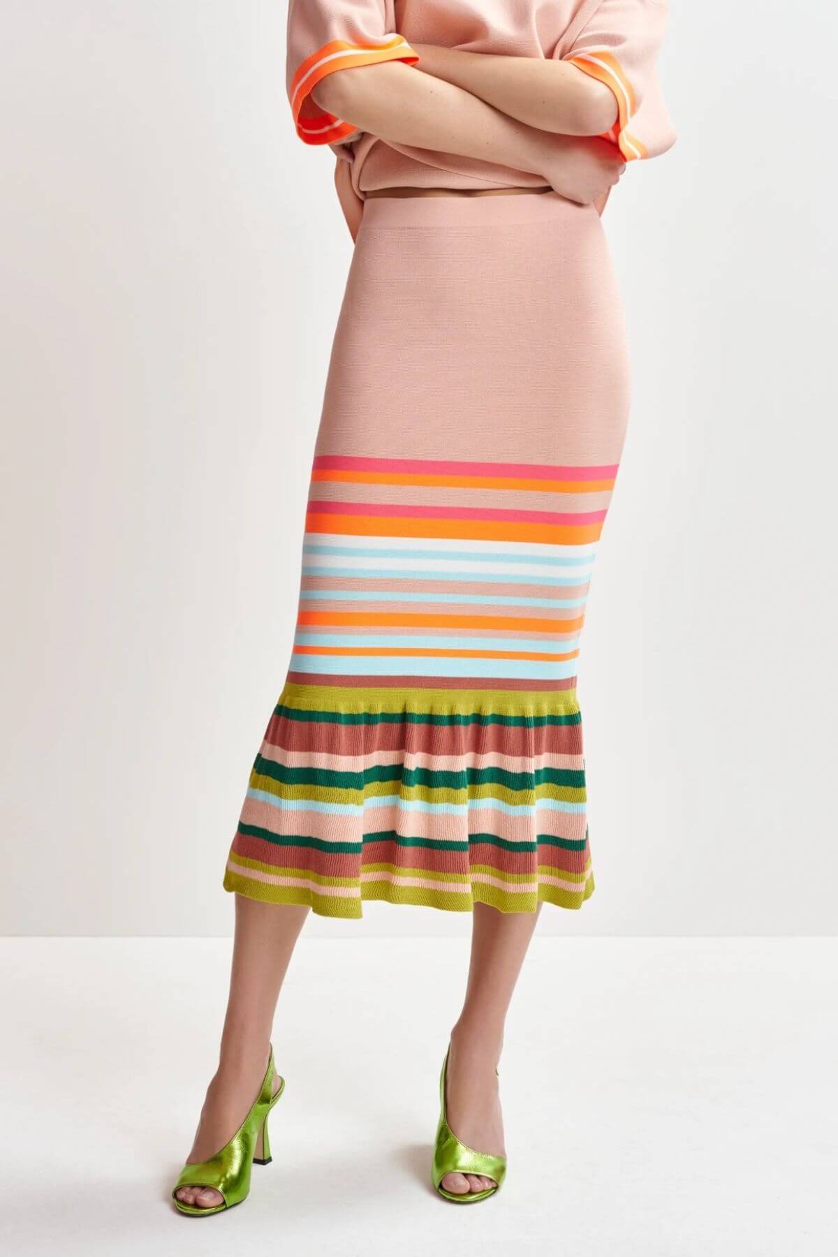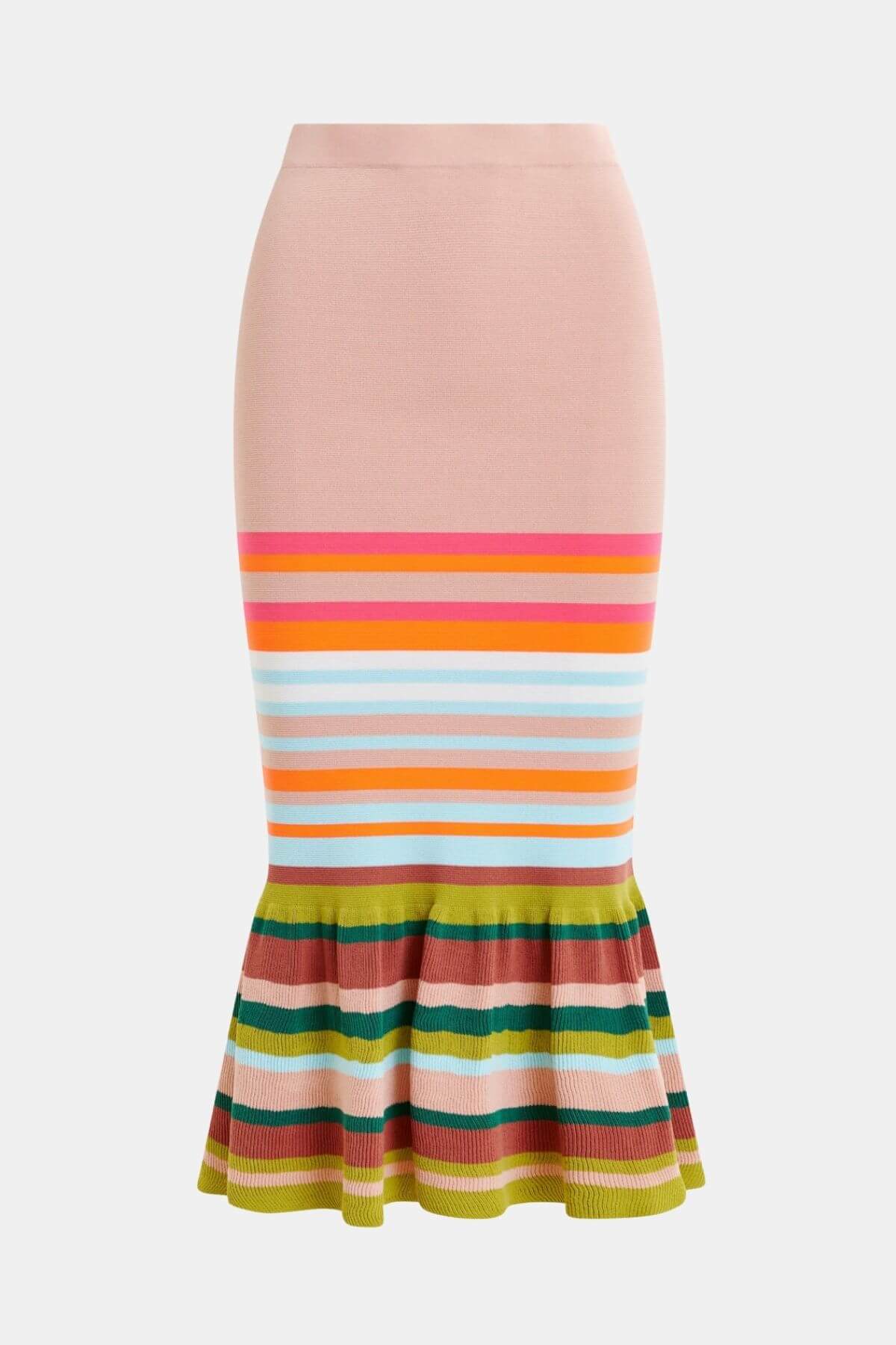 Figure-hugging skirt is knitted with stripes in a simple and refined silhouette, topped with a comfortable elasticated waistband. It falls to a flouncy midi length thanks to the ruffled tier inserted just above the knees.
