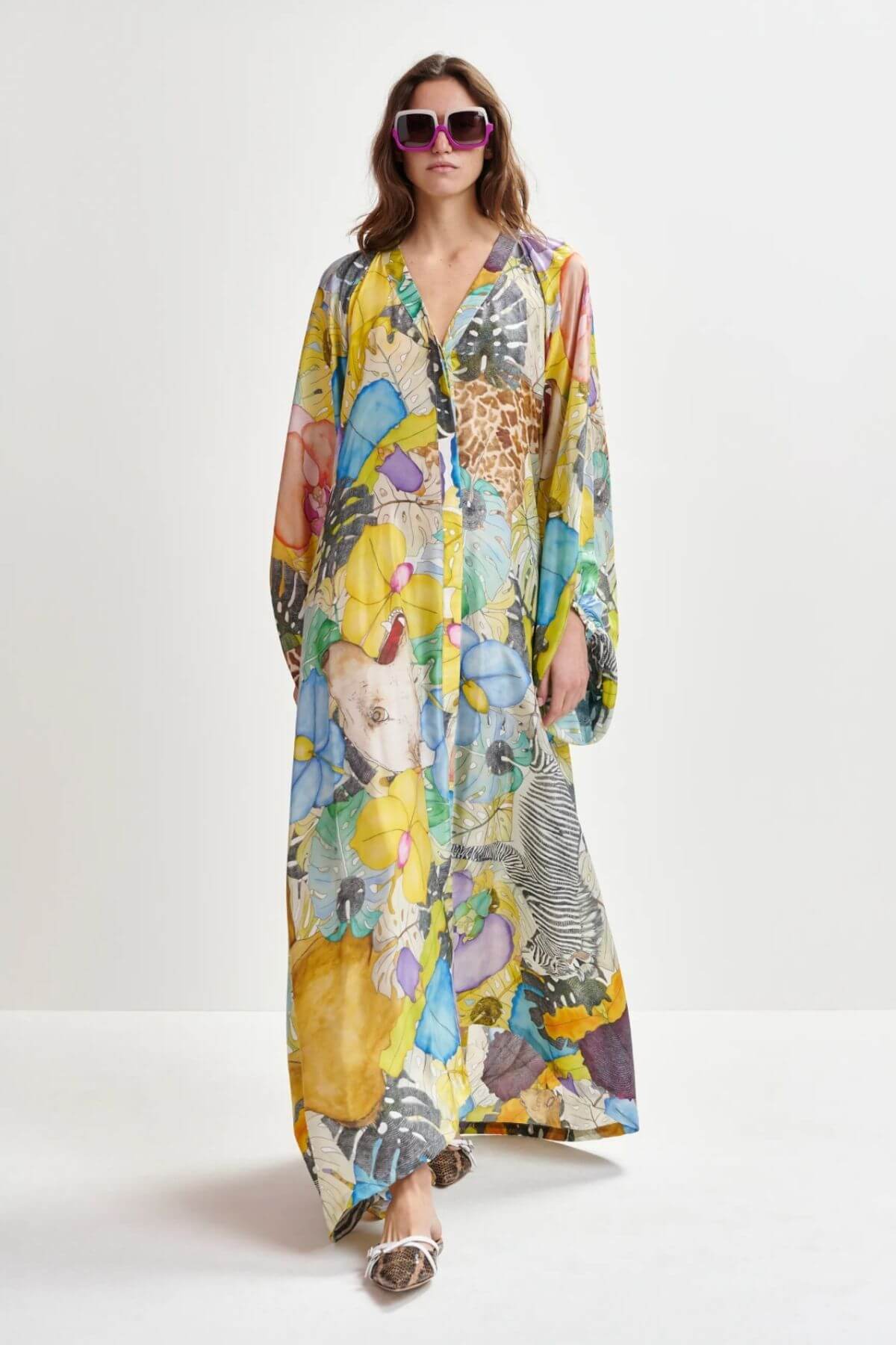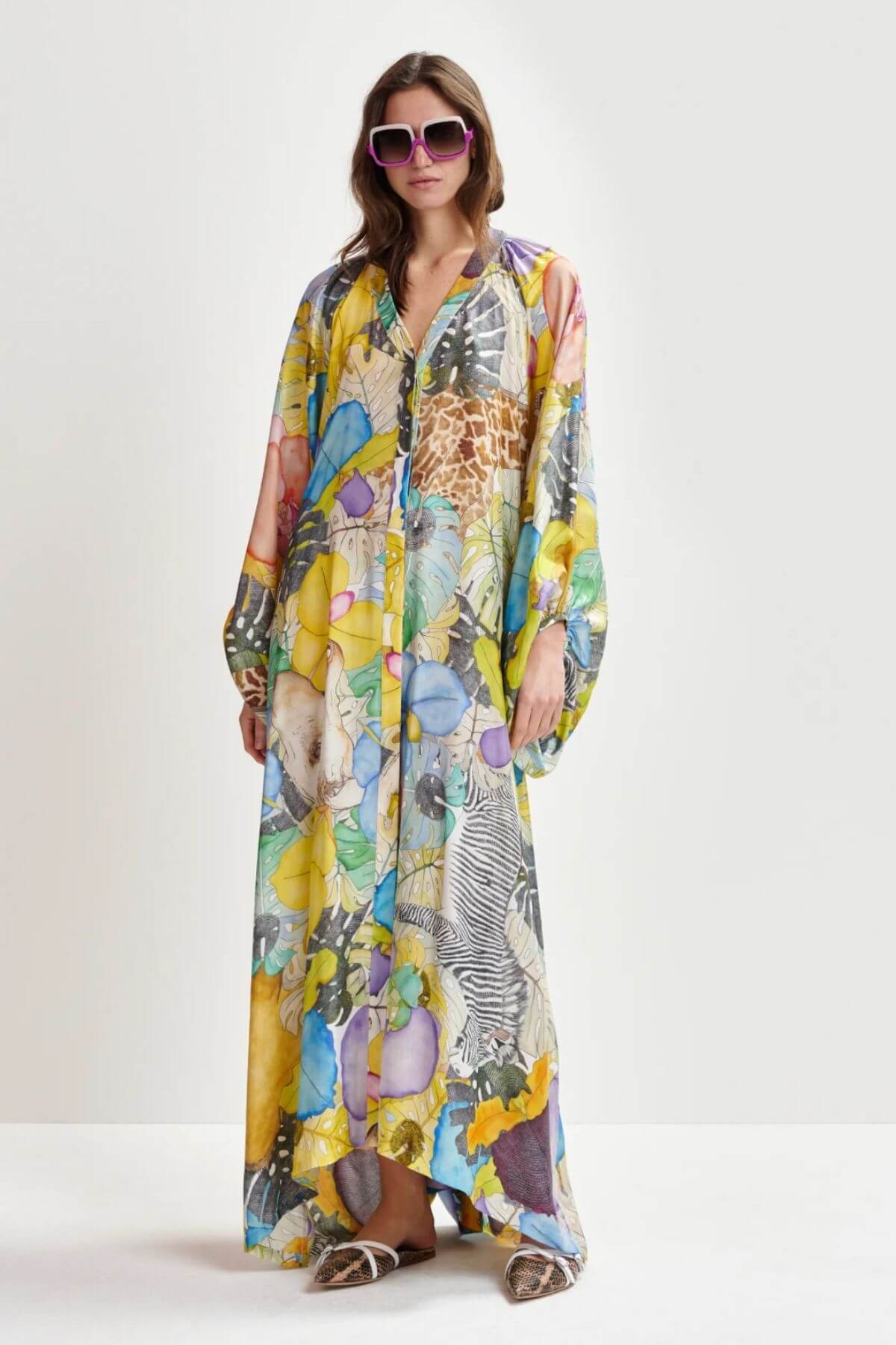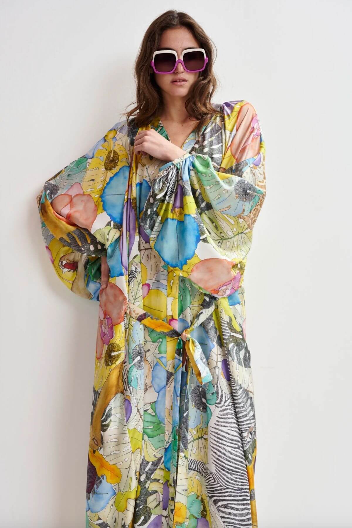 100% silk maxi dress is designed for an oversized, free-flowing silhouette. Featuring raglan shoulders and voluminous sleeves, it creates a dramatic yet refined look. Panelled seams and inverted pleats add subtle structure, while slit pockets offer functionality. A self-fabric belt allows you to cinch the waist for a more defined shape. Finished with a hidden button fastening at the neckline for a seamless look.