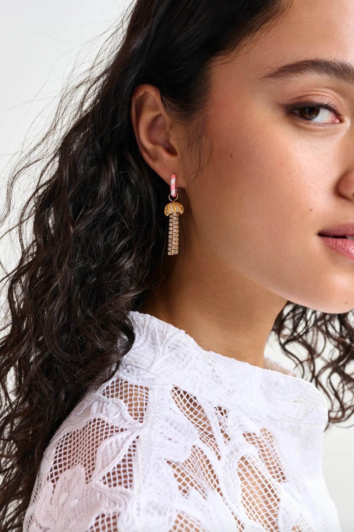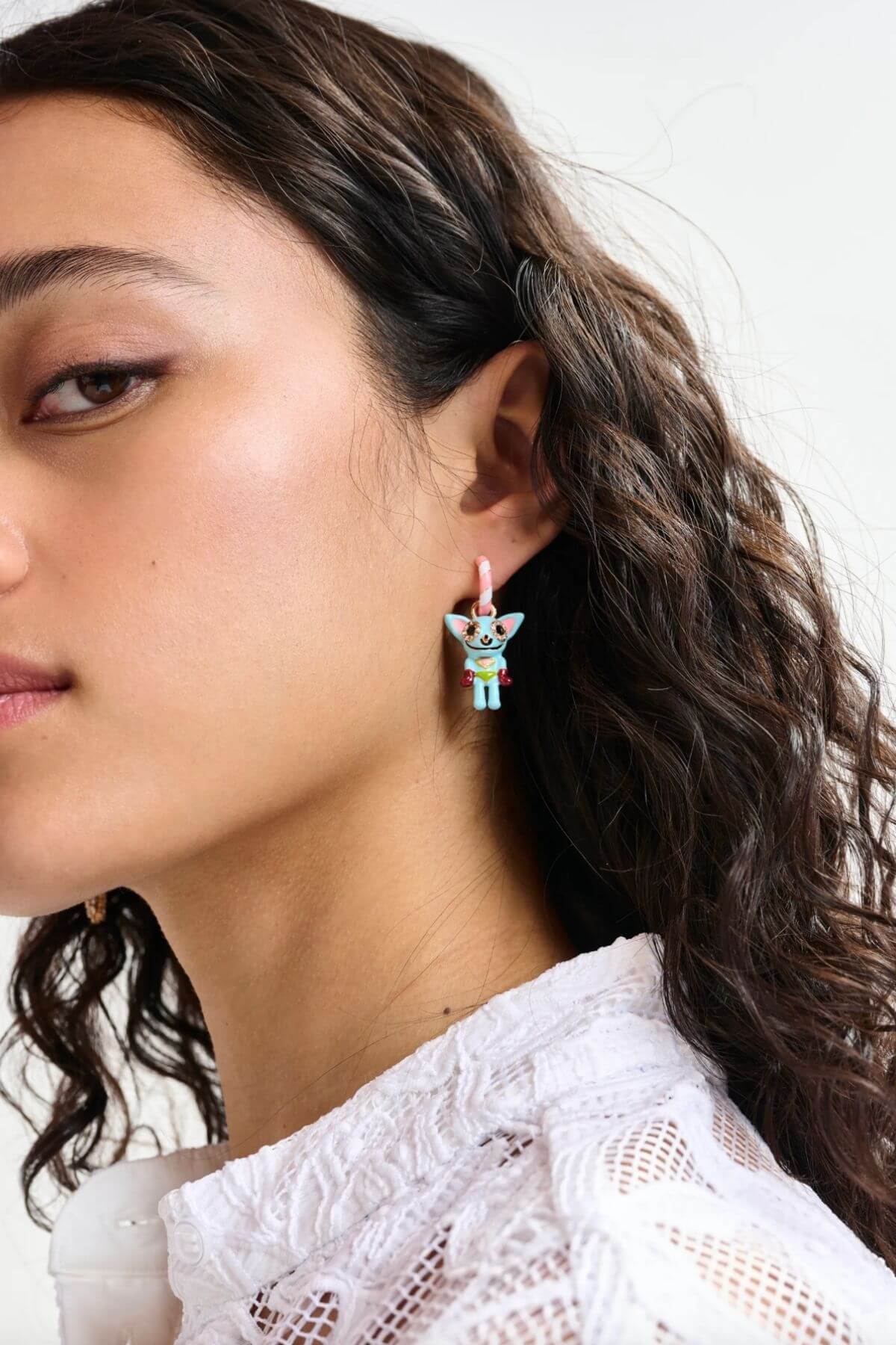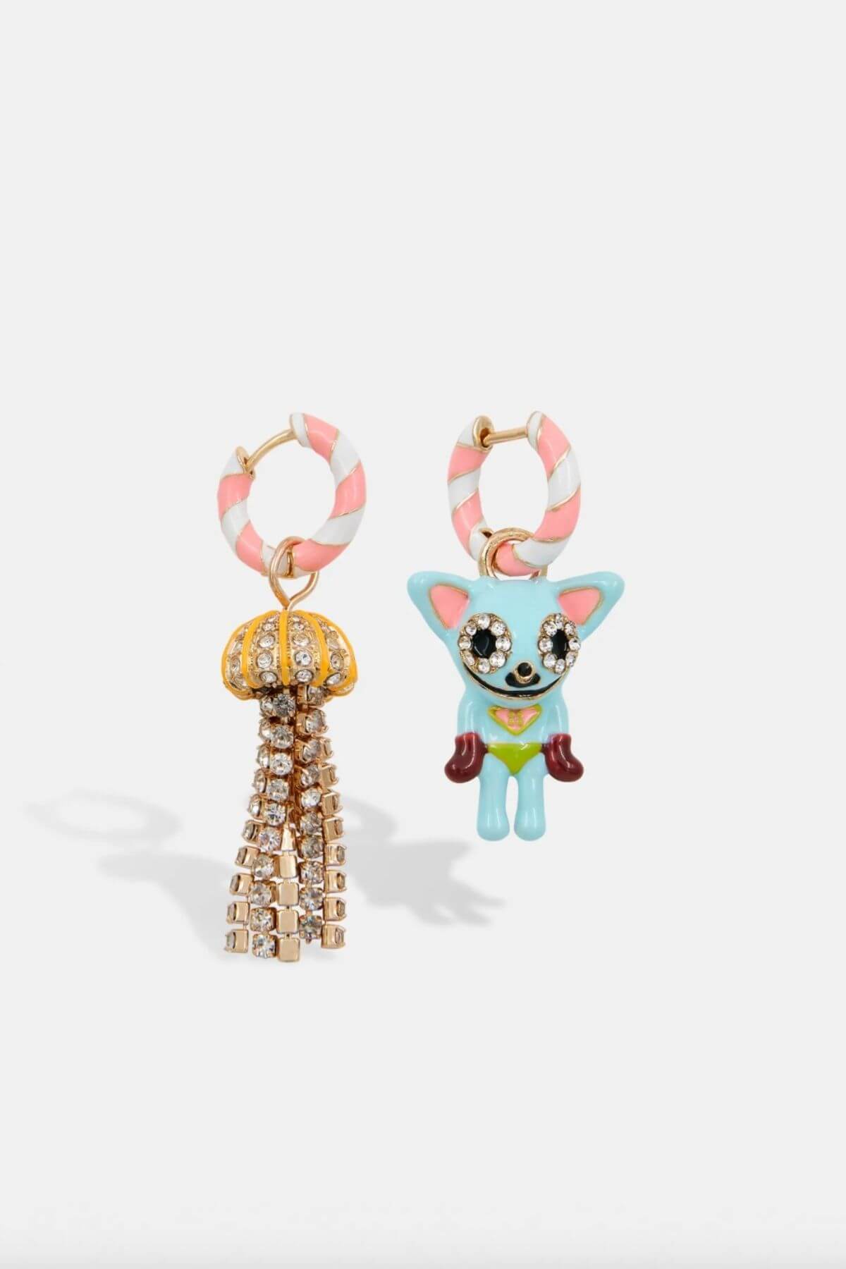 Jelly much in love with this look! One hoop features a rhinestone-encrusted enamel cat, while the other showcases a rhinestone-encrusted jellyfish pendant.