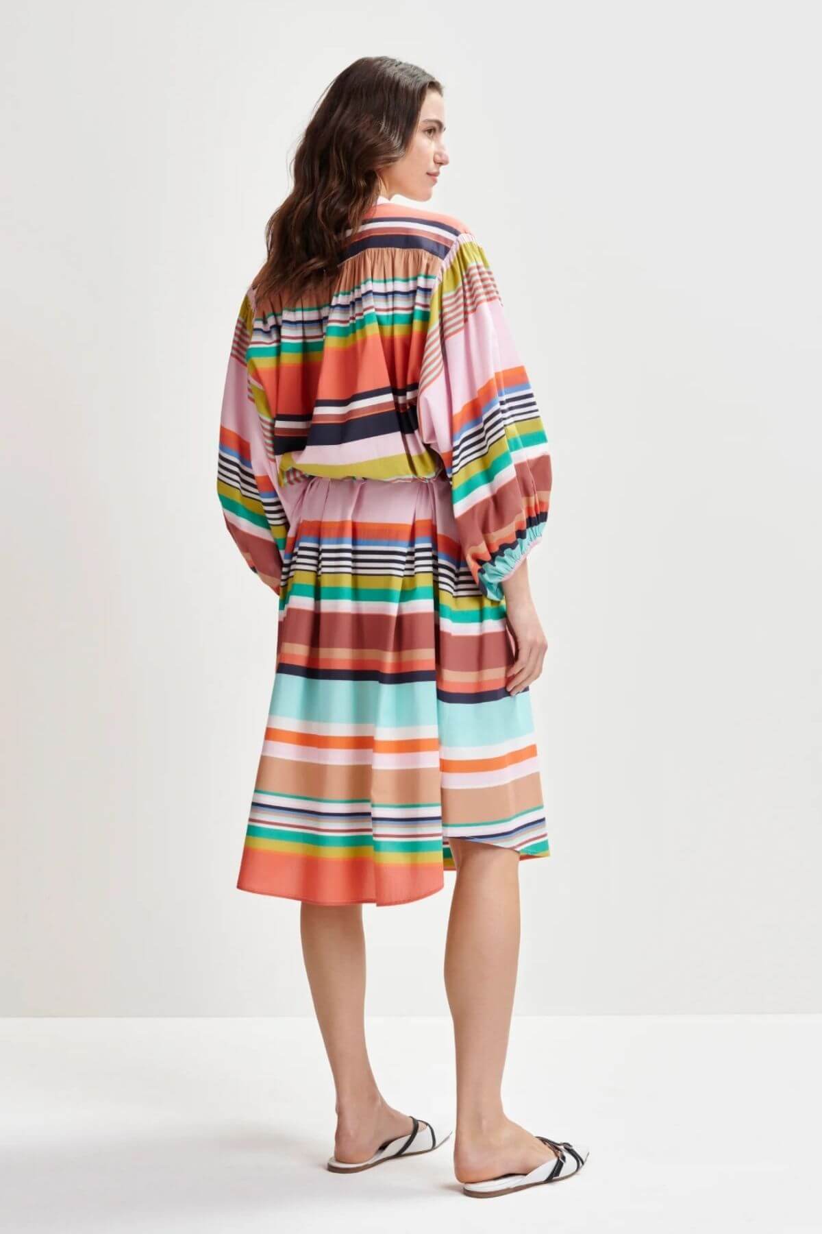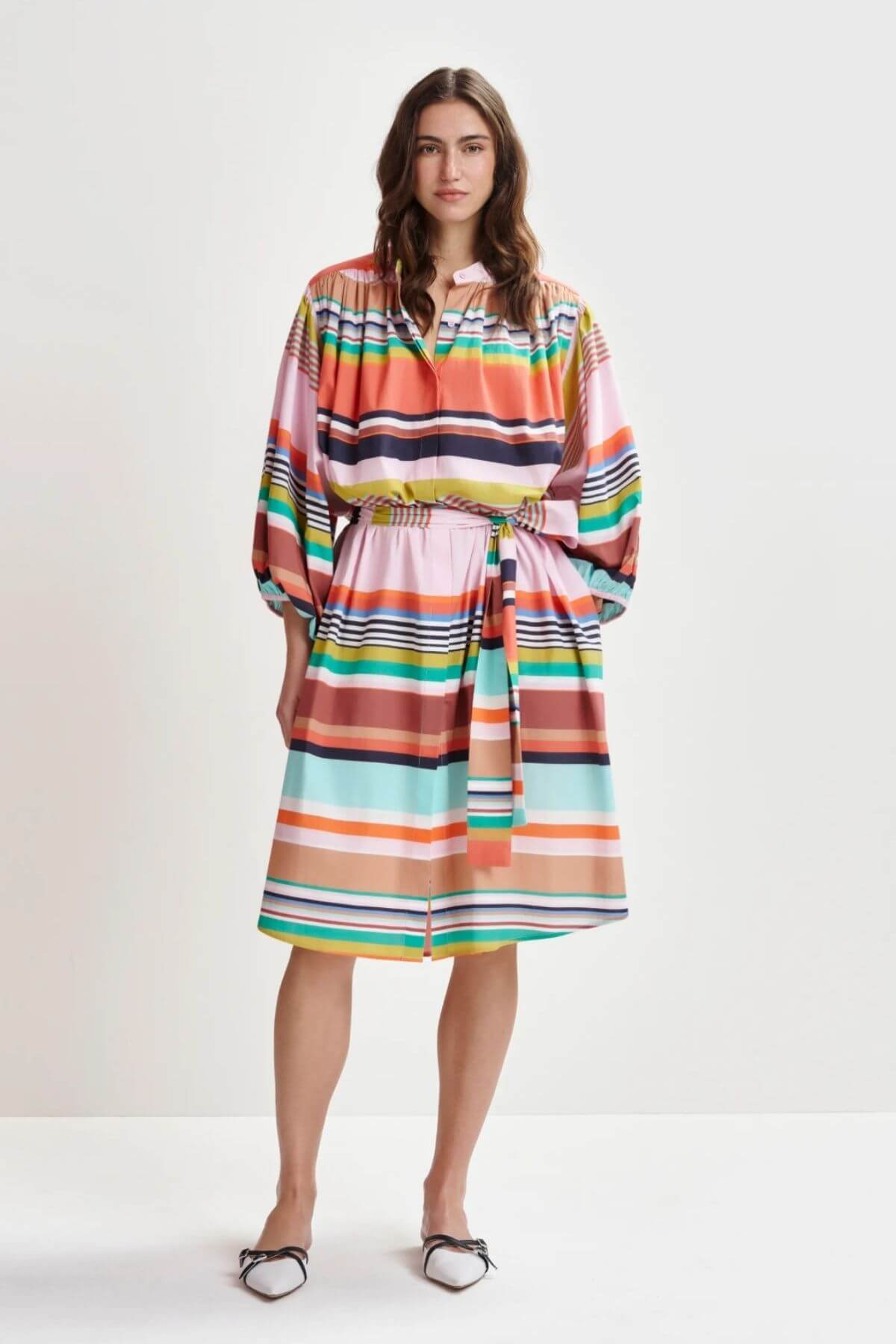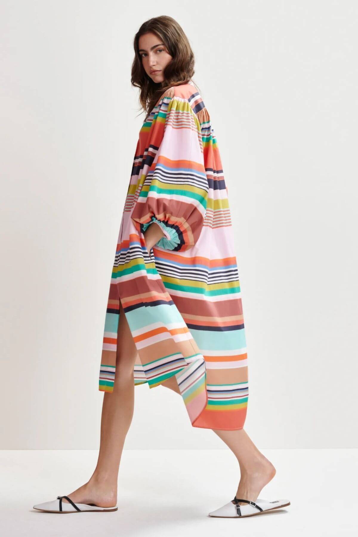 Made from 100% cotton this shirt knee-length dress offers a smart yet effortless choice for casual days, featuring a playful striped pattern. The oversized silhouette is complemented by a mandarin collar and voluminous 3/4 sleeves gathered at the elasticated cuffs for added shape.