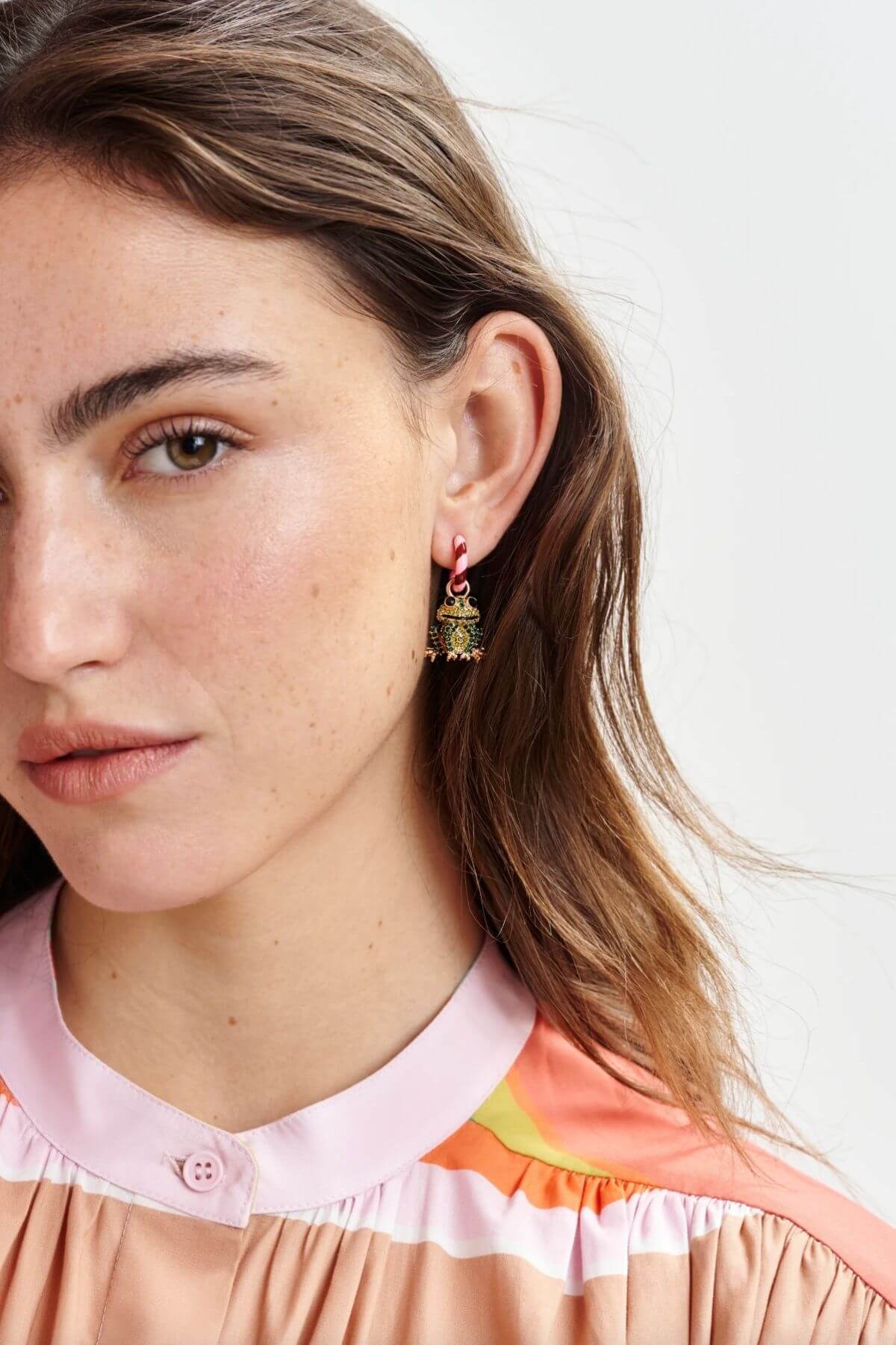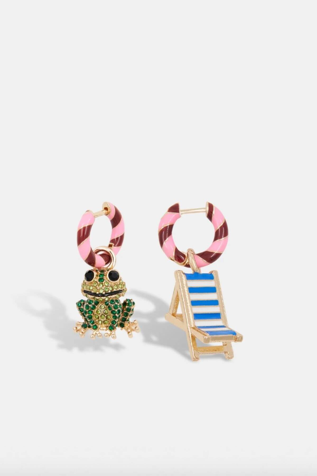 Sit back, relax, and hop into style! One hoop features a rhinestone-encrusted frog, while the other showcases an enamel chair pendant.