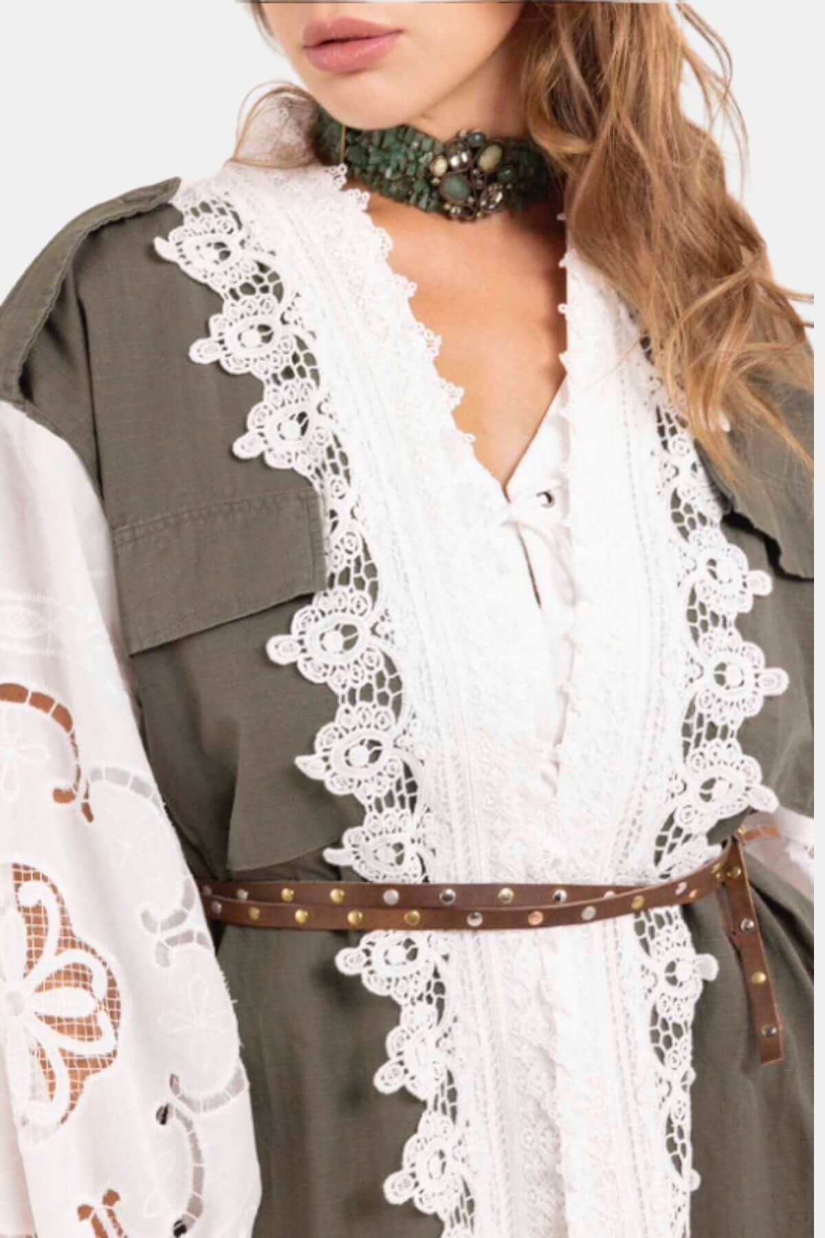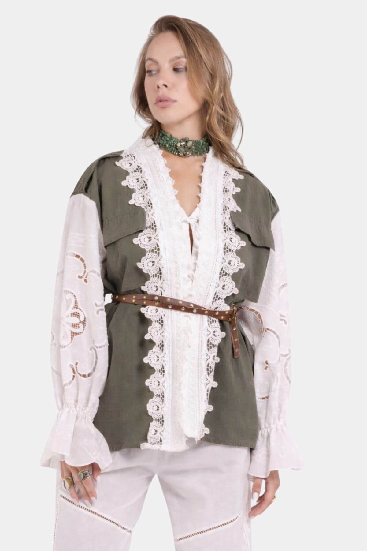This statement jacket blends utility influences with romantic detailing for a distinctive, modern look. Crafted in a structured olive fabric, it features oversized flap pockets and a relaxed, straight silhouette that drapes effortlessly on the body. Delicate lace panels run along the front, adding contrast and texture, while the voluminous sheer sleeves with gathered cuffs create soft movement and feminine balance. The adjustable belt at the waist allows you to define the fit, offering the option of a loose, laid-back shape or a more cinched, tailored silhouette. Perfect for layering, this jacket combines structure, texture, and versatility in one refined piece.