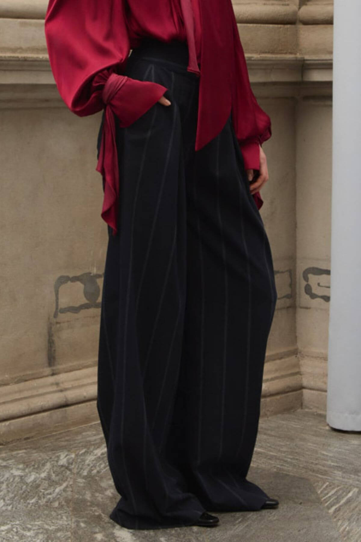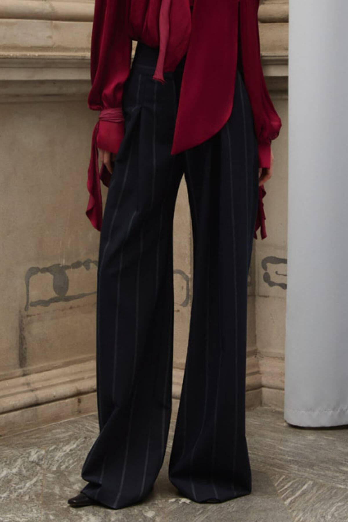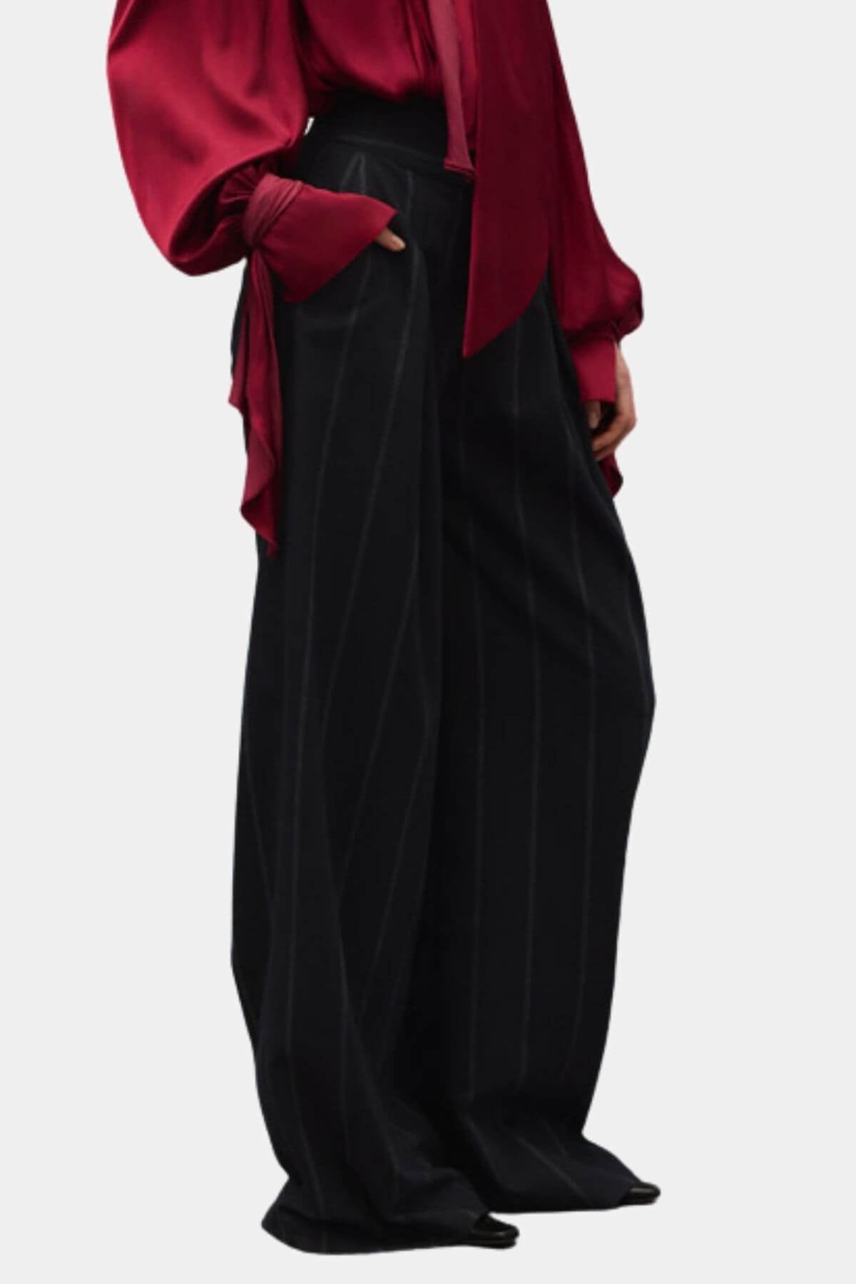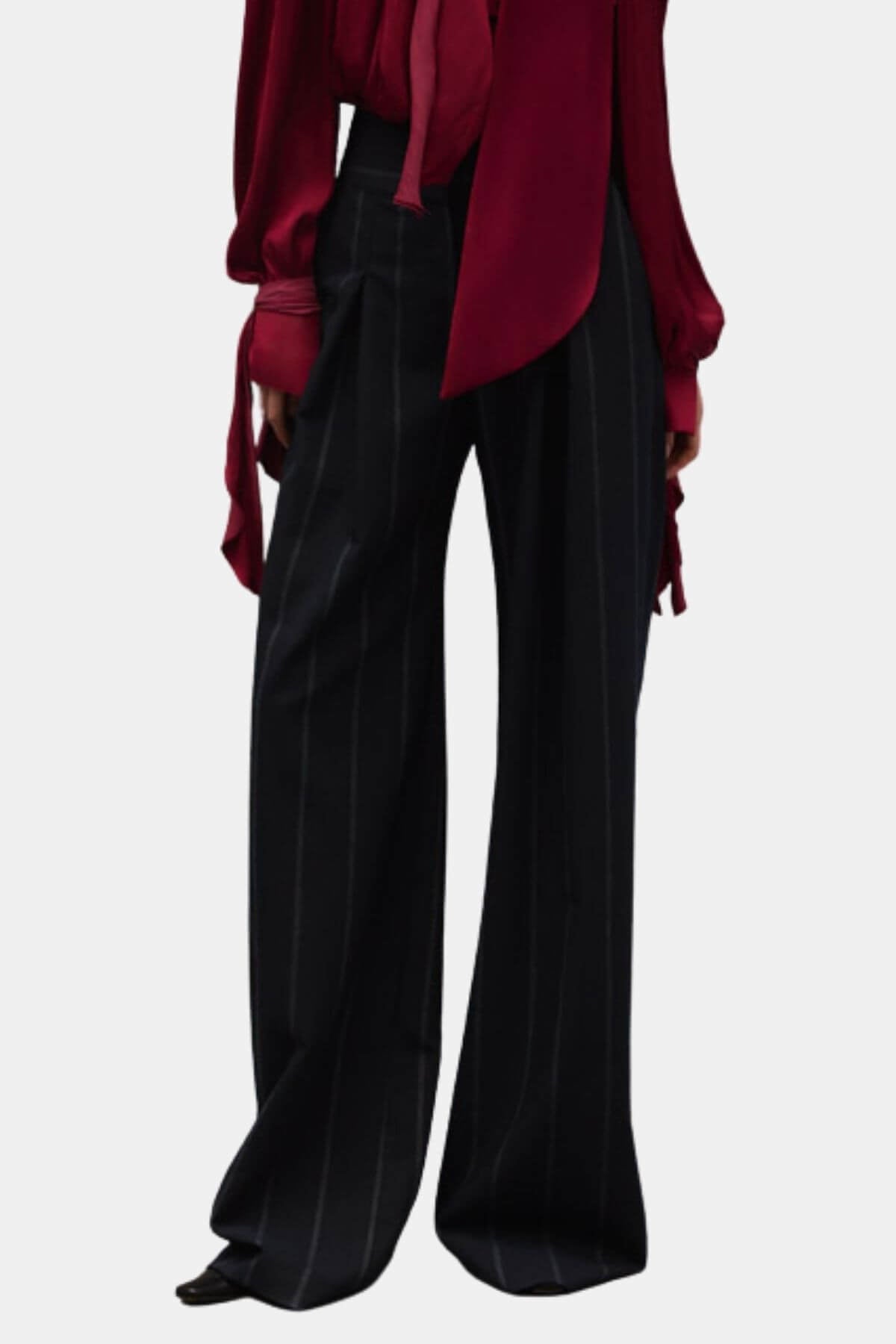 These refined pinstripe trousers bring effortless sophistication to any look. Their fluid drape and tailored structure create a striking, elongated silhouette that moves with subtle elegance.