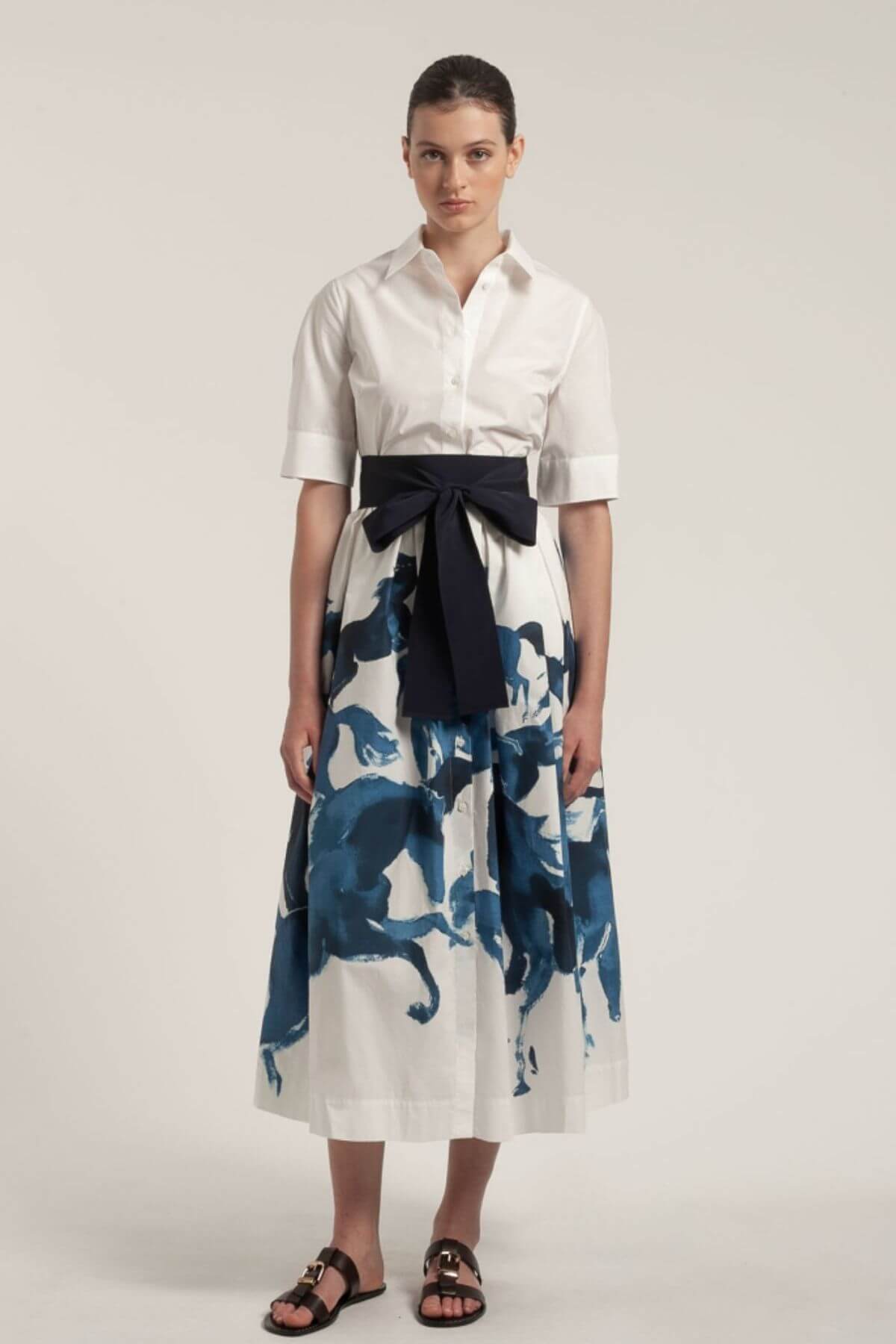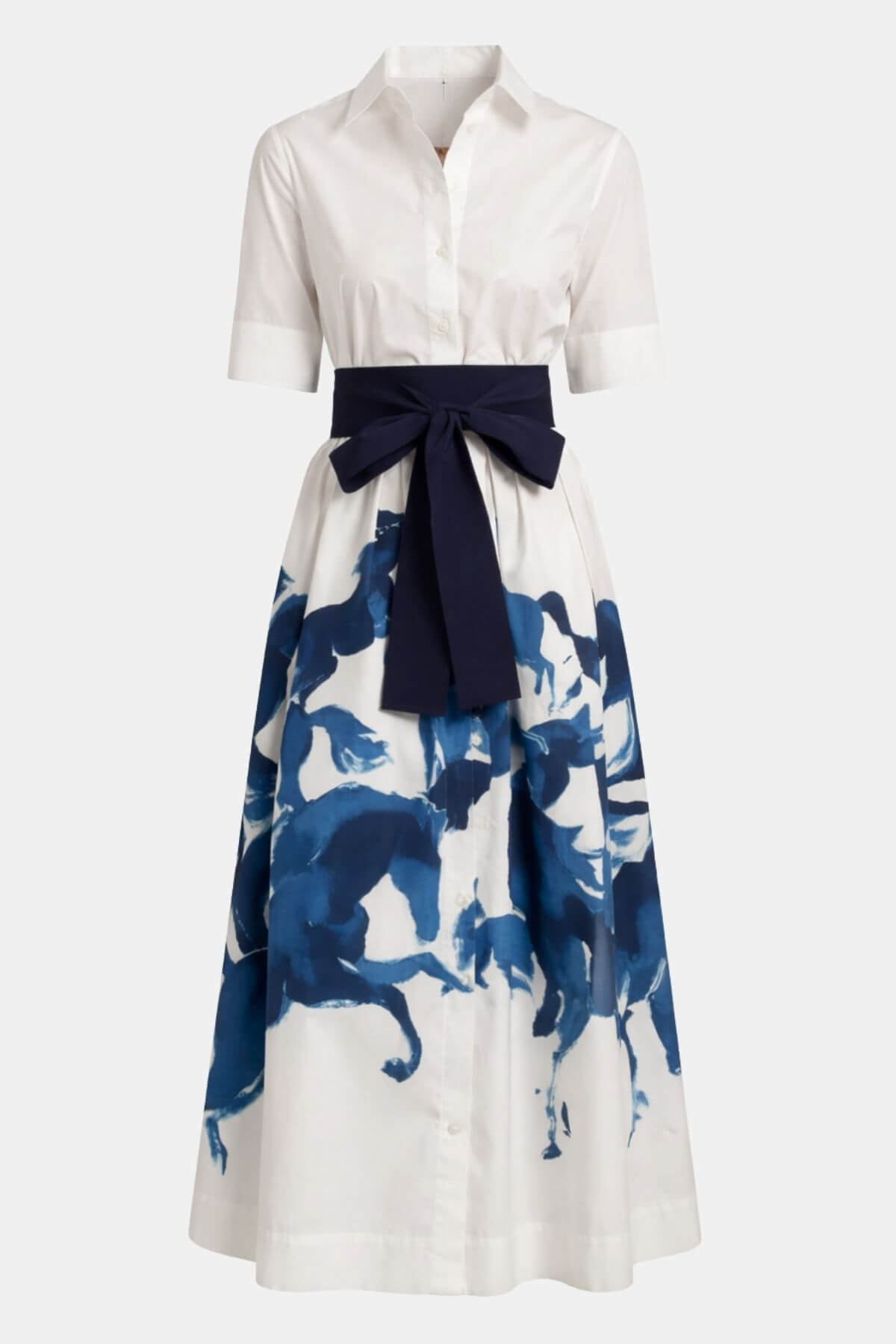 Elegant midi shirt dress with a fitted bodice and a softly flared skirt that creates a flattering, feminine silhouette. Designed with a classic collar, short sleeves, and button closure down the front for a clean and structured look. The wide waist belt enhances the shape and defines the waist, while the statement horse print adds a refined and modern touch.