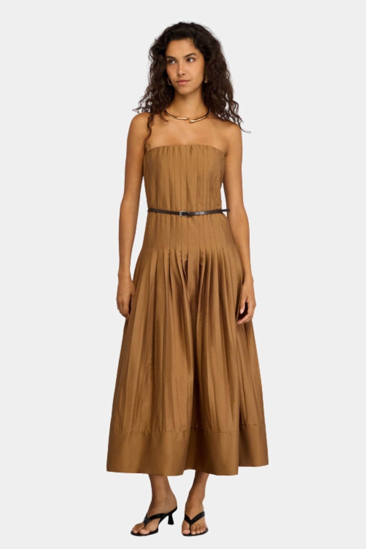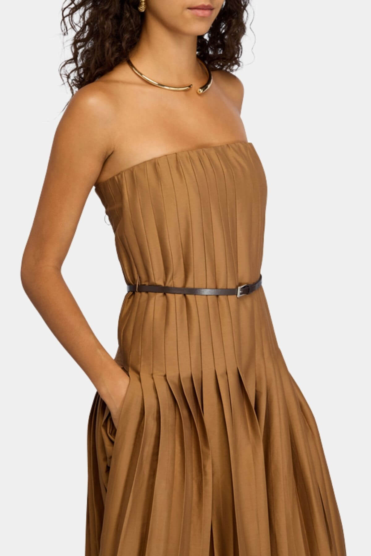 This poplin cotton dress features a regular fit with a midi-length silhouette. Designed with a bandeau neckline and soft ruching at the bodice, it flows into a pleated skirt for added movement. Finished with a slim belt to define the waist.