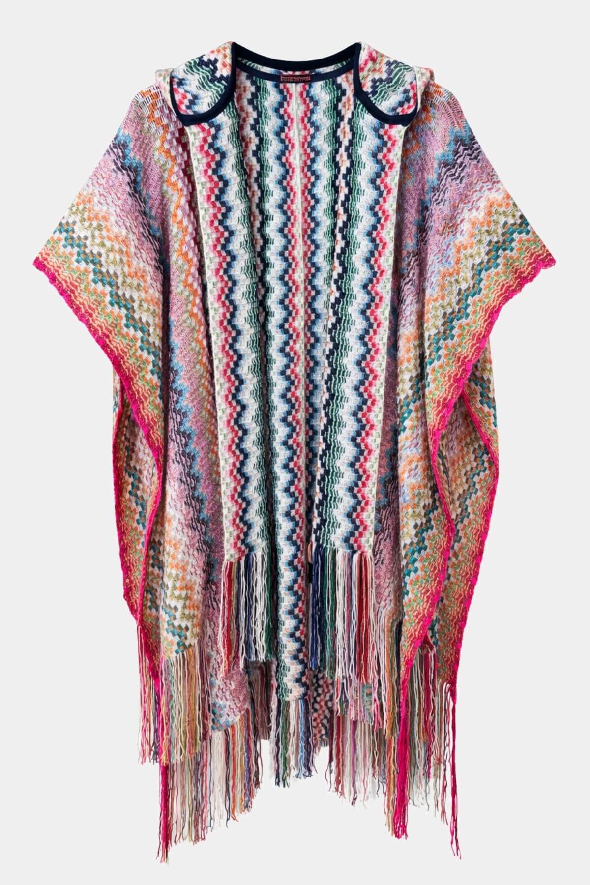 Discover effortless statement style with this Missoni poncho, crafted in the house’s iconic multicolour zigzag design. Woven entirely with metallic threads in every shade, it shimmers beautifully from every angle, creating a luminous, eye-catching effect. The relaxed silhouette and fluid drape enhance its striking texture, making it a bold yet elegant layering piece for both day and evening wear.