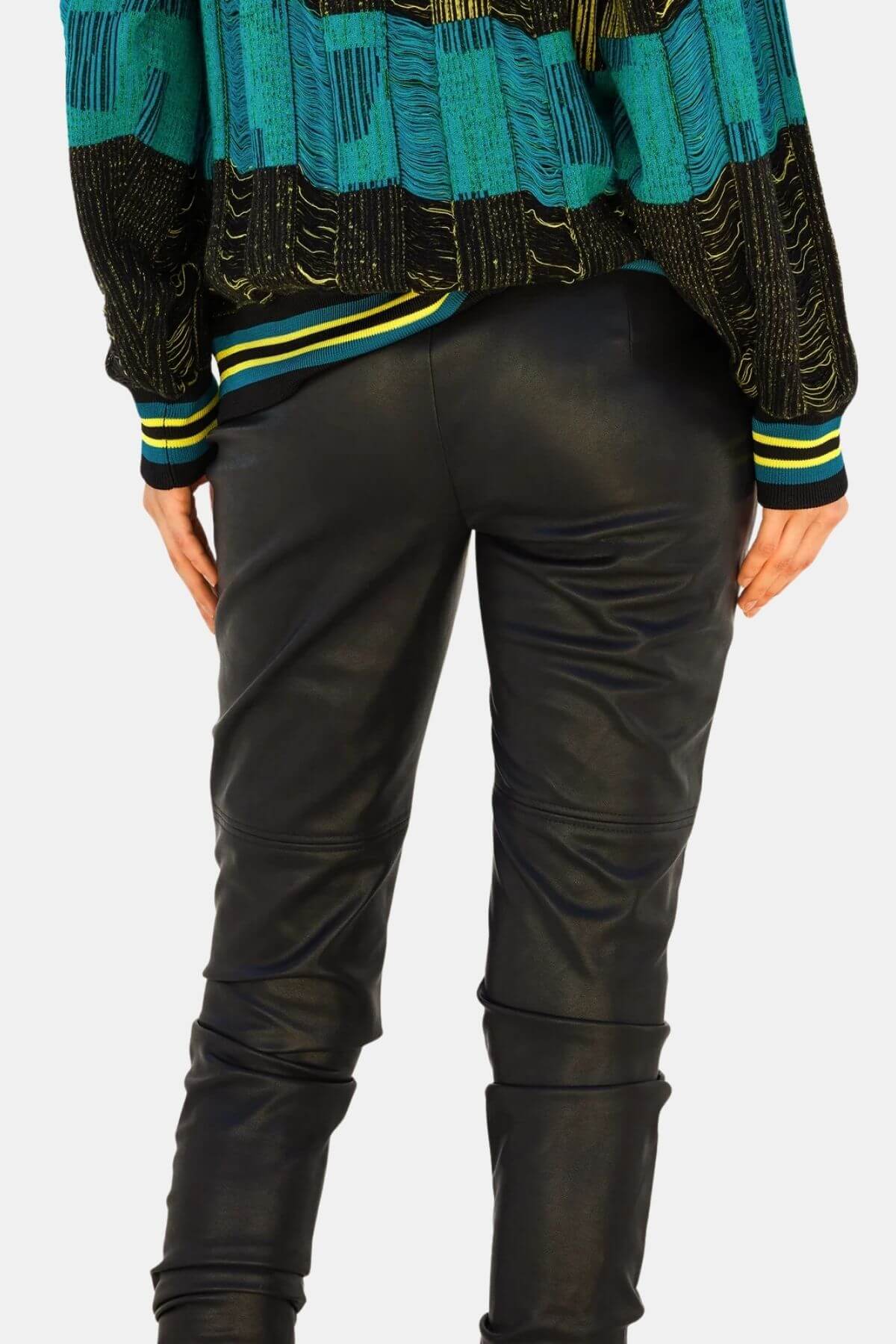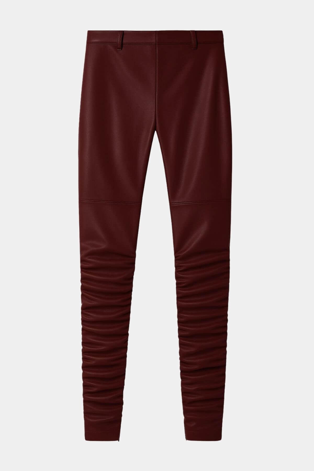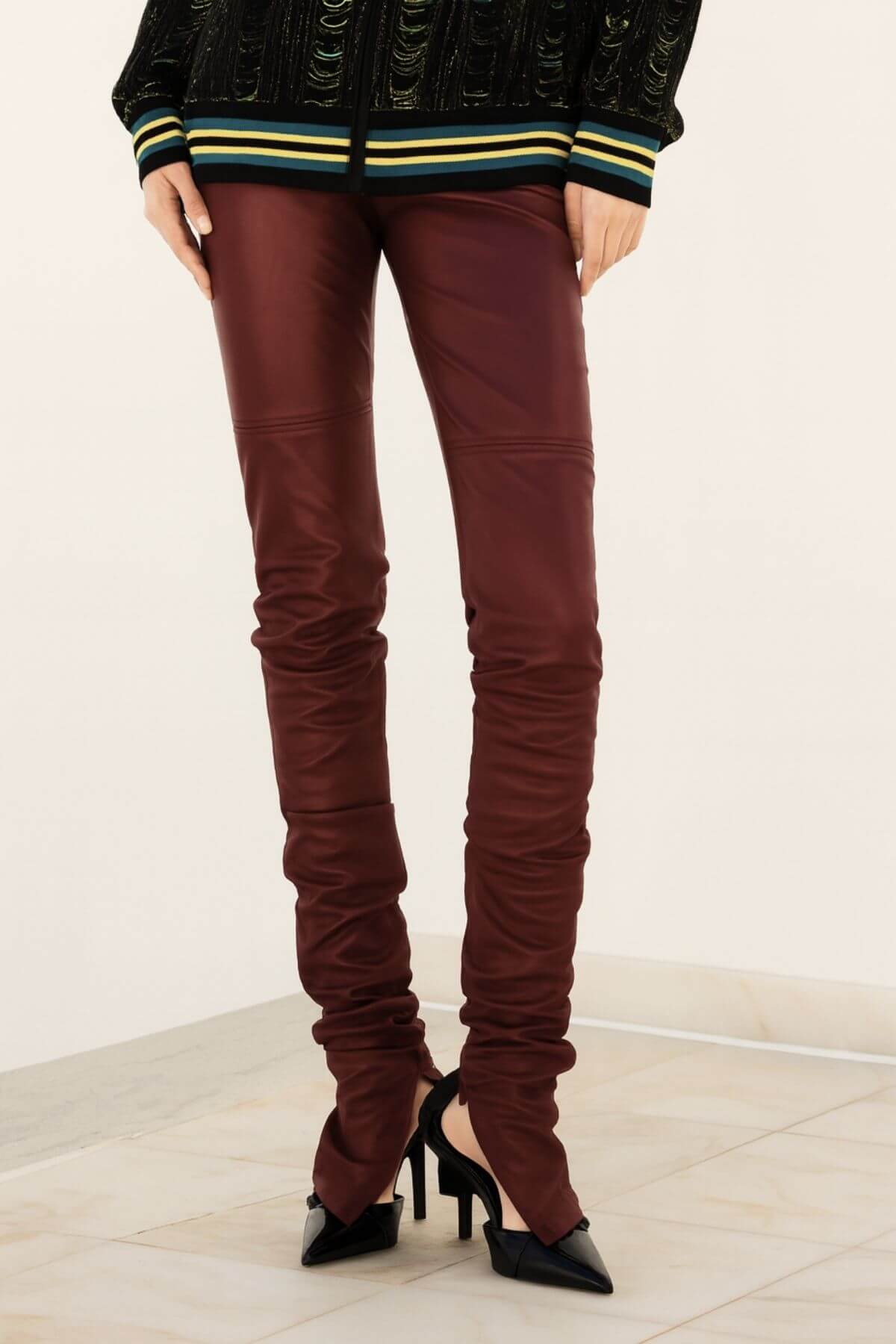 Ultra-long, close-fitting leggings in black stretch faux leather, designed to feel like a second skin. Their deliberately excessive length creates elegant pleating at the bottom of the leg, for a elongated and stylish effect. An interior zipped slit allows the bottom of the model to be opened to fit around the shoe. Elastic waistband for optimal comfort. A bold and contemporary piece, to be combined with oversized shapes or more formal pieces.
