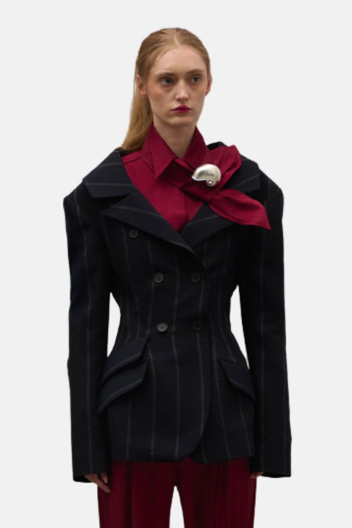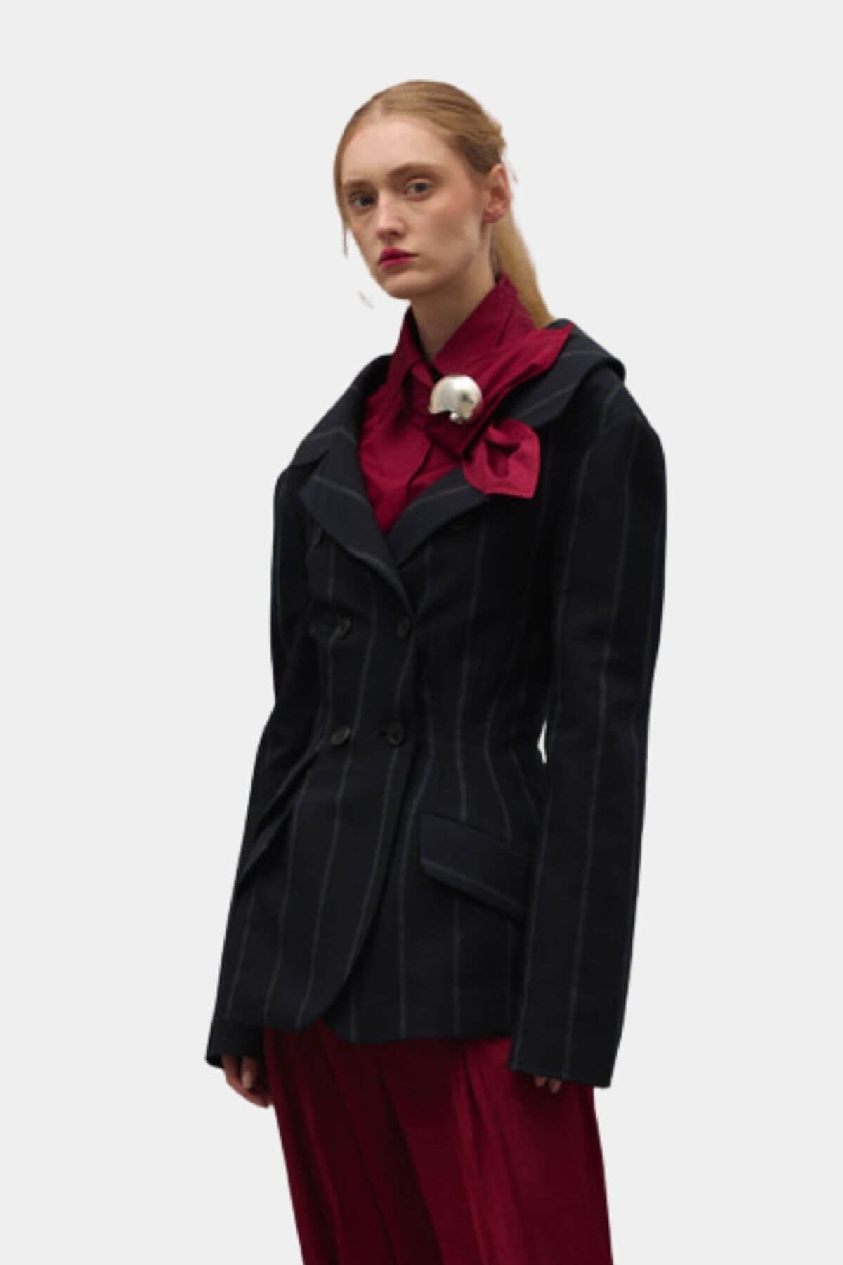 Elevate your tailoring with this sculpted pinstripe blazer, designed to create a powerful yet feminine silhouette. Its structured shoulders, contoured waist and refined detailing bring a sense of modern elegance and quiet seduction.