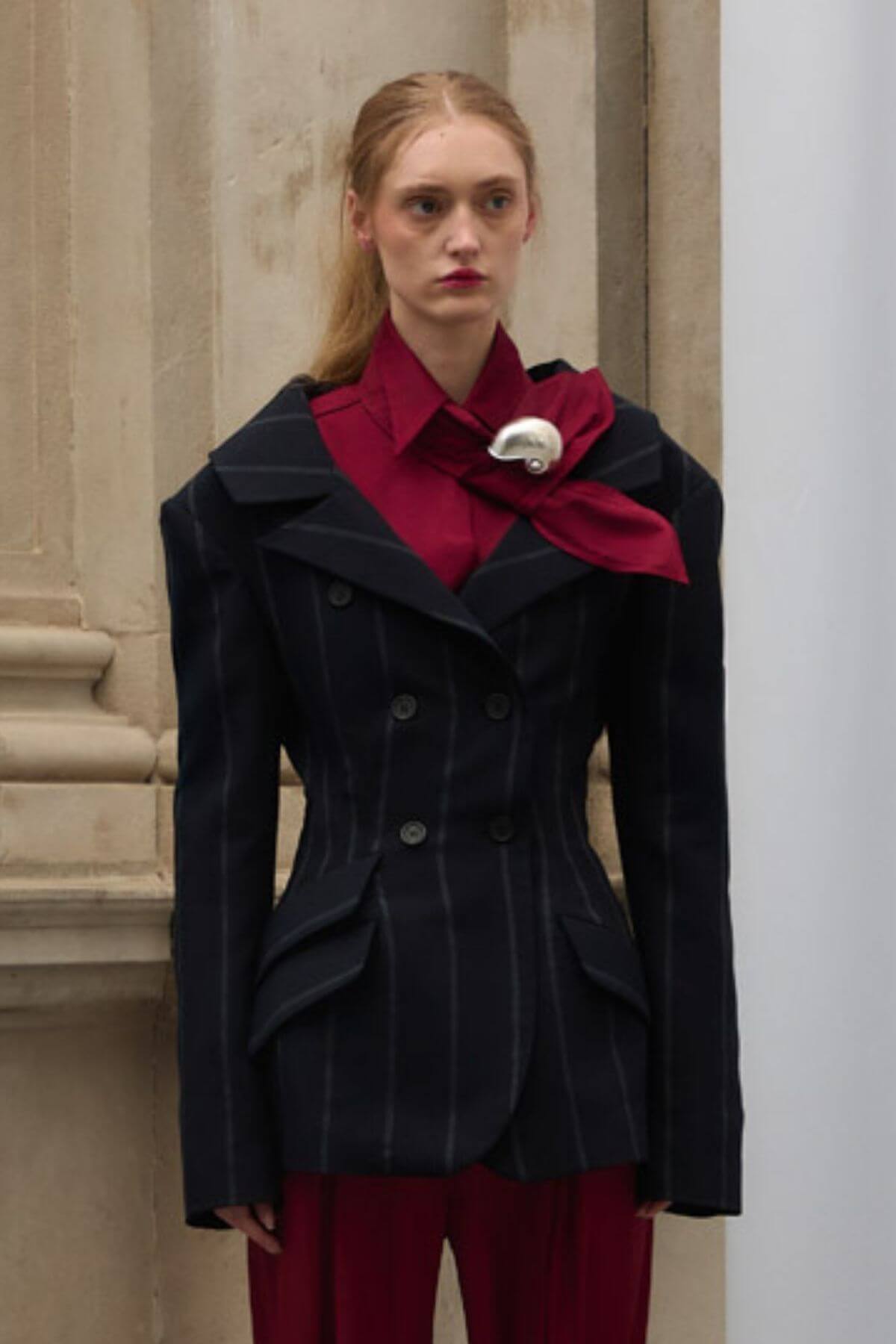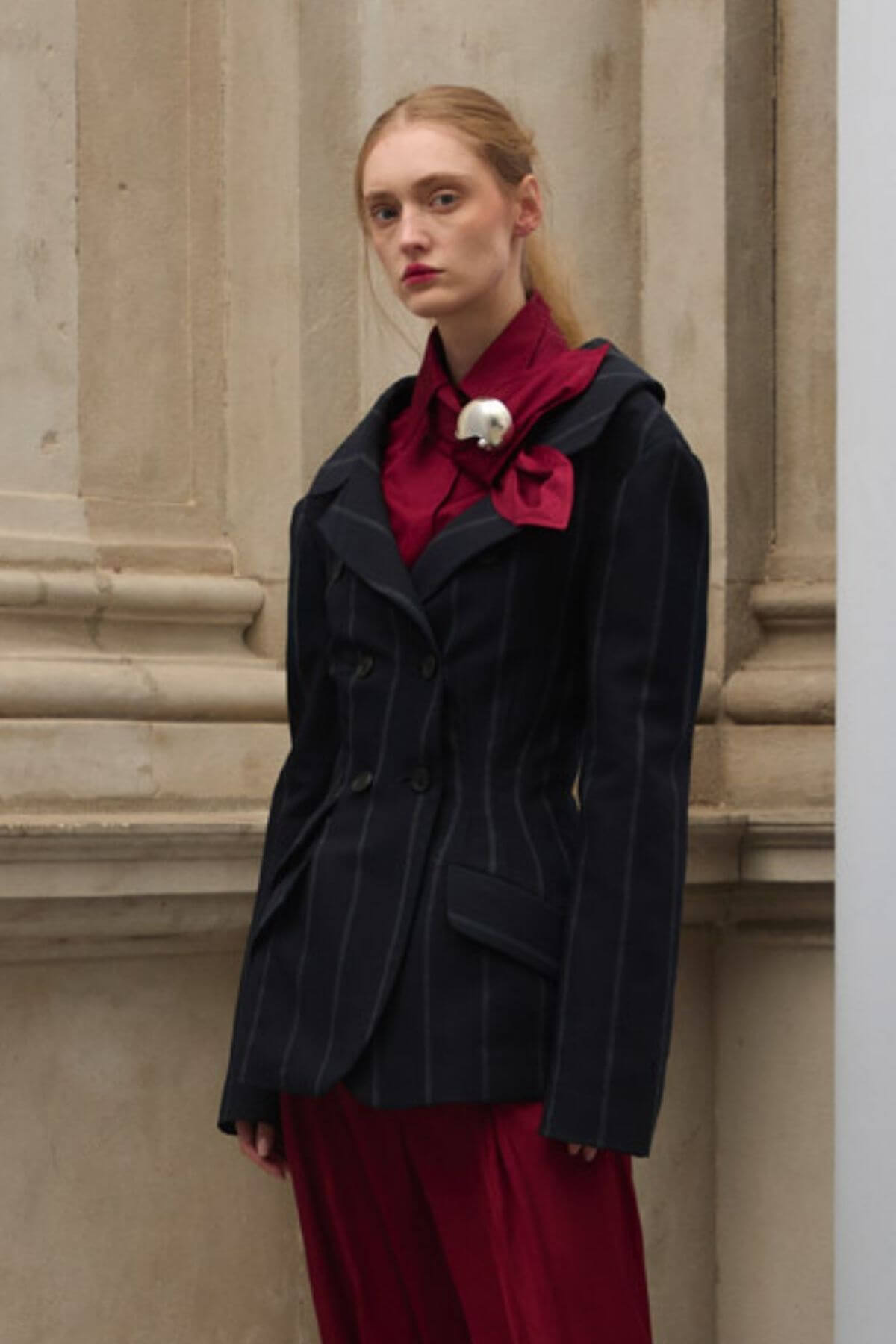 A statement blazer that blends precision tailoring with artistic sophistication.