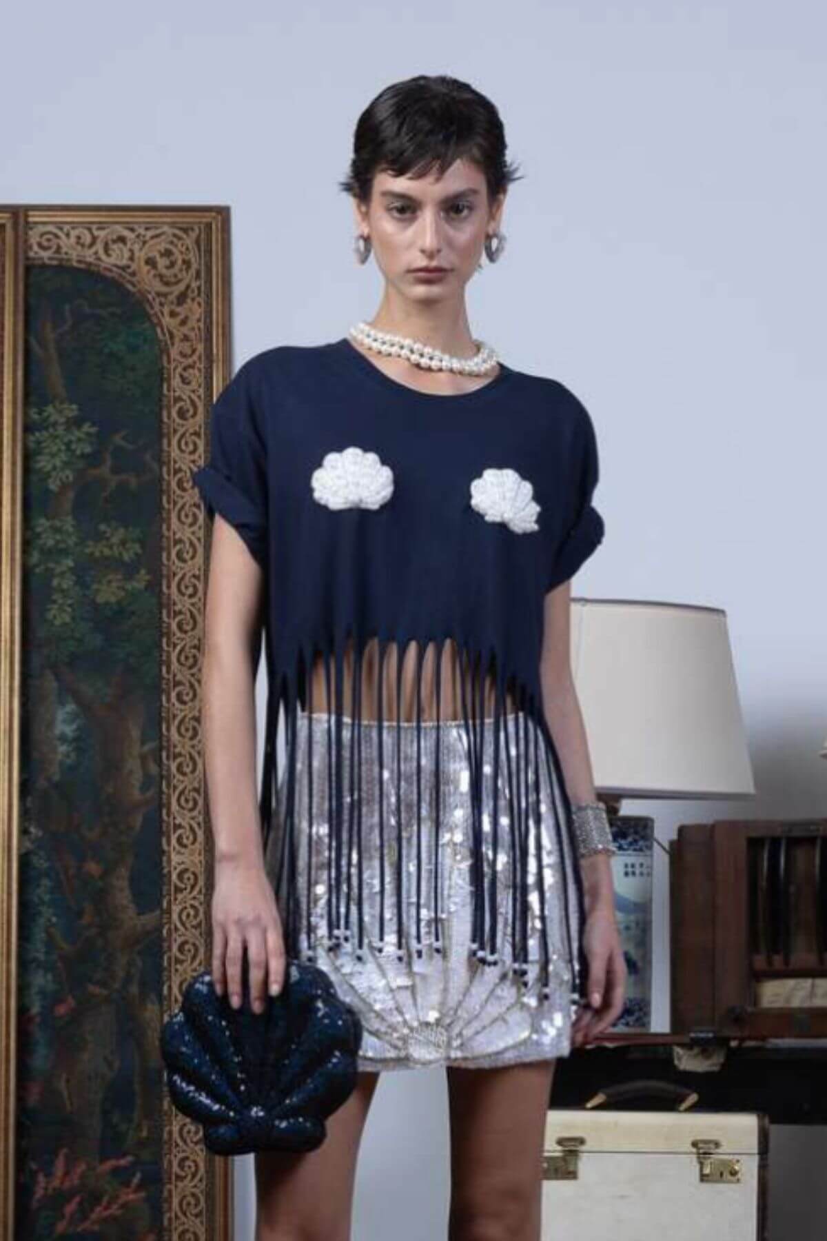 This trendy T-shirt features a relaxed fit with playful fringe detailing for a unique, eye-catching look. Decorated with delicate shell embellishments, it adds a subtle coastal touch. Perfect for casual styling with a fun and stylish twist.