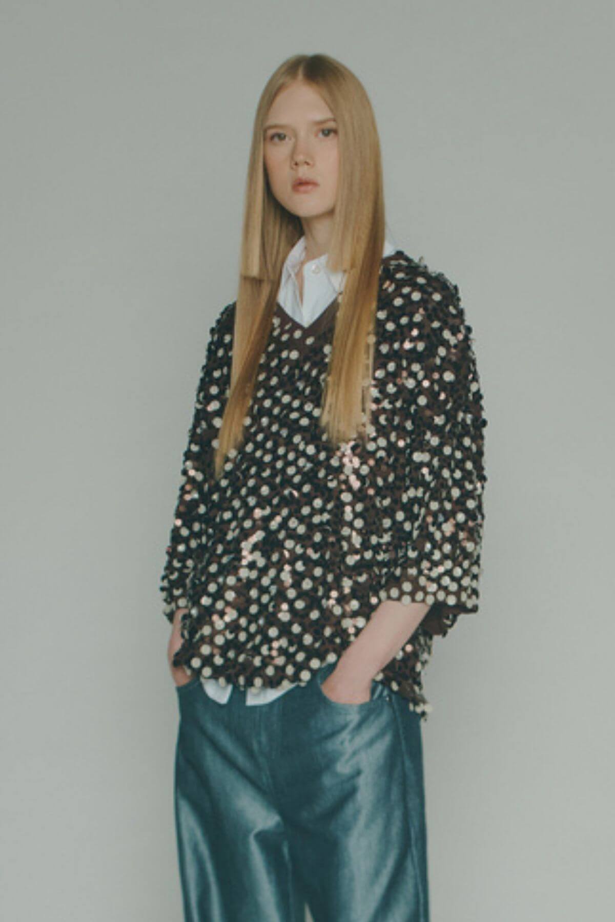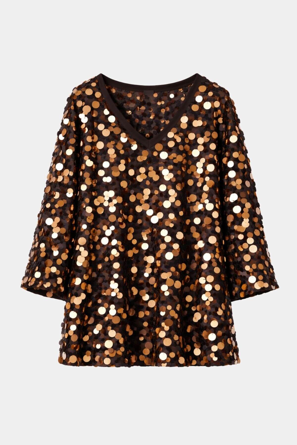 A relaxed-fit top designed with a flattering V-neckline and wide three-quarter sleeves. Covered in oversized sequins in warm amber and bronze tones, it delivers a bold shimmer while maintaining an easy, fluid silhouette.