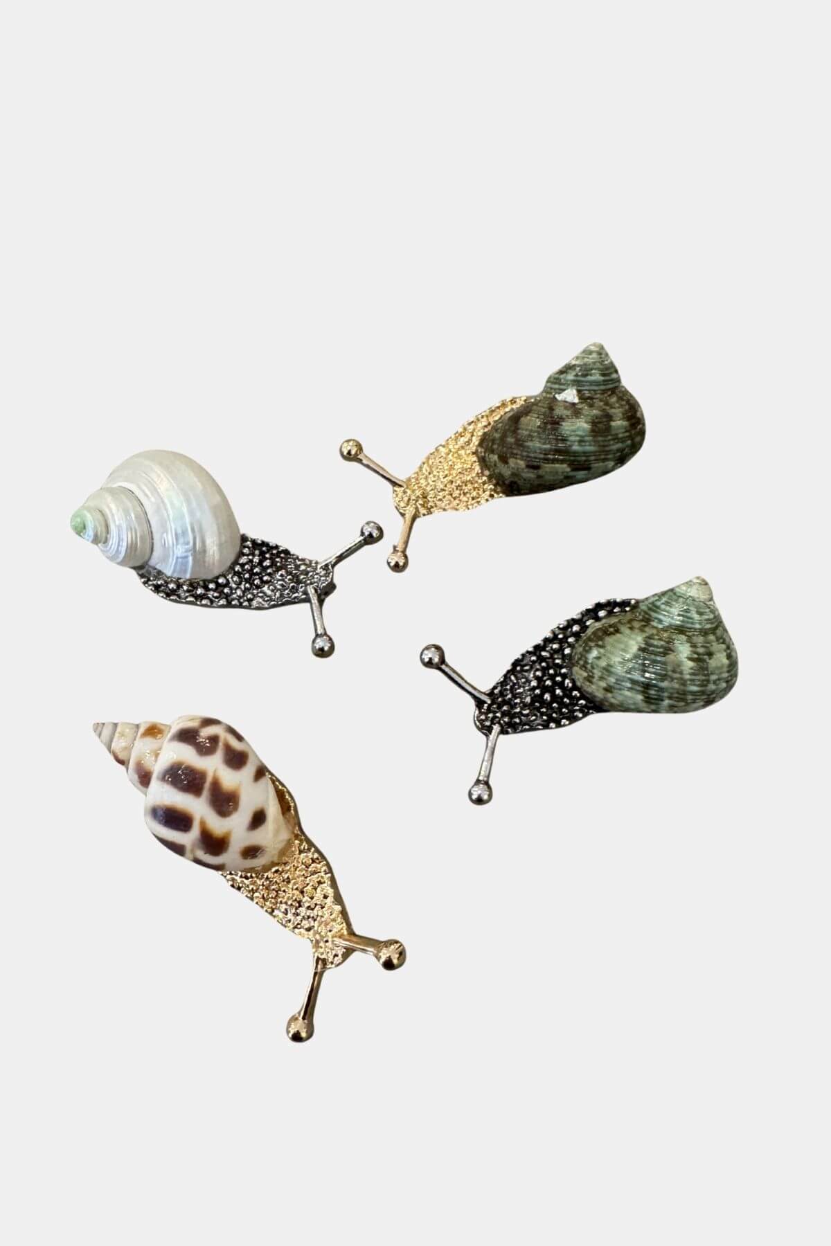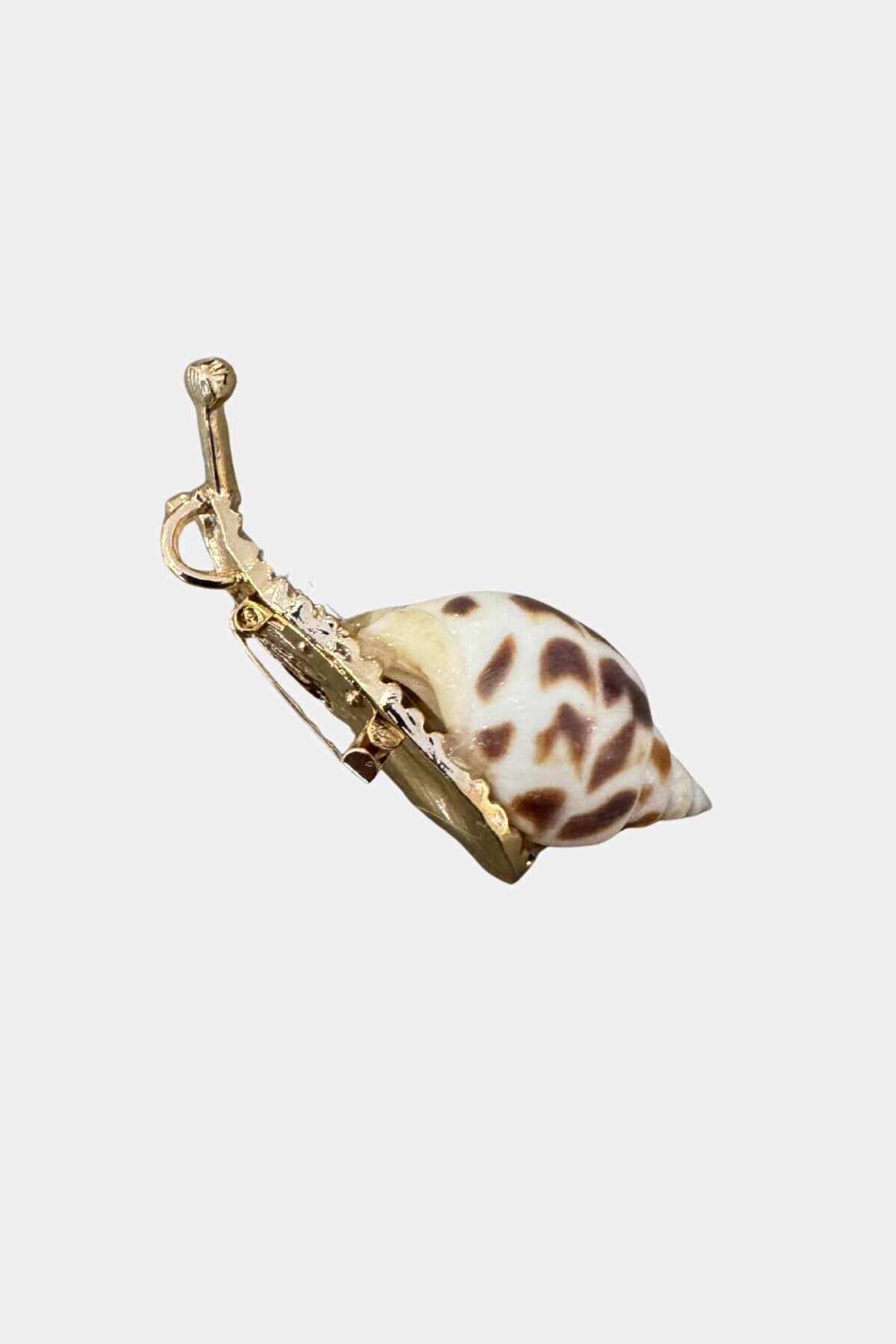 Unique snail-inspired jewelry piece made with a real seashell. This versatile design can be worn both as a brooch and as a pendant. Measuring approx. 6 cm in length, it stands out with its organic shape and detailed metal finish. As each shell is natural, no two pieces are exactly alike – making every item truly one of a kind.