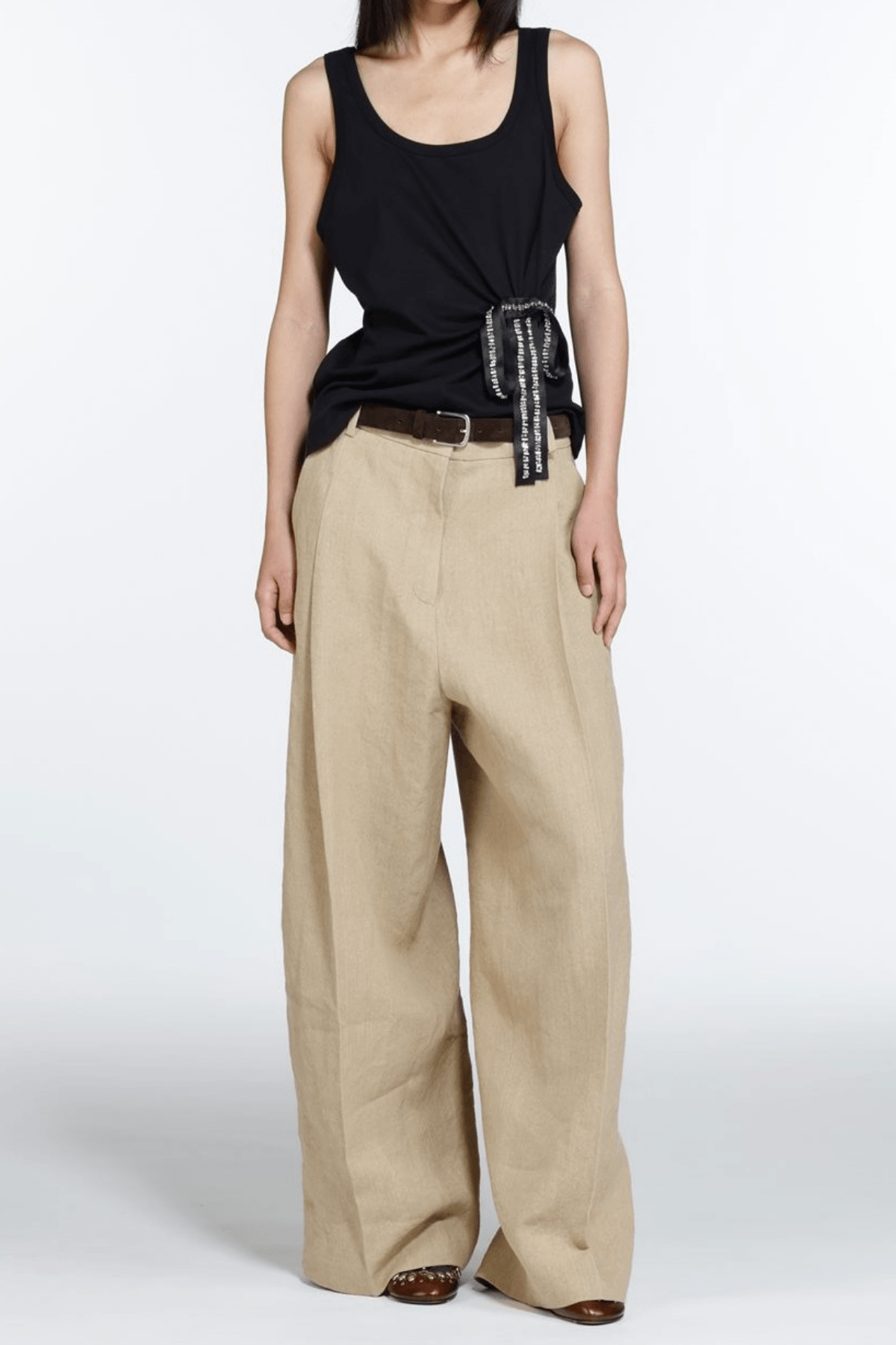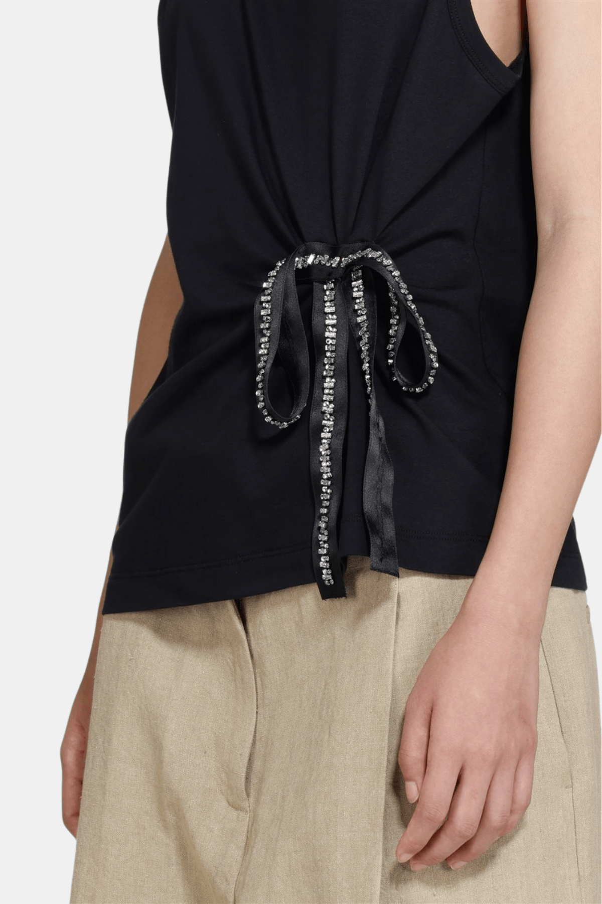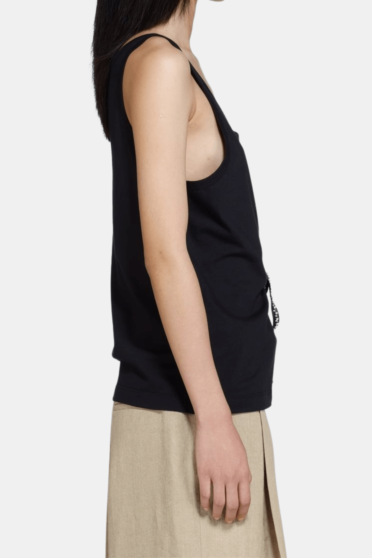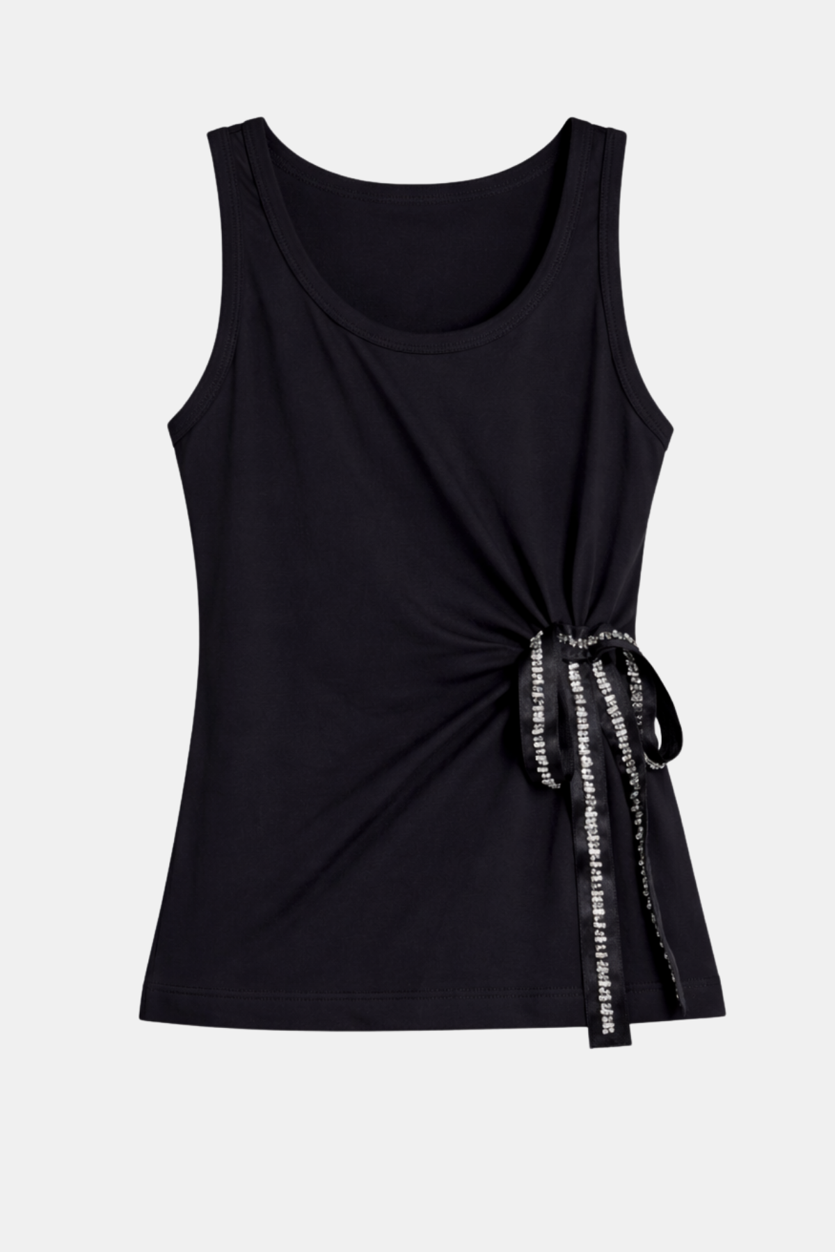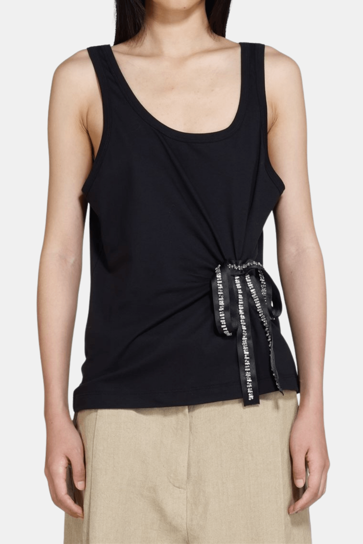A soft and lightweight tank top designed in a clean, minimal silhouette. Featuring a round neckline and a subtle side tie detail with decorative ribbons, it adds a refined touch to an everyday essential. Comfortable to wear and easy to style for both casual and dressed-up looks.